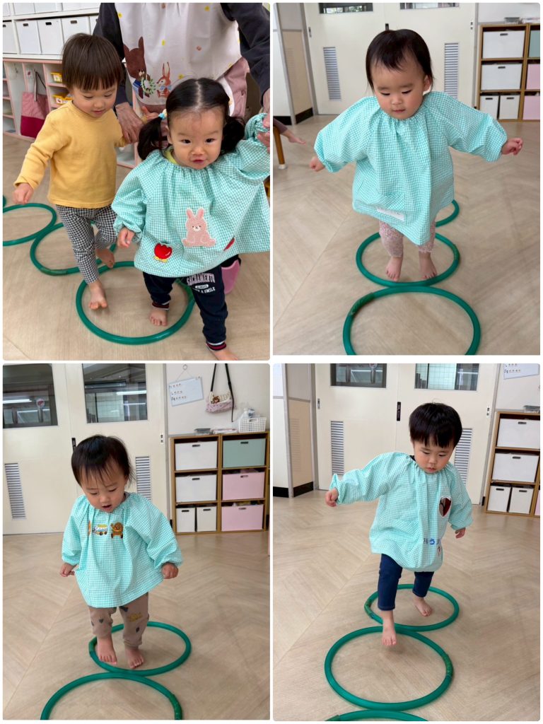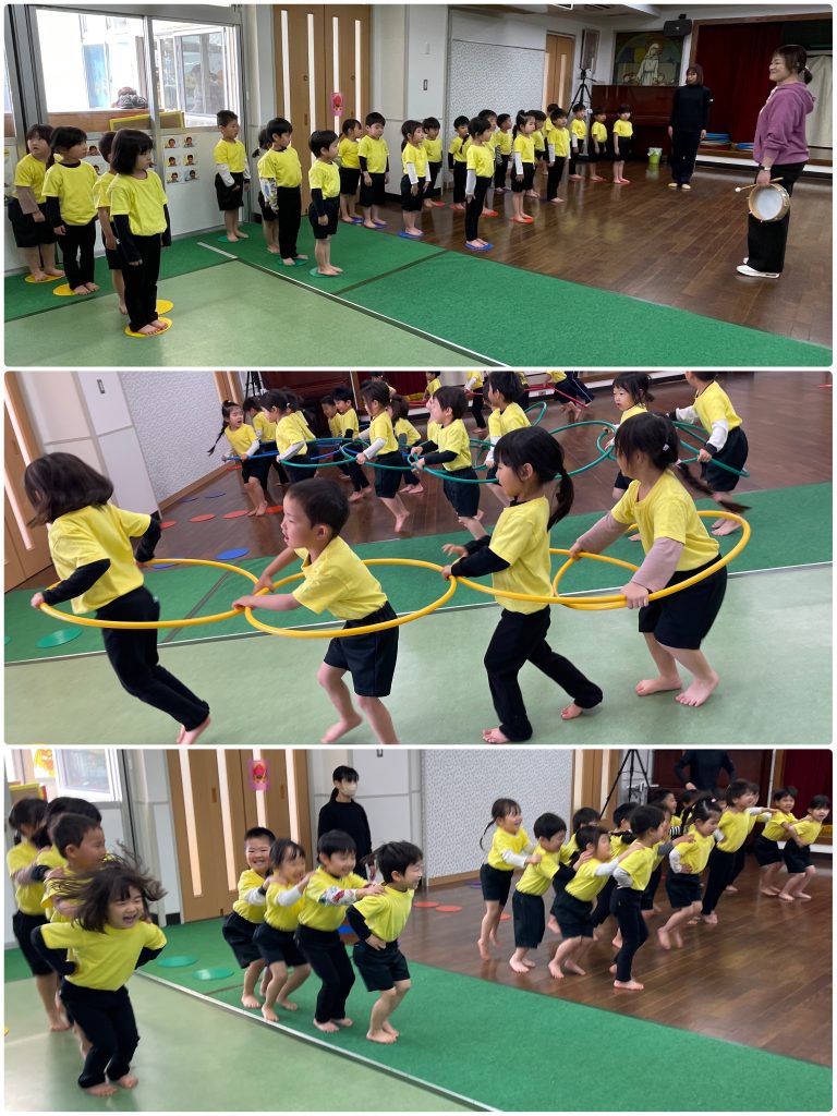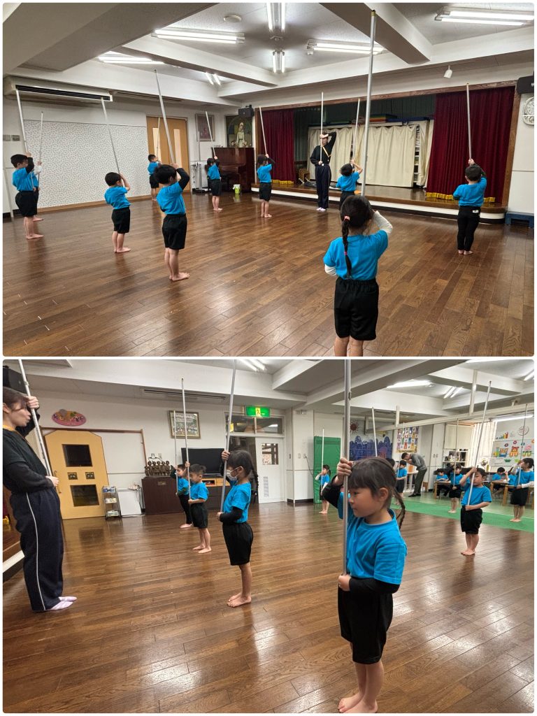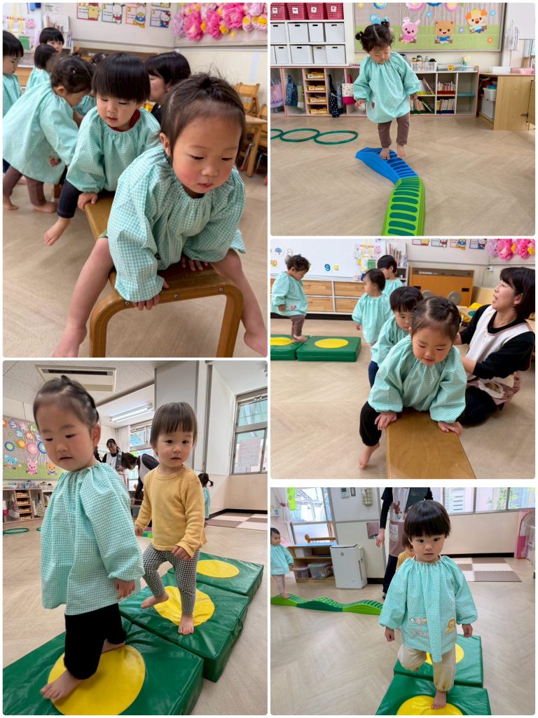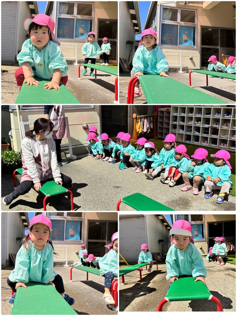水曜日はアトムの日、3歳以上児クラスはクラスTシャツと園ズボンで登園します。たんぽぽ組は愛先生と活動しました。ふじ組はサーキット運動、跳んだり・バランスをとって歩いたり・手で椅子渡りの違う運動をを連続で行います。もも組は跳び箱の基礎運動の椅子渡りを行いました。腹筋・腕の力・握る力が強化します。まつ組はガード&フラッグの基礎を用具を使って行いました。