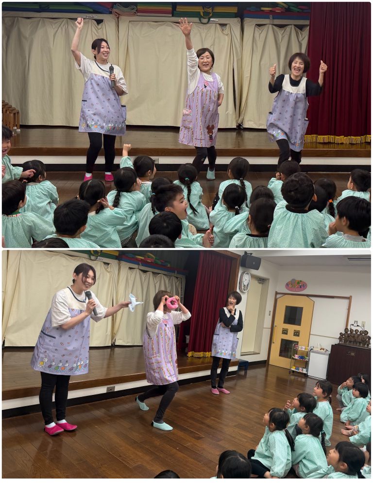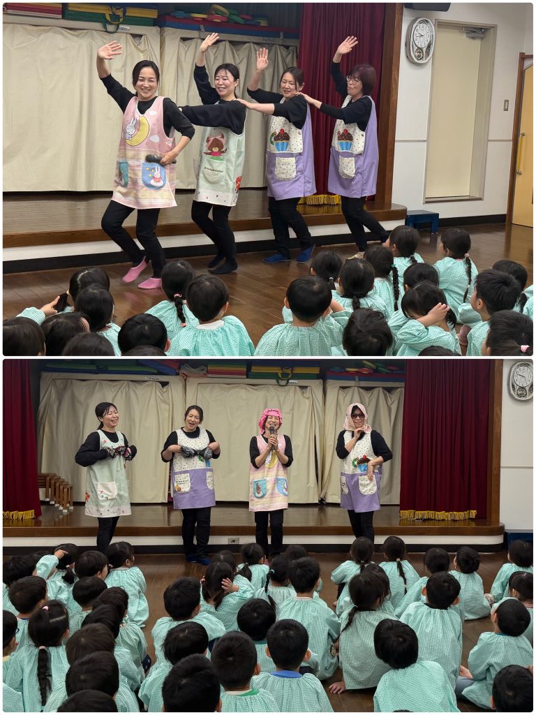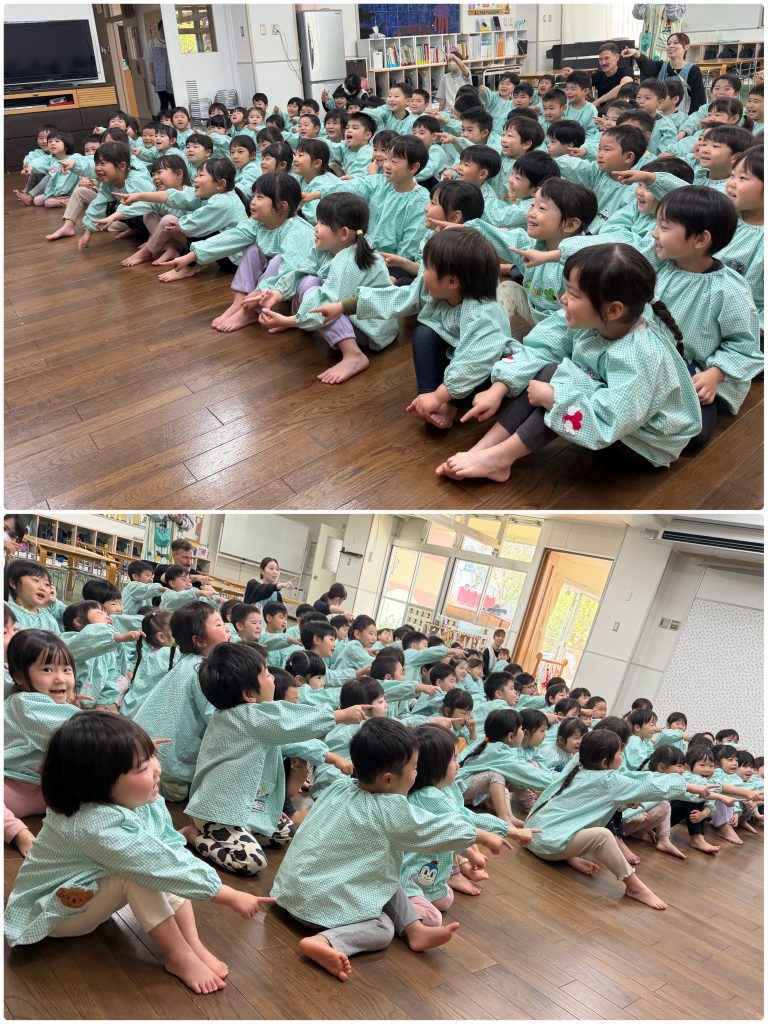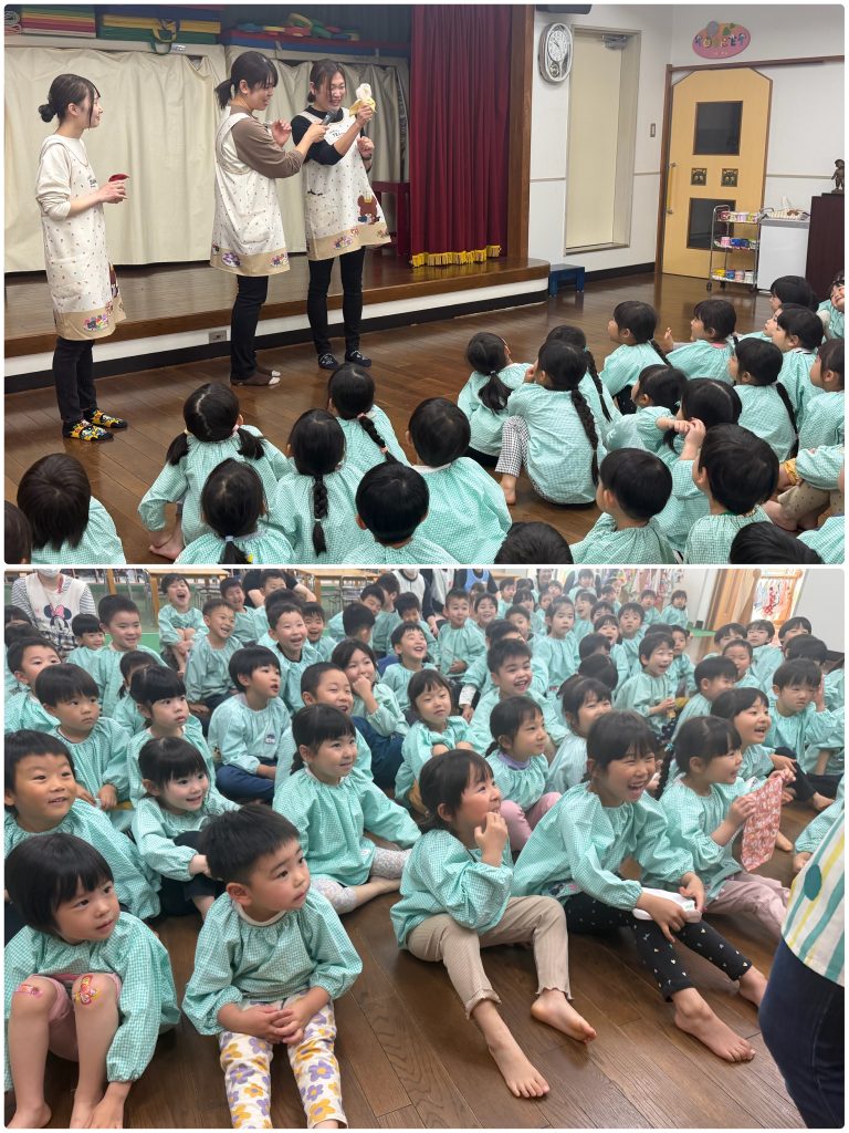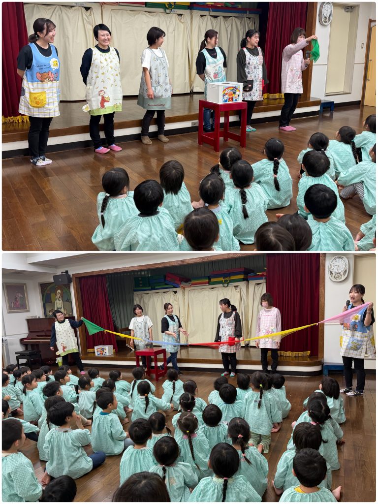 先日火曜日の全体朝の会は第二回ハンカチ遊びで、未満児クラスの先生紹介です。音楽に乗ってファッションショーや、マジックも登場です。給食の先生はハンカチで果物を作りました。ハンカチでいろんな楽しいことができますよ、お家でもハンカチでたのしんでみて下さい。