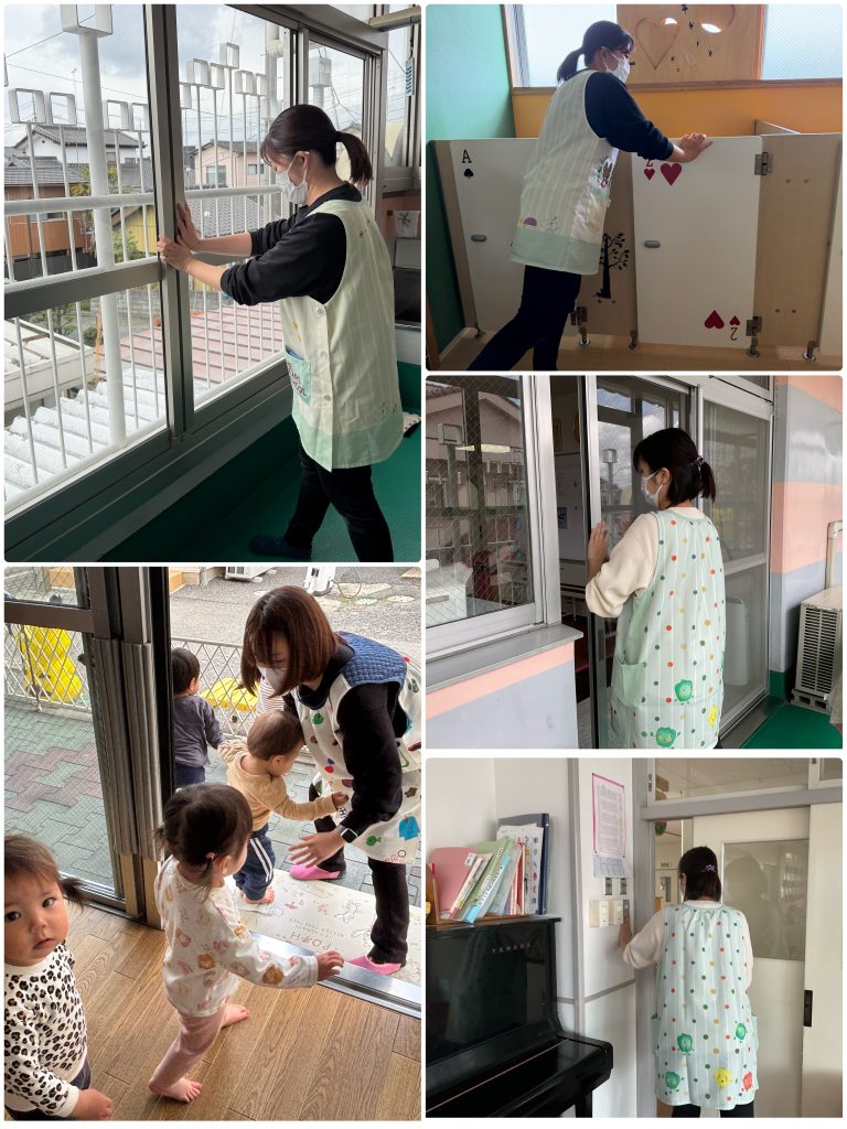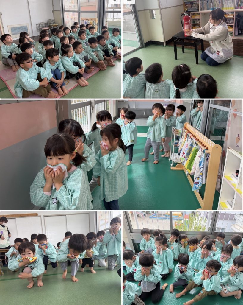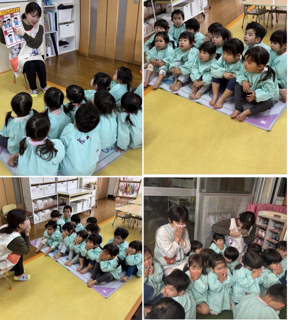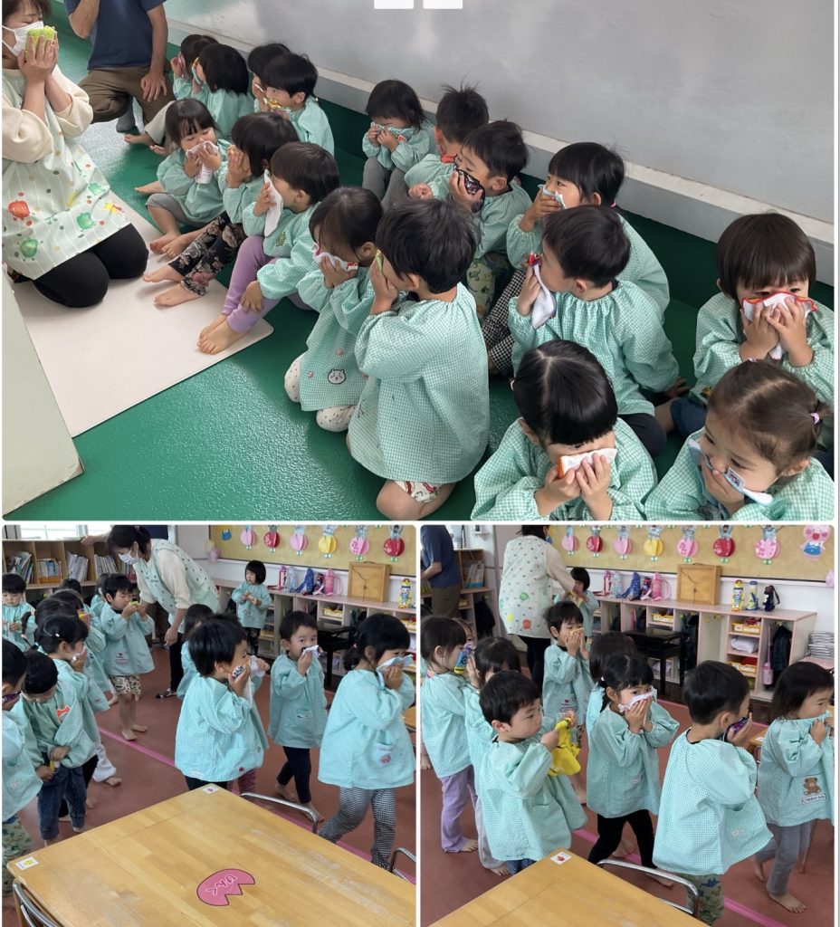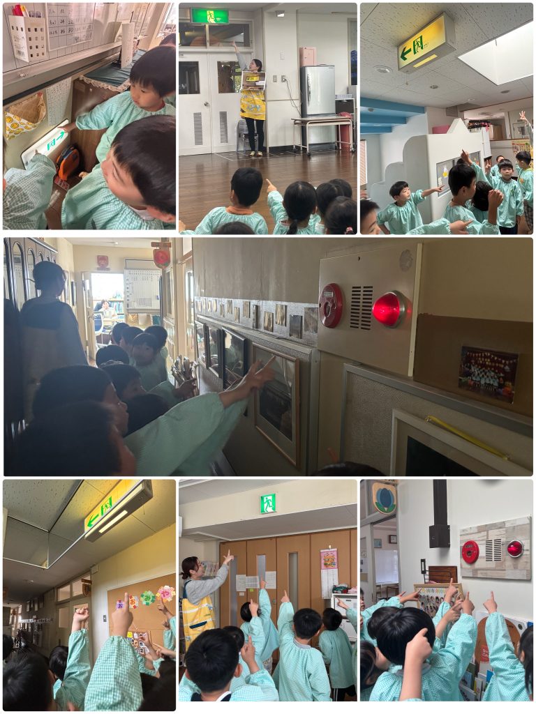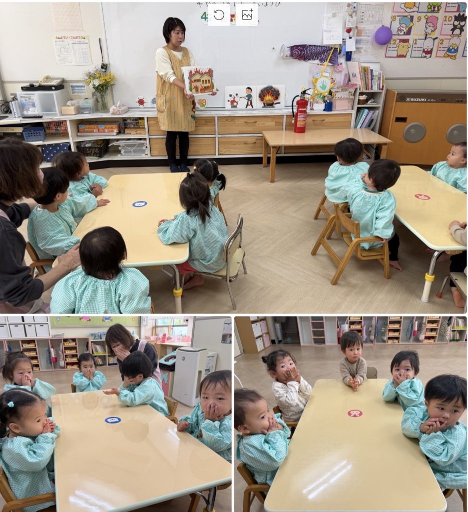 令和8年度になって初めての避難訓練です。初めての教室で非常ベルが鳴ったらどう動くか、火事の紙芝居を見て、非常ベルを聞いて、今日は火事の場合は煙を吸わないようにして、まずは教室から出る練習をしました。まつ組は園内の非常口・非常ベルの確認をしました。先生も役割分担の確認です。ベルを聴いて子供を誘導、窓やドアをどうするかトイレに子供がいないかの役割の確認をしました。いつでもどんな時でも何が起きても冷静に動けるように、訓練を毎月行います。まずは日頃から先生の話を聞く姿勢ができているということが1番重要👂子供たちは日々の積み重ねで行っています。