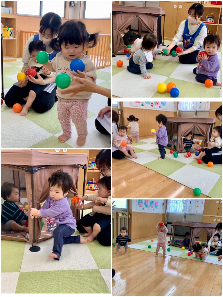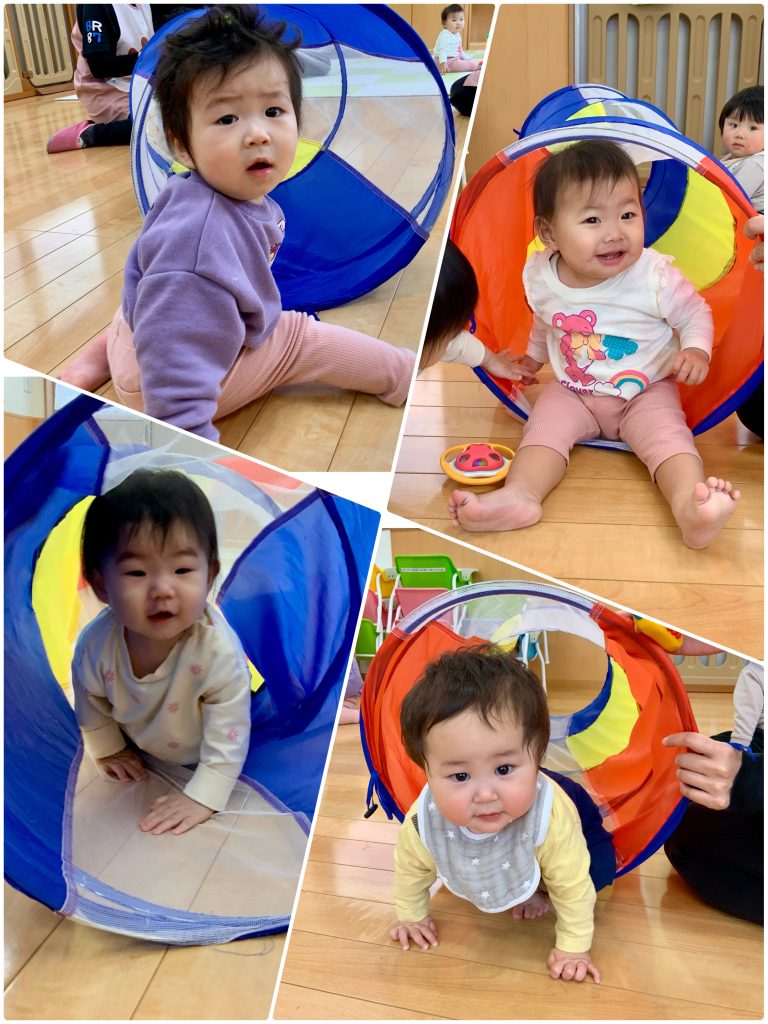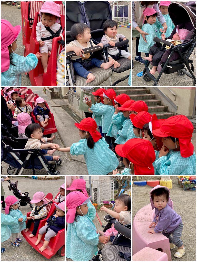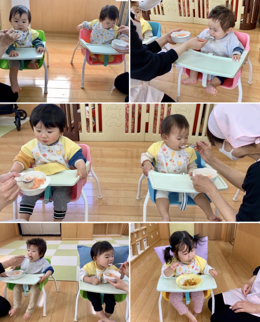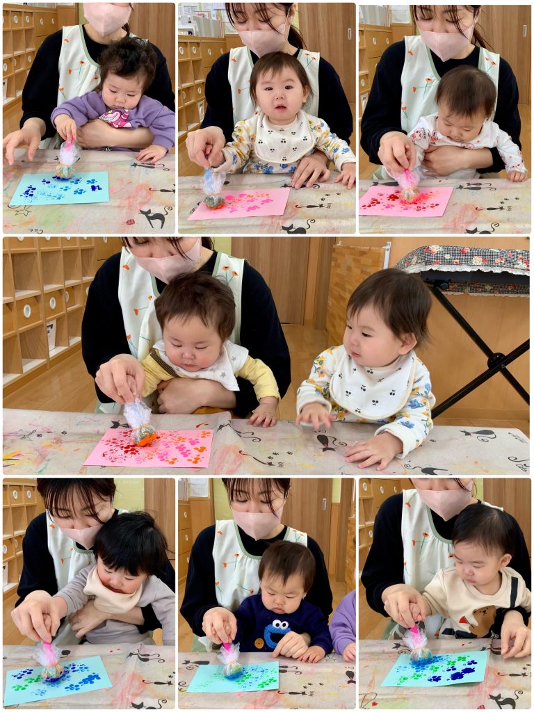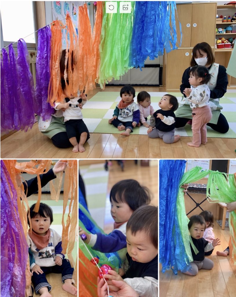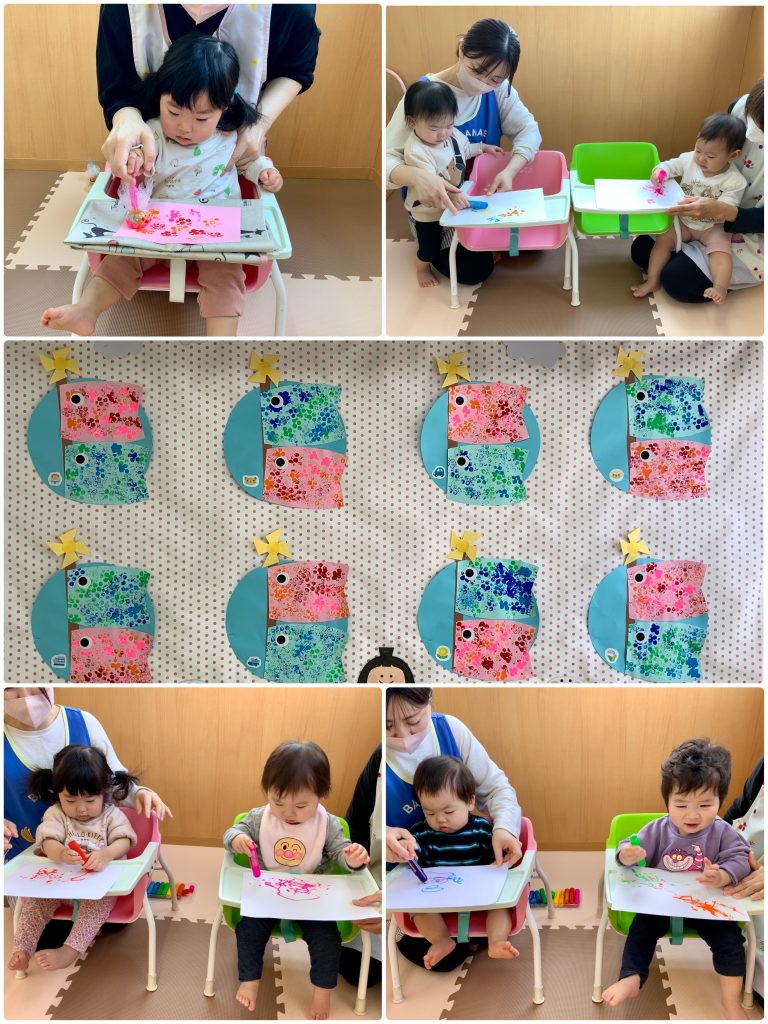 新しいお友達が4人増えたすずらん組、笑顔も見えてきて先生と穏やか過ごしています。運動場に出ると大きいクラスのお友達が「かわいいね」と手を出してくれます。お給食も先生とお話ししながらお口を開けてパクリ!月齢に合わせて食事も進めています。鯉のぼり製作もタンポでいろんな色を使って作りました。先生と一緒に初めてのことにたくさんチャレンジします。