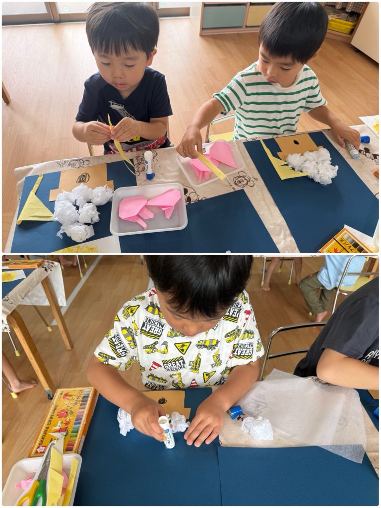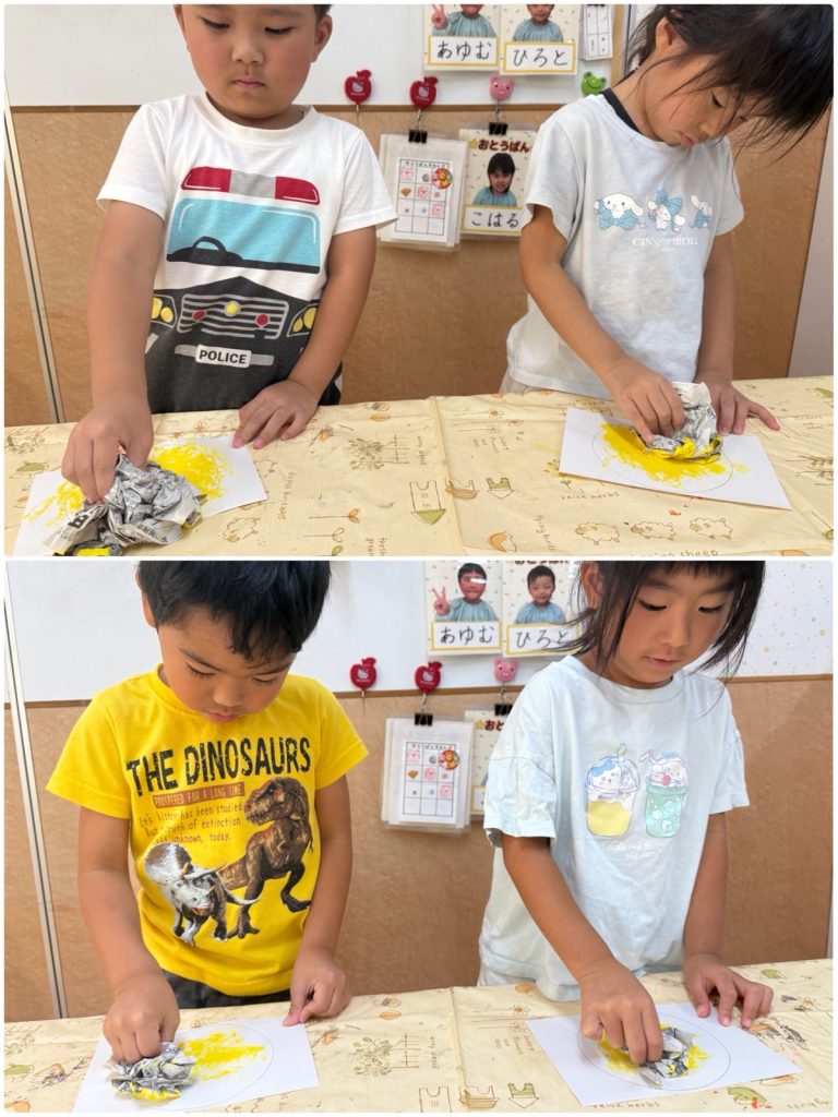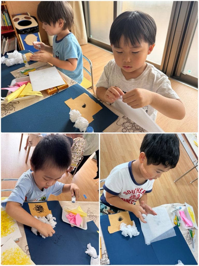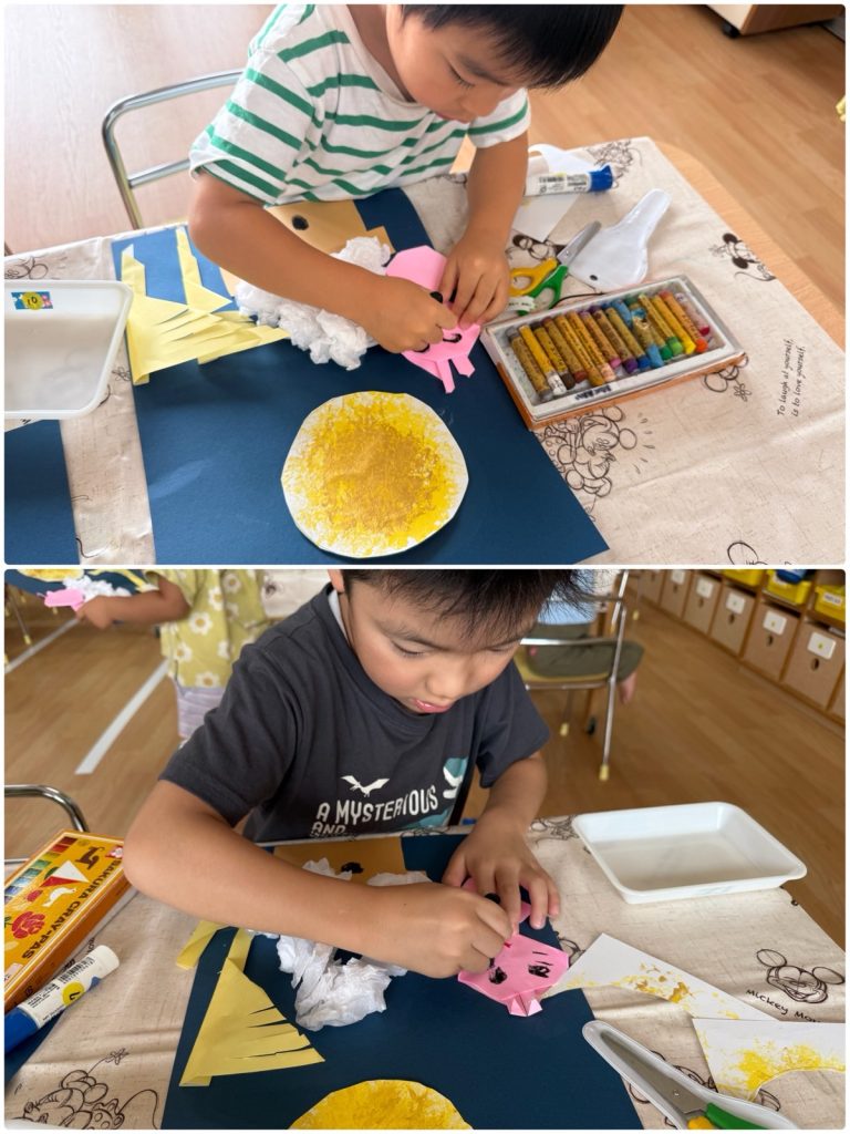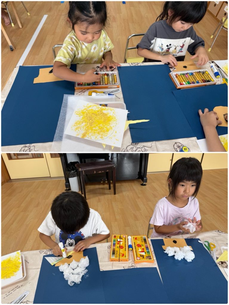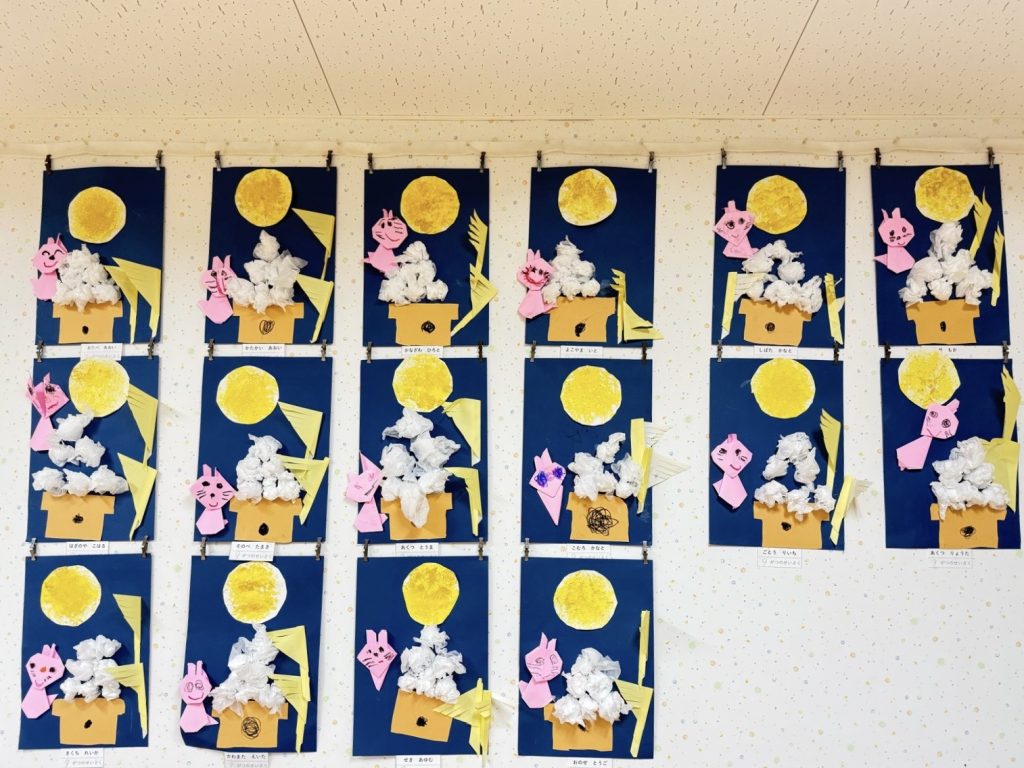 たんぽぽ組は新聞紙のスタンプでお月様のデコボコを表現しました。団子はお花紙を丸めて立体的に仕上げました🎑すすきは折り紙をハサミで切って作りました。かわいいうさぎもお月見をしています。