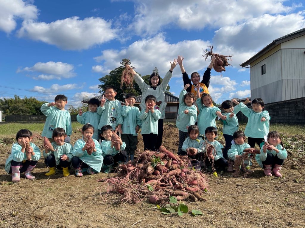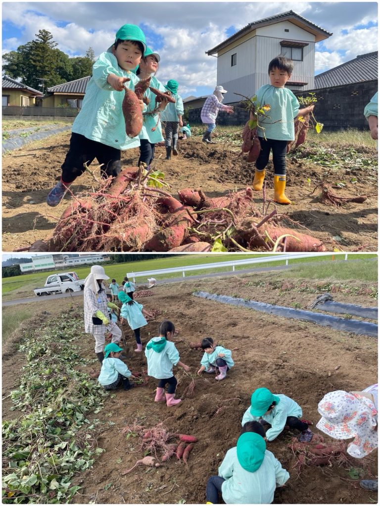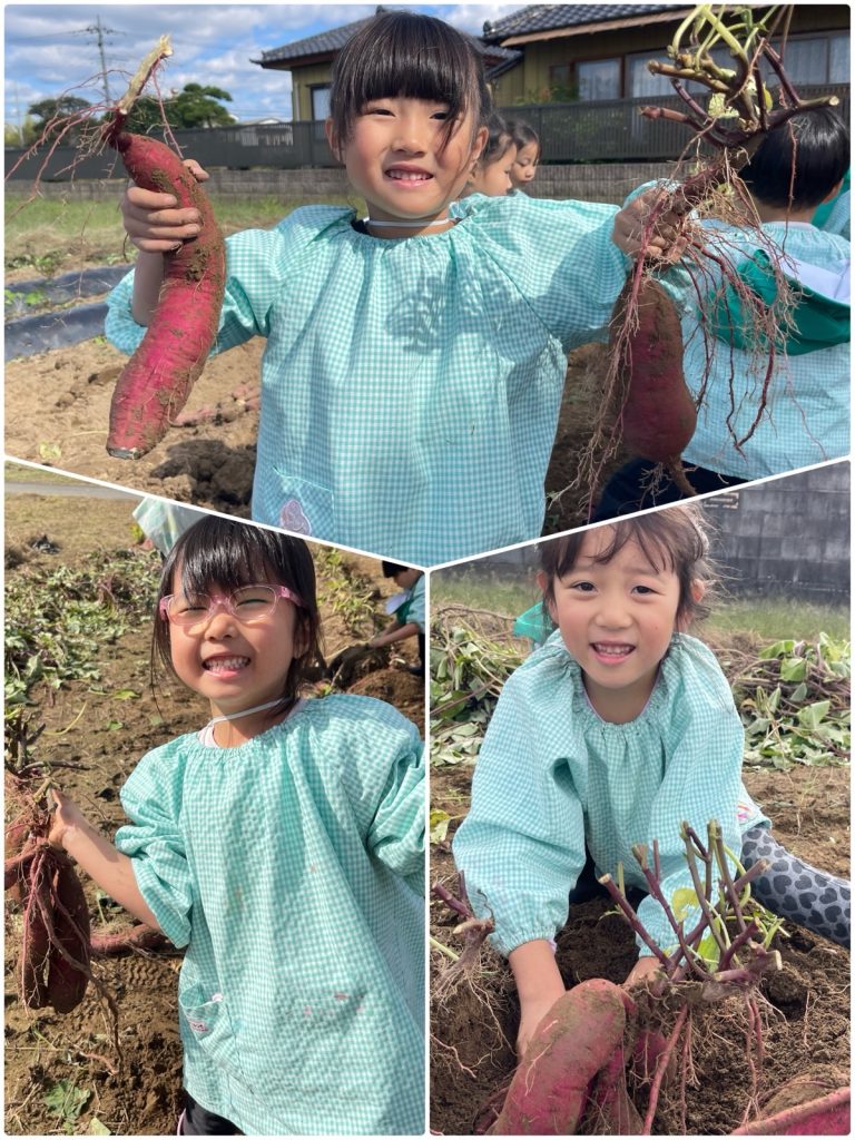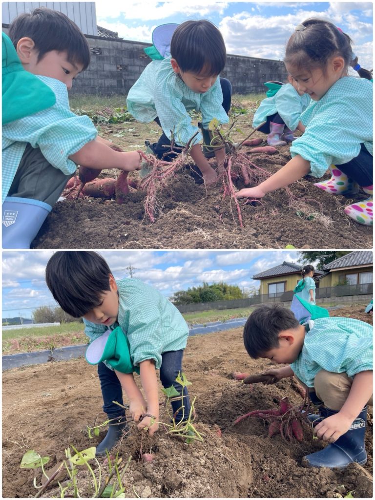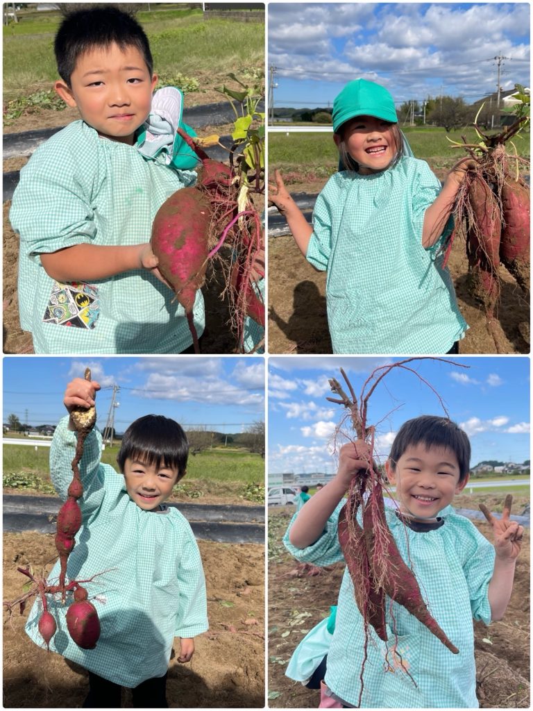 みっちゃの畑にさつま芋を掘りに行ってきました🚌春に植えた苗が育ち、土の中でさつま芋が大きく育っていました🍠土を掘ると、さつま芋が見えてきて、大喜び😊まわりの土を一生懸命掘って、力を入れてひっぱると、大きなお芋が出てきました。なかにはいくつもつながっているお芋が掘れた子もいました。みっちゃんのふかし芋はとても美味しかったよ😆お芋をお持ち帰りしたので、おうちで美味しく食べてね🍠みっちゃん美味しいお芋ありがとう😊💕