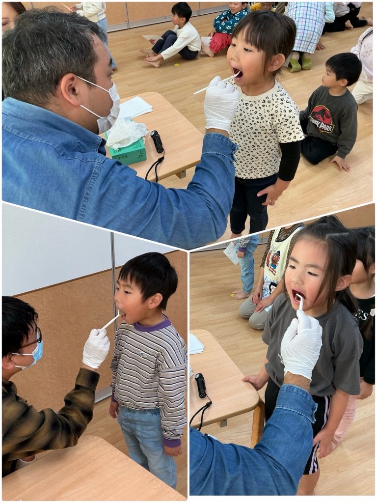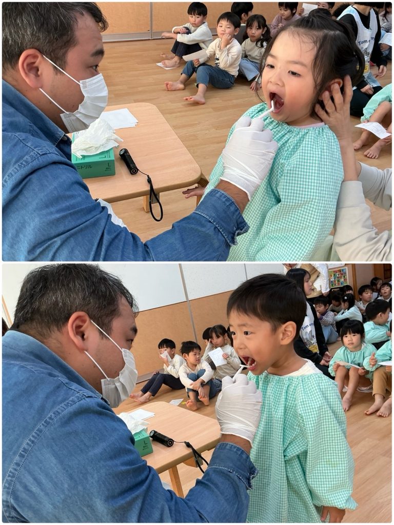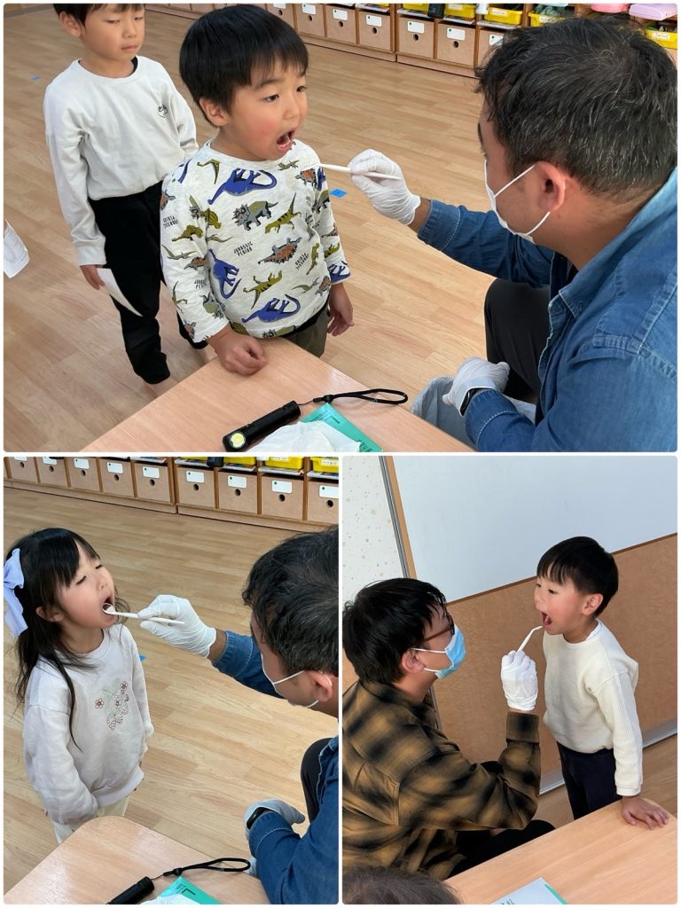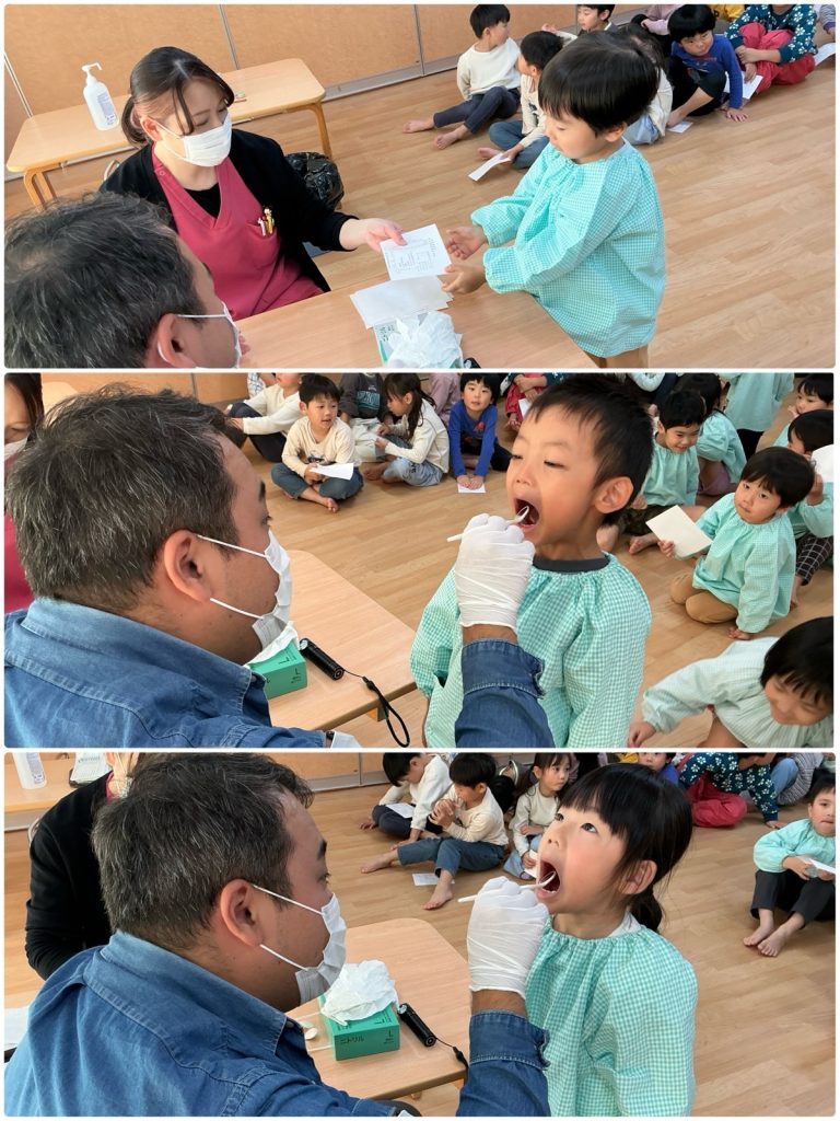 市野澤歯科の皆さんが来て、歯科検診をしてくださいました。自分の名前と「お願いします」のご挨拶をして大きく口をあけて、診ていただきました。ばら組・ふじ組のお友だちもドキドキしながらでしたが、頑張りました。歯ブラシもいただきました。お家でも歯磨き頑張ろう🪥市野澤歯科の皆さんありがとうございました😊