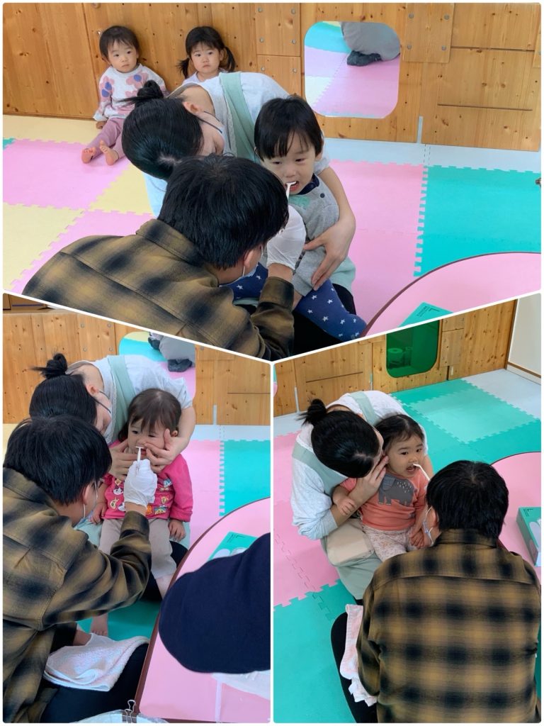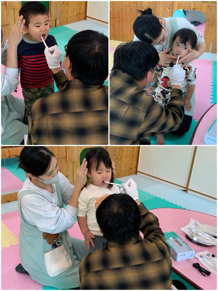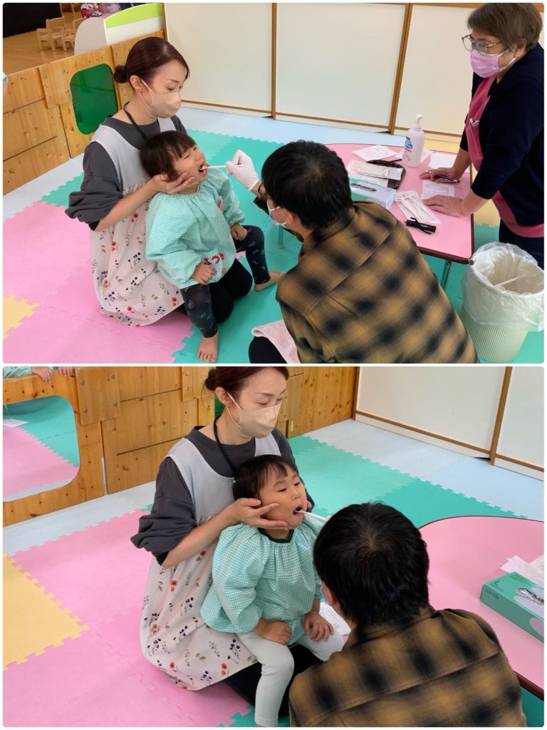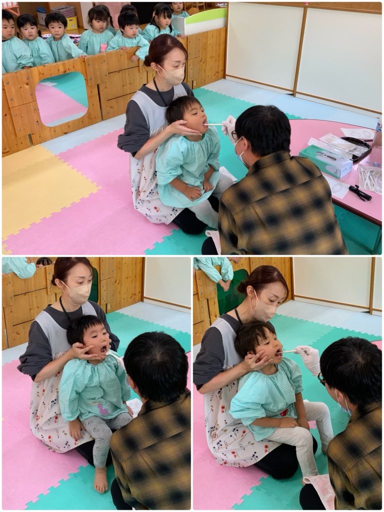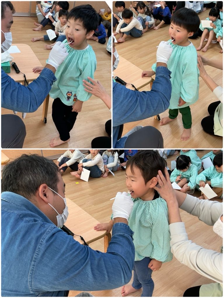 市野澤歯科の皆さんが来て、歯科検診をしてくださいました。自分の名前と「お願いします」のご挨拶をして大きく口をあけて、診ていただきました。ばら組・ふじ組のお友だちもドキドキしながらでしたが、頑張りました。歯ブラシもいただきました。お家でも歯磨き頑張ろう🪥市野澤歯科の皆さんありがとうございました😊