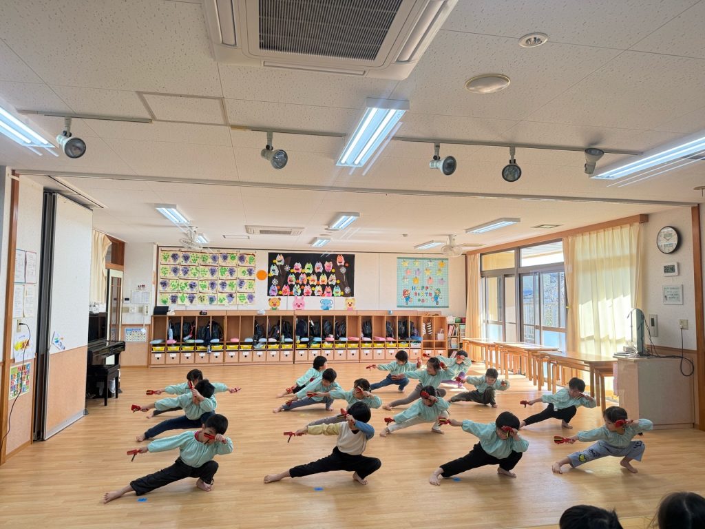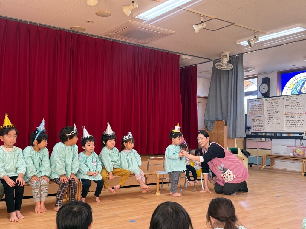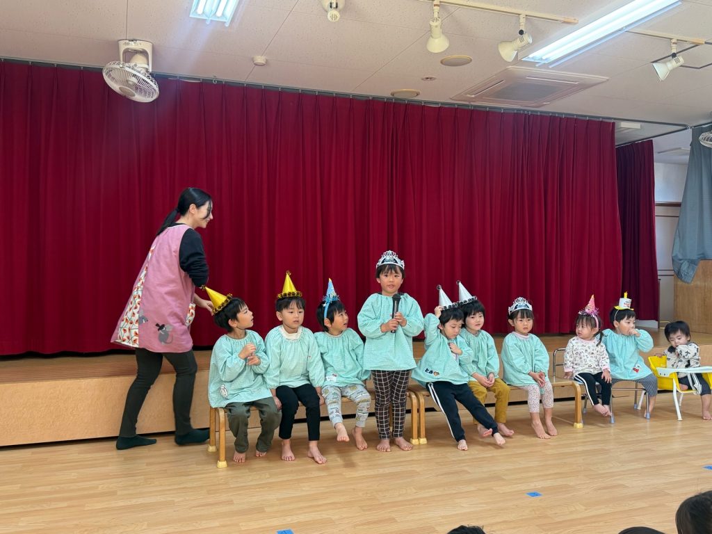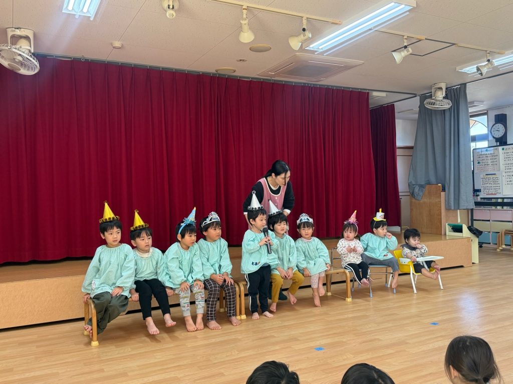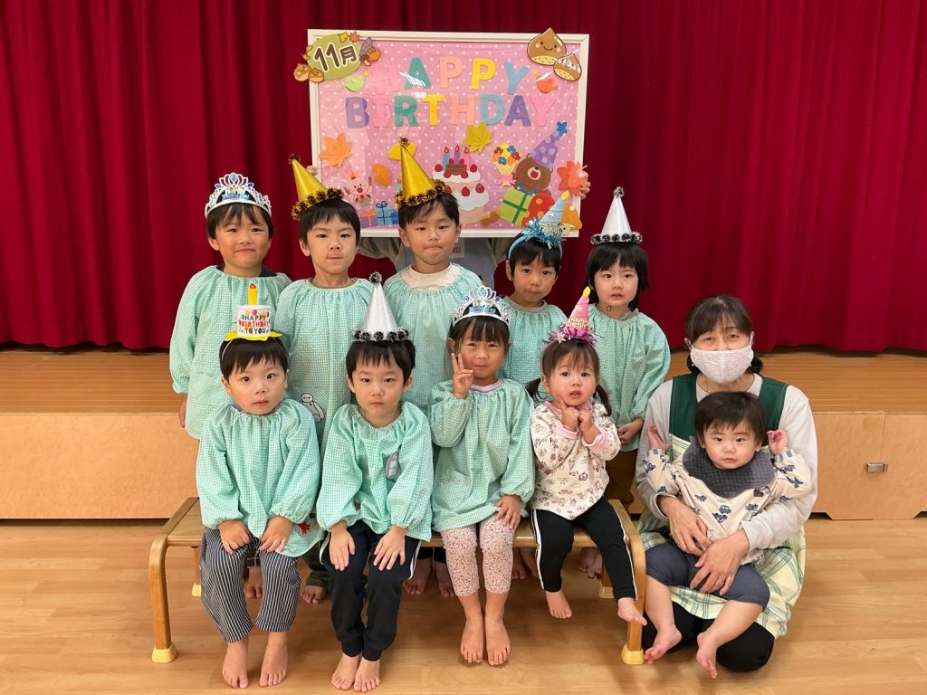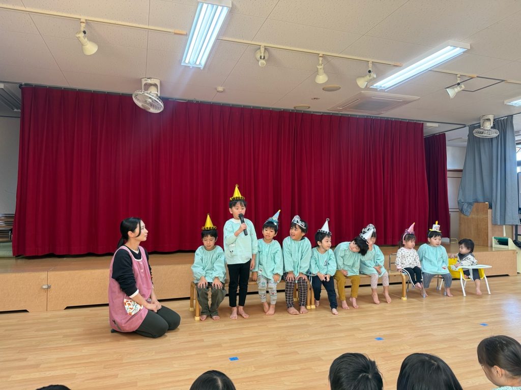 11月生まれのお誕生会を行いました。何歳になるか、プレゼントに欲しいものを教えてくれました。「トミカが欲しい」「アンパンマンのぬいぐるみが欲しいです」と教えくれました😊お誕生日おめでとう🎂第2部はふれあい広場でも元気に発表した、まつ組の火炎太鼓の披露をしてくれました。たんぽぽ組のお友だちが「かっこいい〜!!」とたくさん拍手をしていました👏