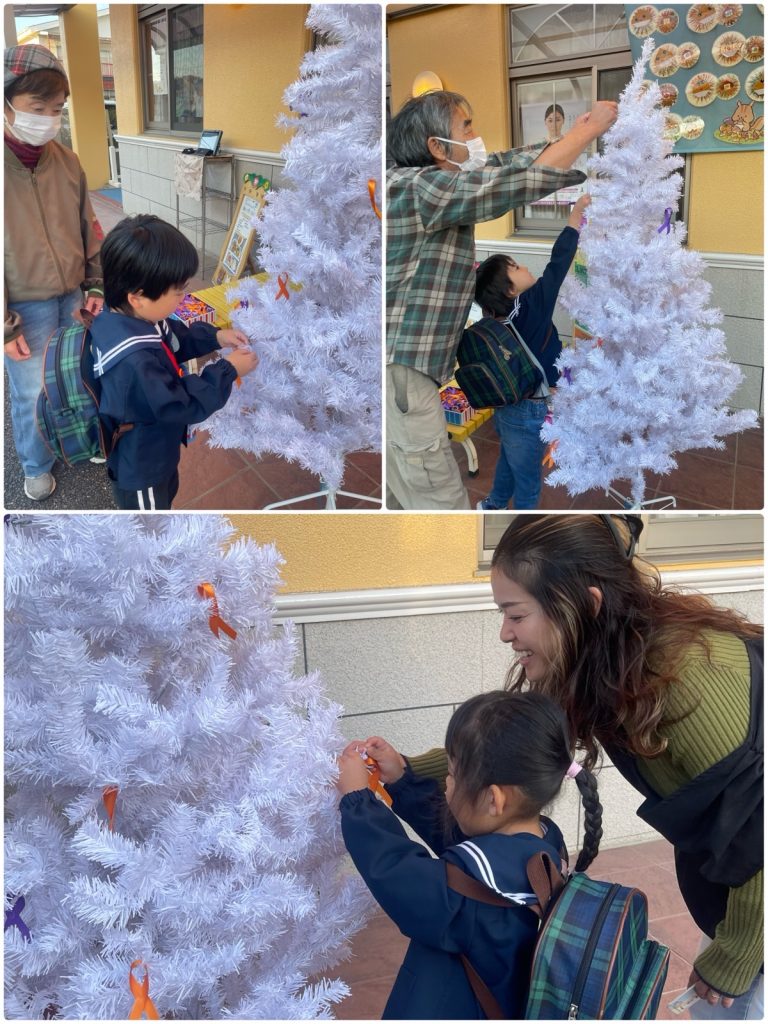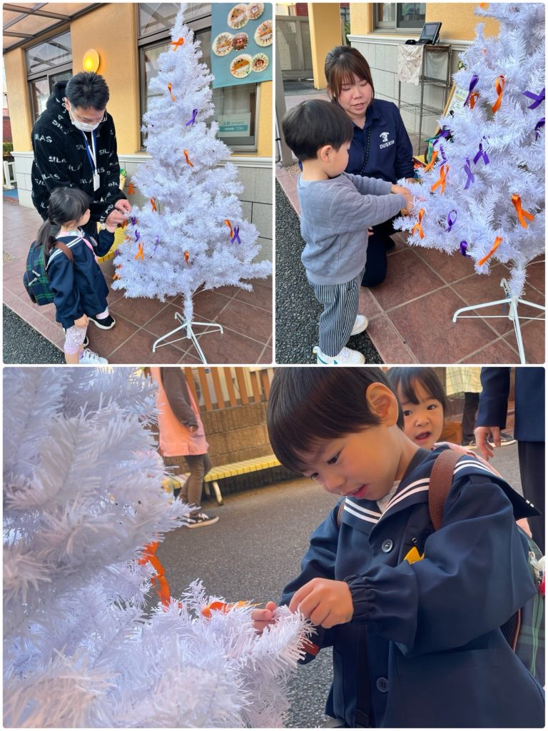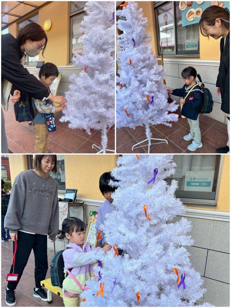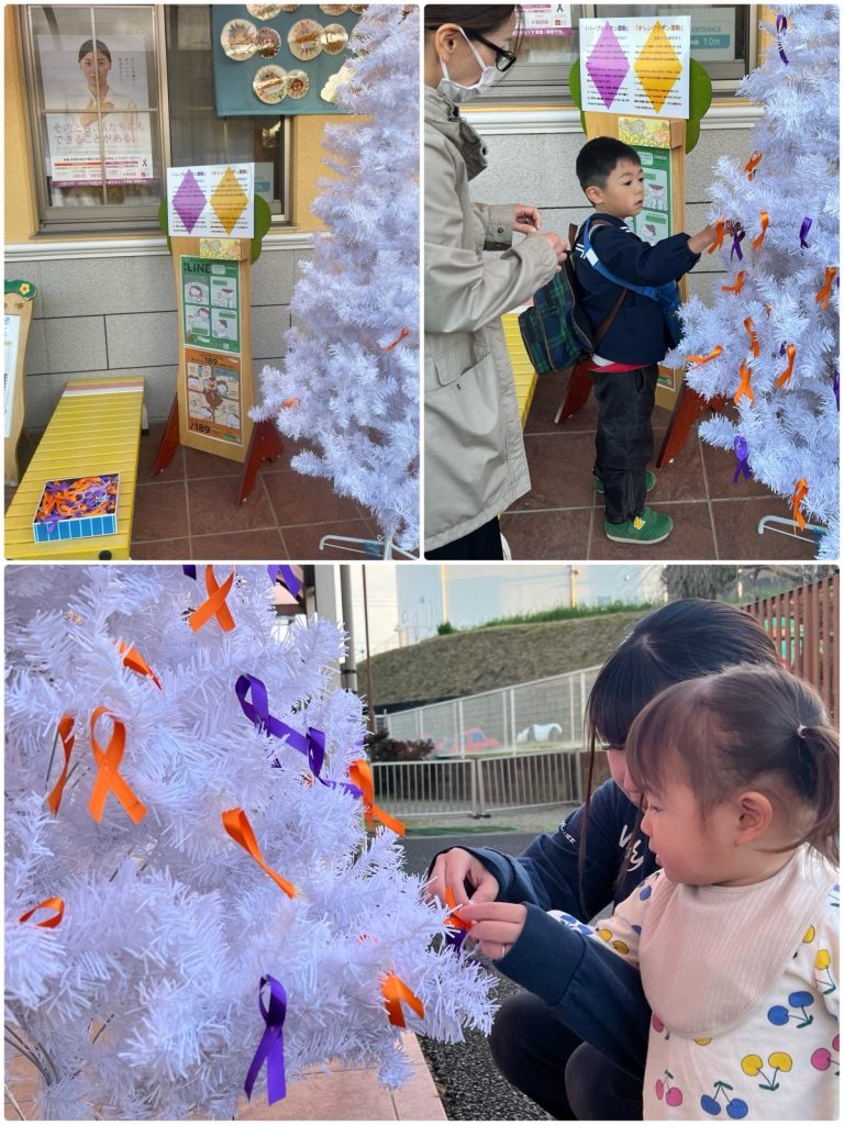あいさつ運動で地域の方が朝早くから、門の前で園児に「おはようございます」と声をかけてくださいました。子どもたちも保護者の方と一緒に元気に挨拶をしました😊お迎えの時には「オレンジリボン」「パープルリボン」運動を保護者の皆さんも参加していただきました。「オレンジリボン」は子どもへの虐待を防止する運動のシンボルで、「パープルリボン」は女性に対する暴力根絶運動の国際的なシンボルマークです。