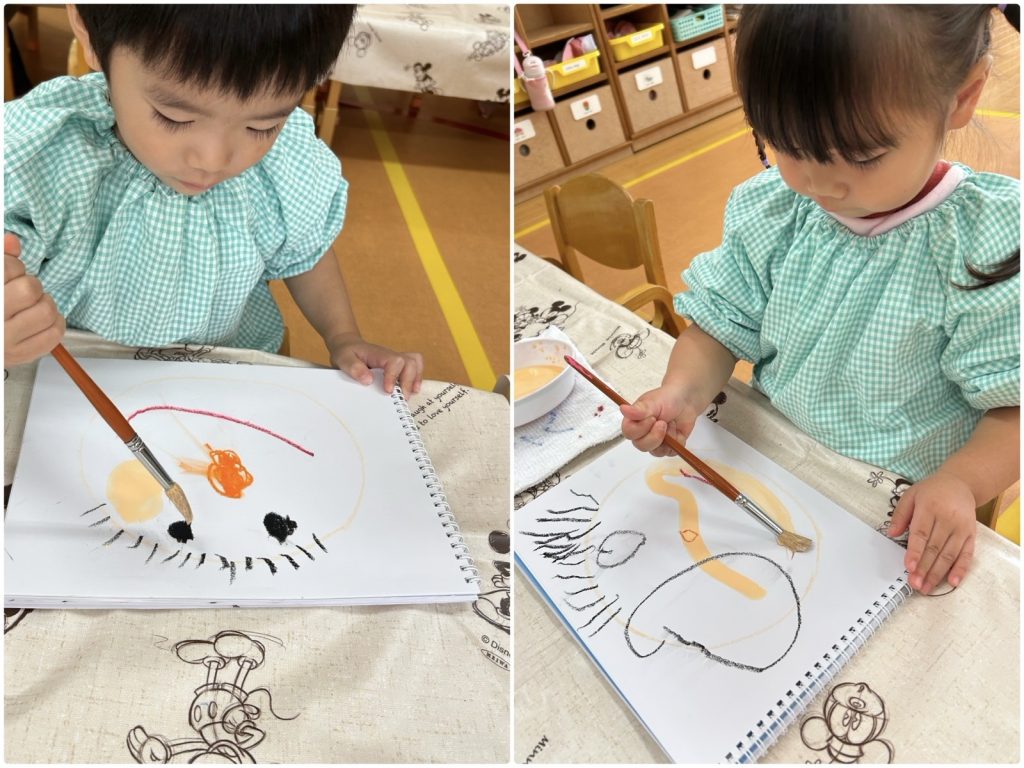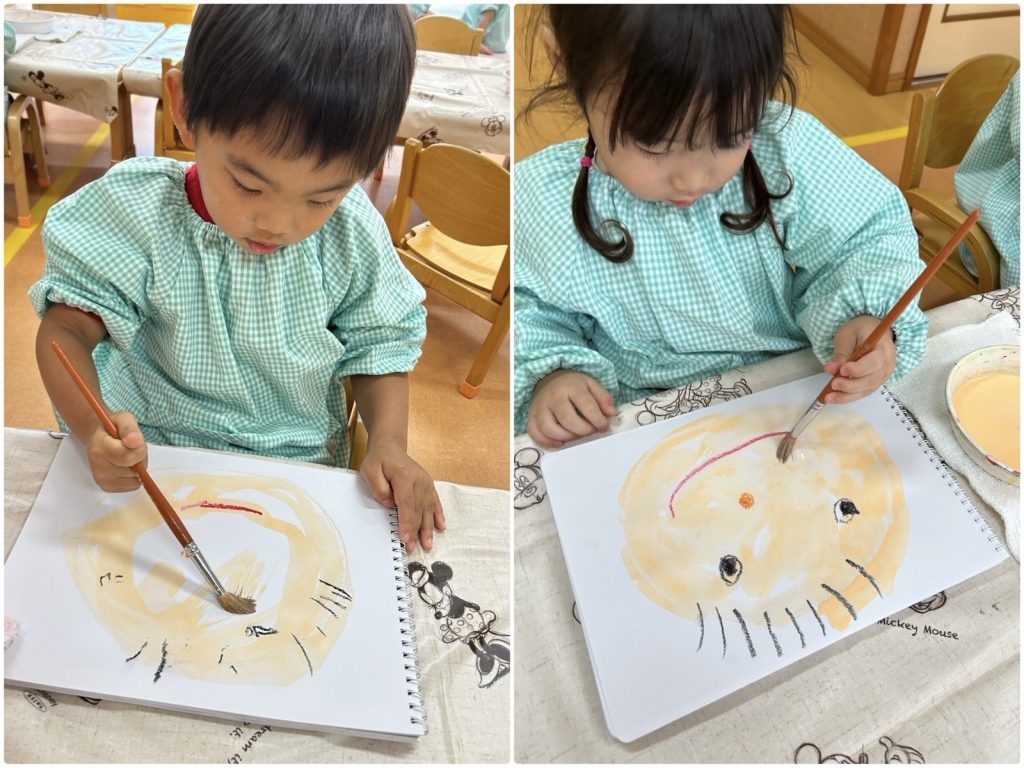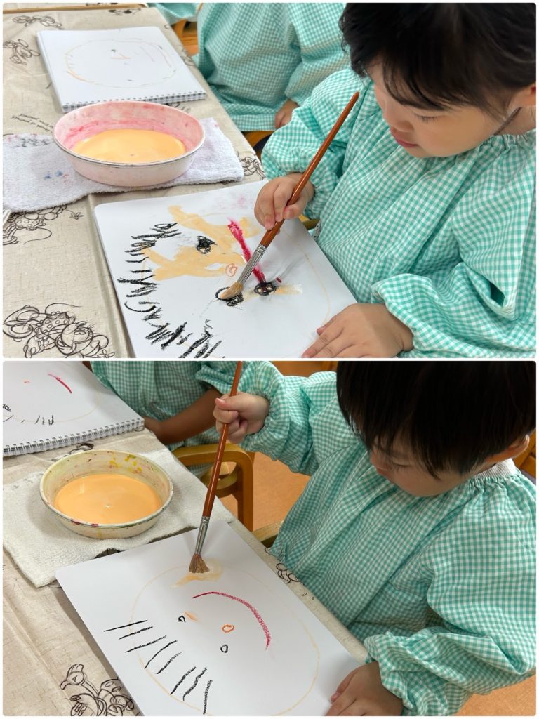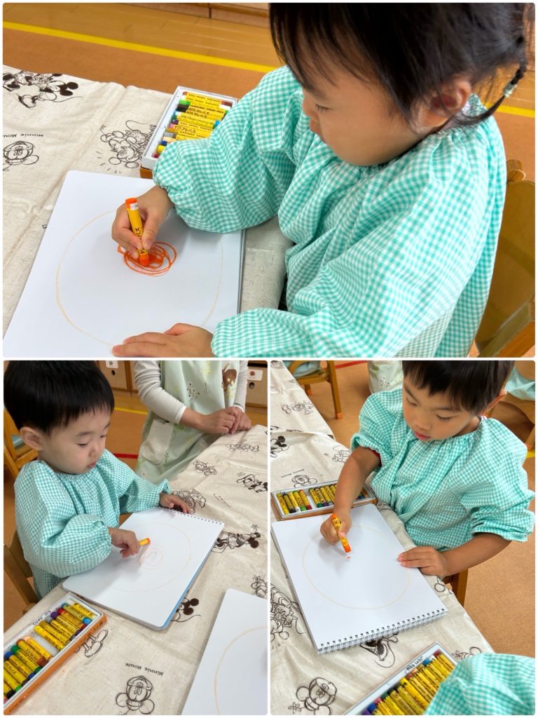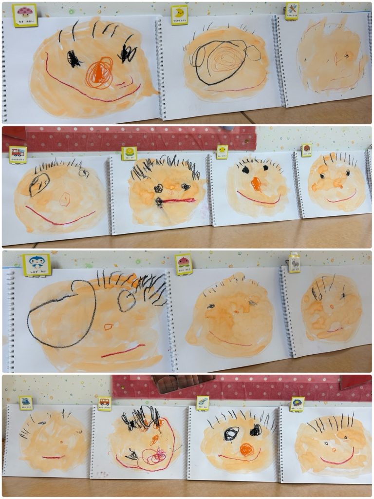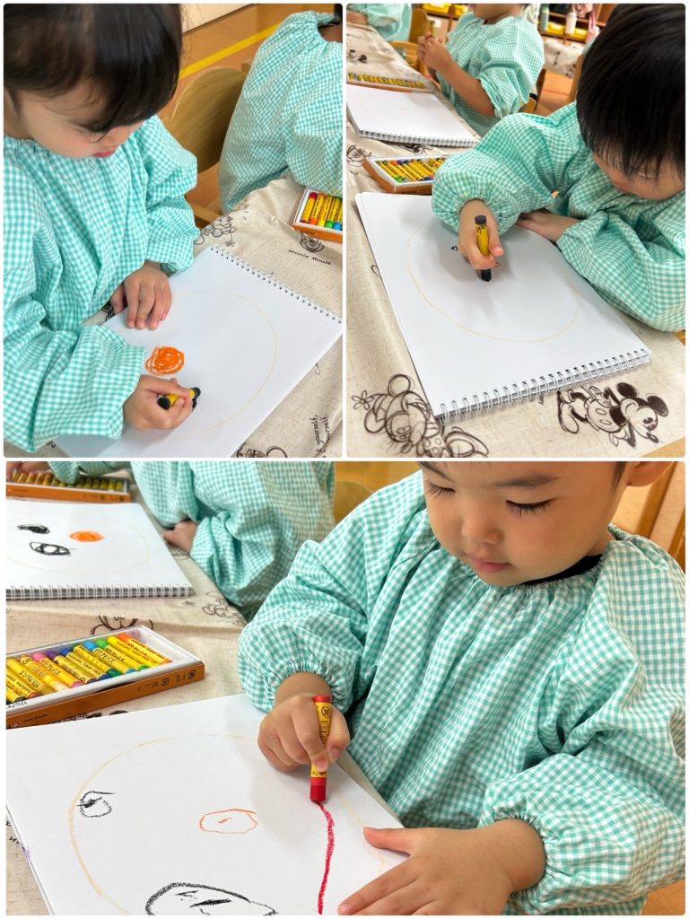 ふじ組が自分の顔を描きました😊先生が顔の輪郭を描き、みんなは中心になる鼻から描きます🖍️目と口、髪の毛も描いて、最後に絵の具で肌の色を塗りました🖌️みんな上手に描けました☺️