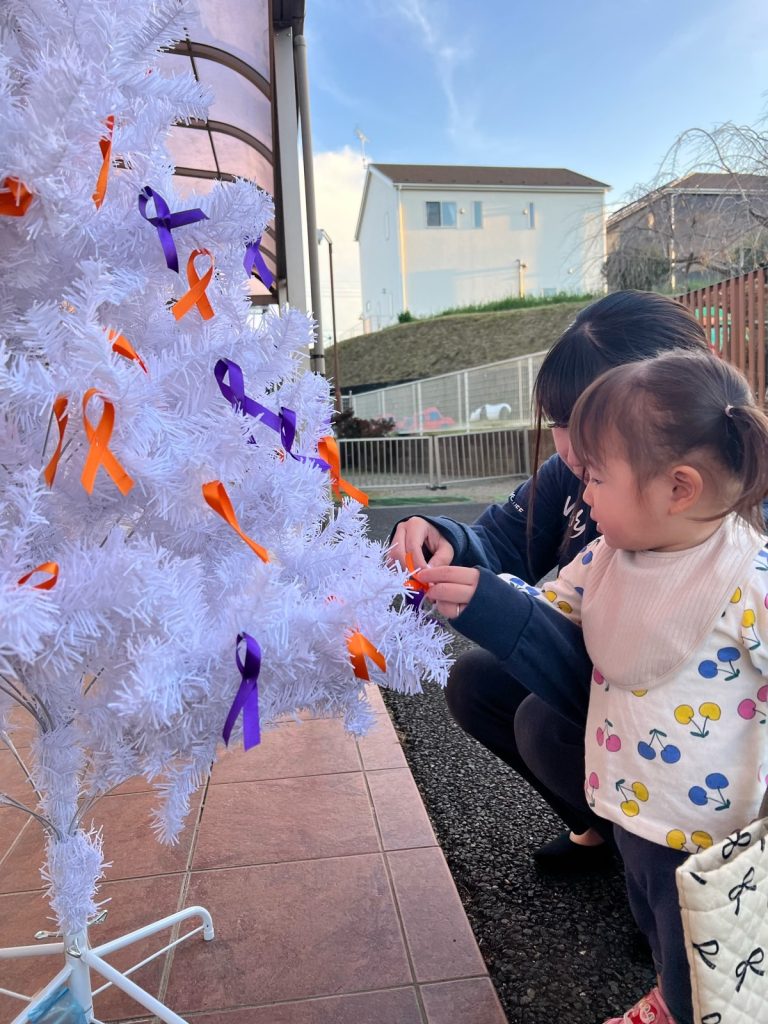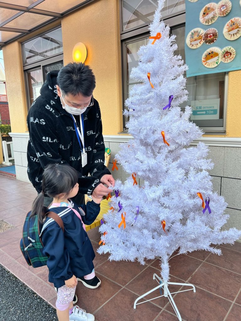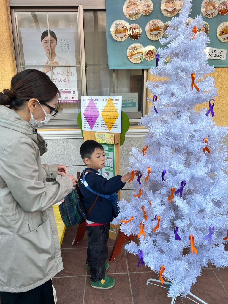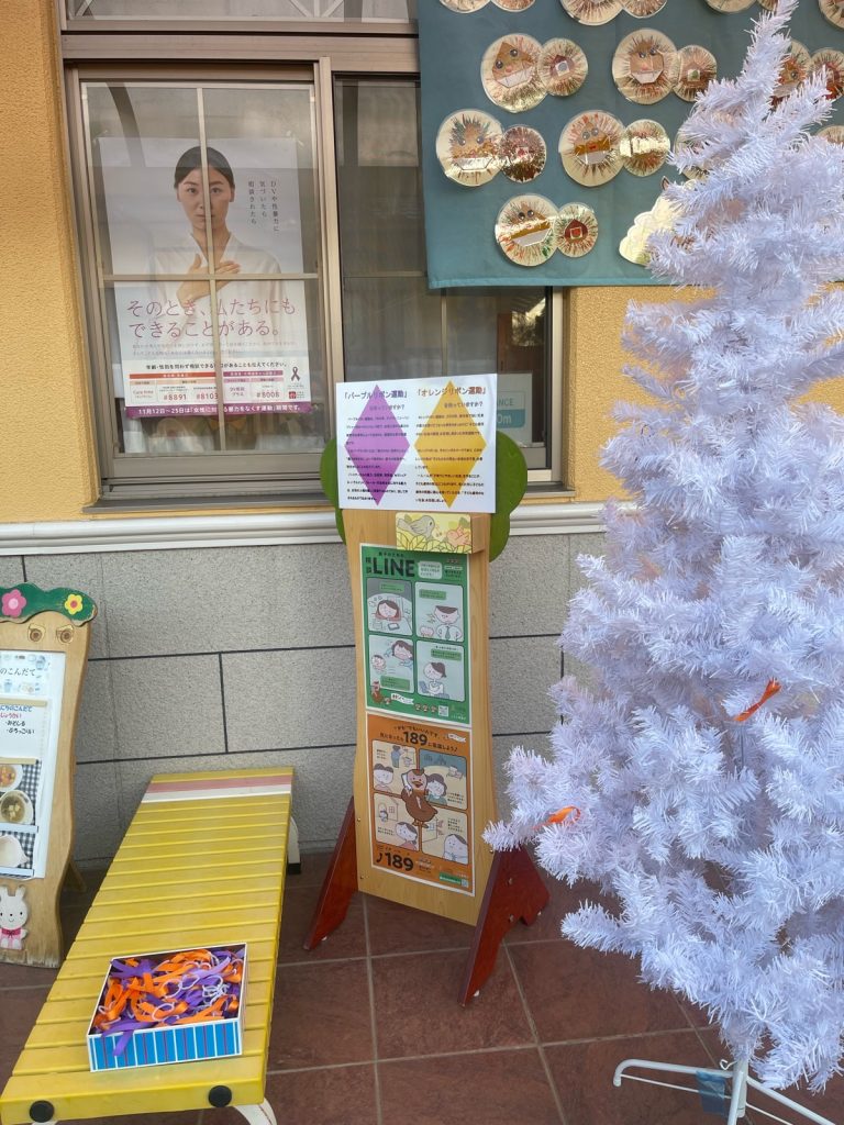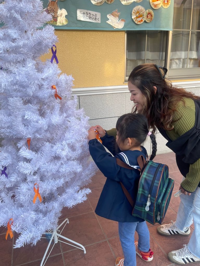 お迎えの時には「オレンジリボン」「パープルリボン」運動を保護者の皆さんも参加していただきました。「オレンジリボン」は子どもへの虐待を防止する運動のシンボルで、「パープルリボン」は女性に対する暴力根絶運動の国際的なシンボルマークです。