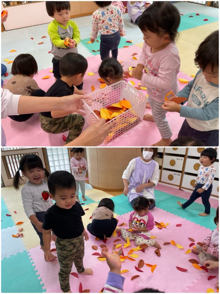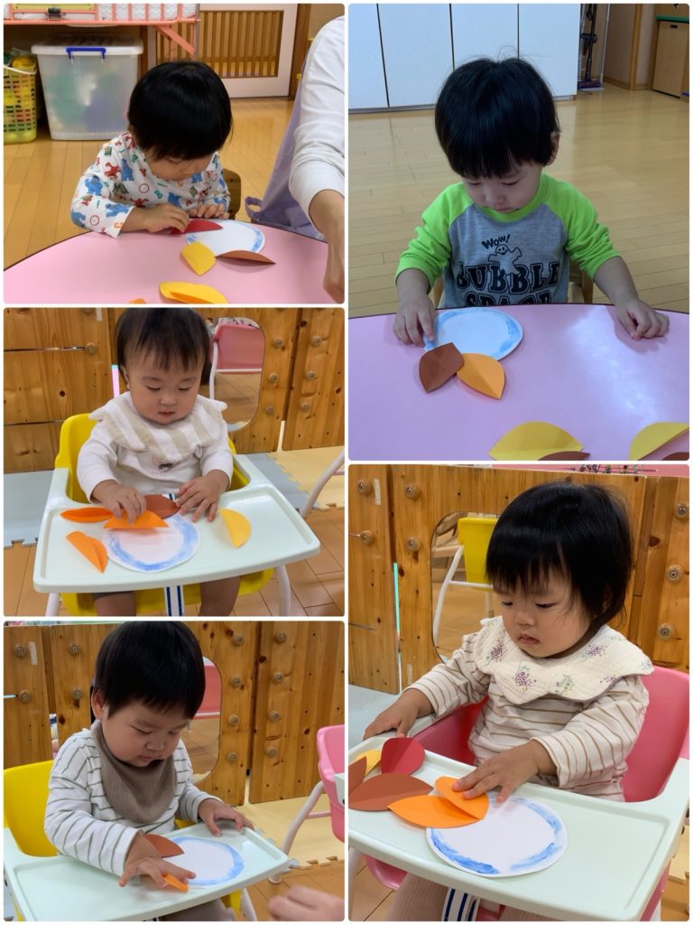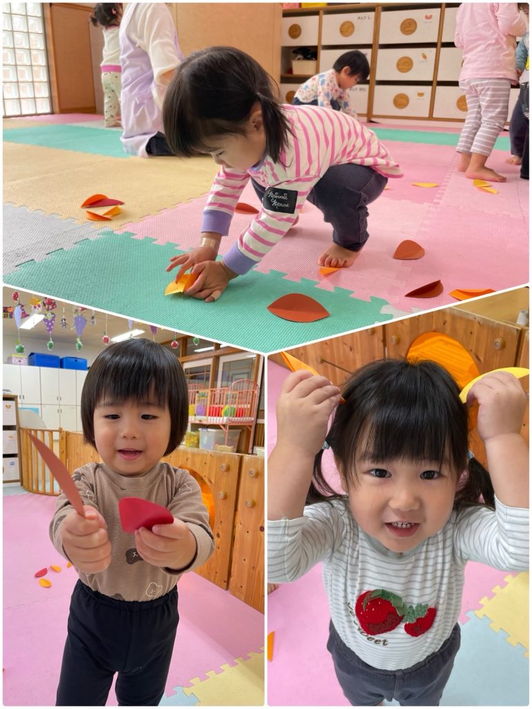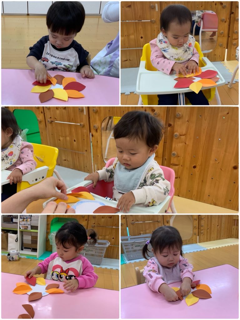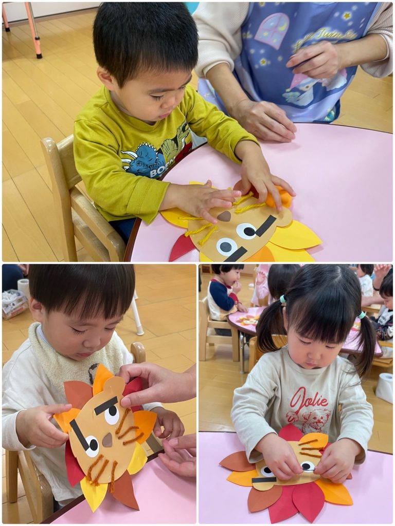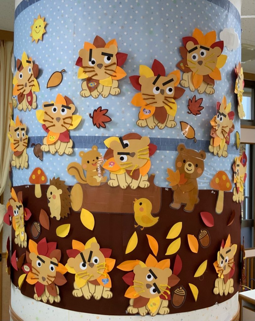 ばら組の部屋の中にたくさんの落ち葉が🍂みんなで落ち葉拾いをしました😊きれいな落ち葉で壁面を作ろう❣️のりのついている画用紙に落ち葉を貼りました。目・眉毛・ひげを付けたら、ライオンの完成です🦁色んな顔のライオンが動物たちと遊んでいるね☺️
