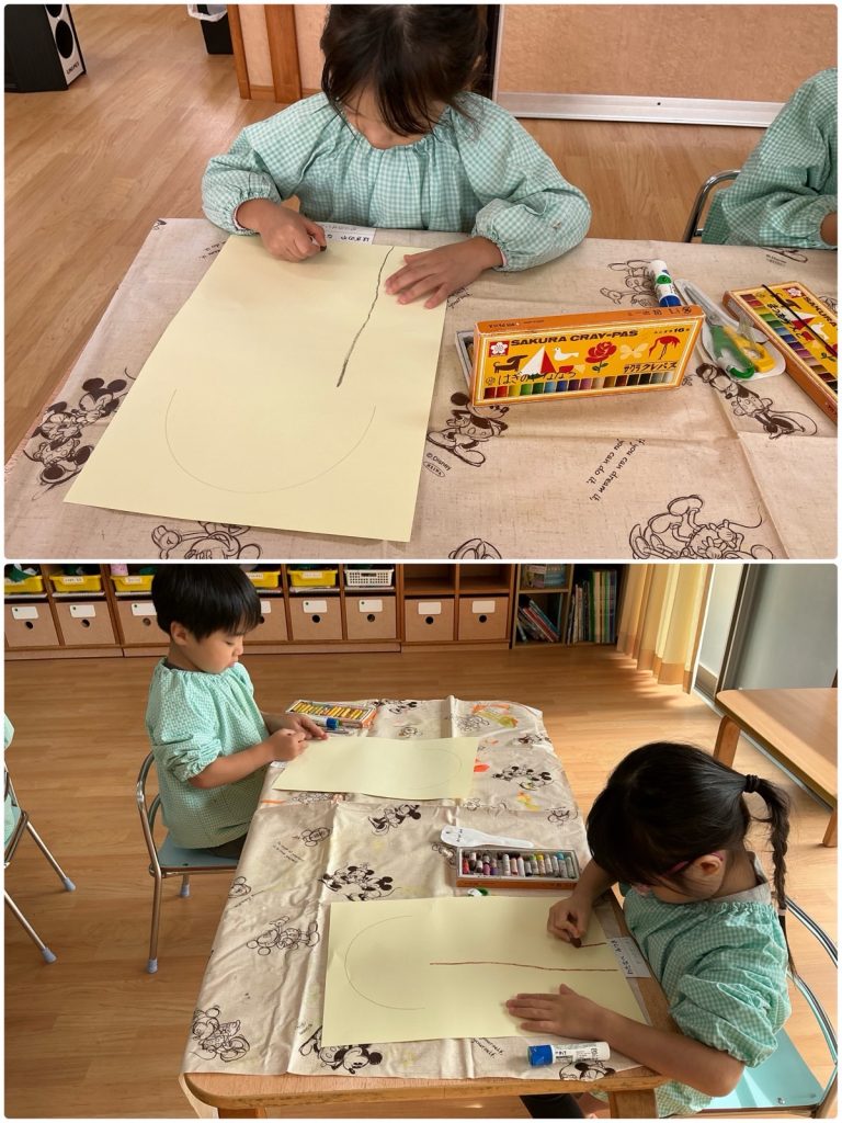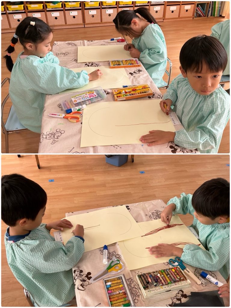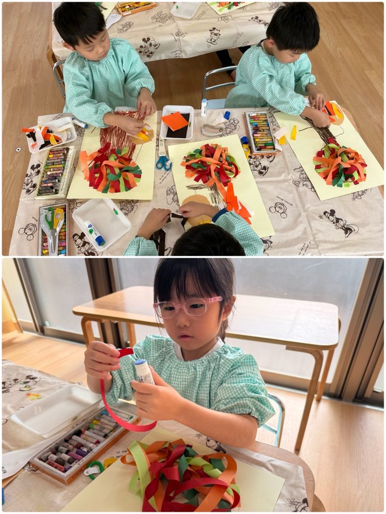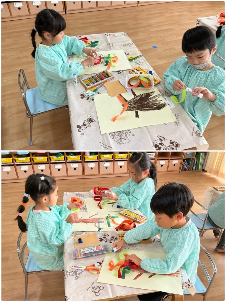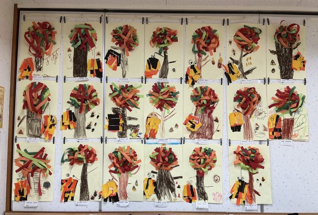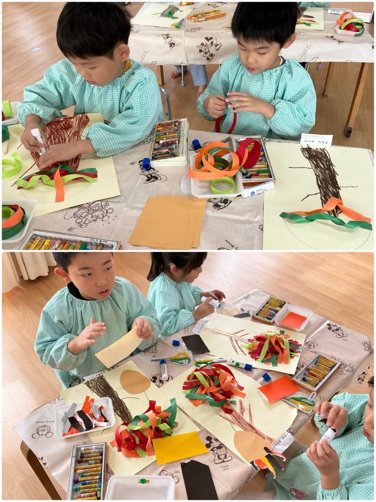 まつ組が「木の実」の製作をしました。クレヨンで木の幹を下から描いて、色を塗りました。色々な紙テープをのりで貼り、木を立体的に仕上げました。折り紙をちぎって、重ねて貼ってミノムシを作ります。どんぐりや栗など木の実をクレヨンで描いて完成です🌰まつ組の教室は紅葉真っ盛りです🍁