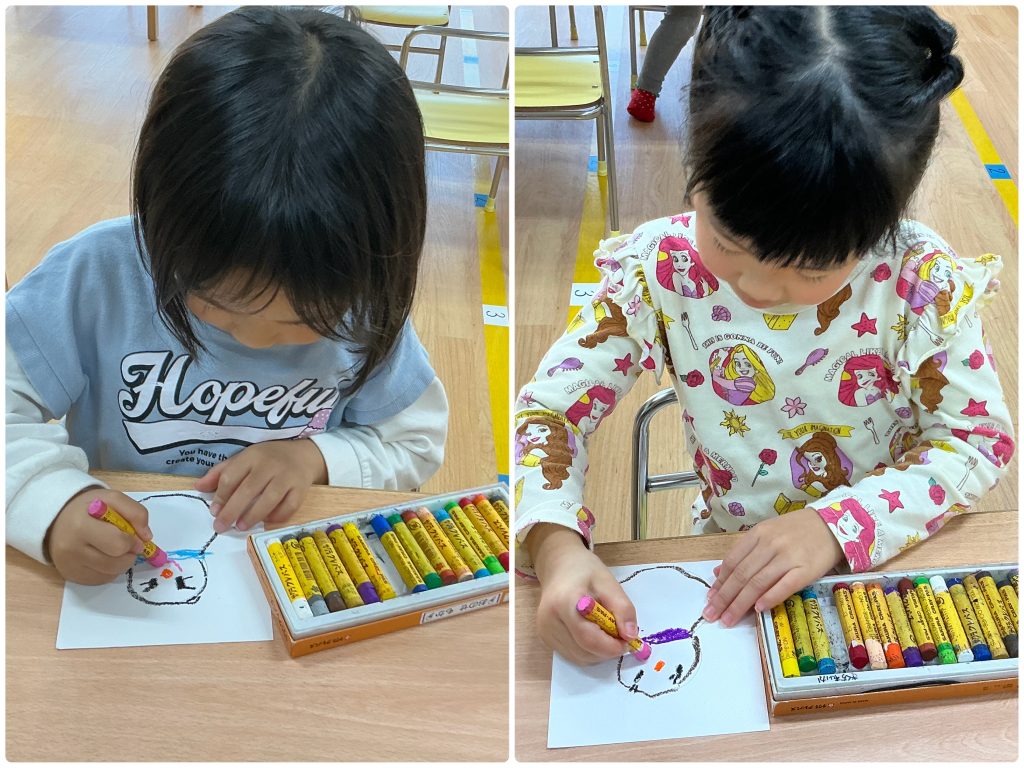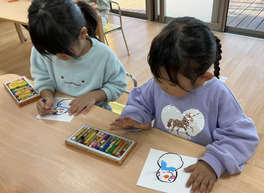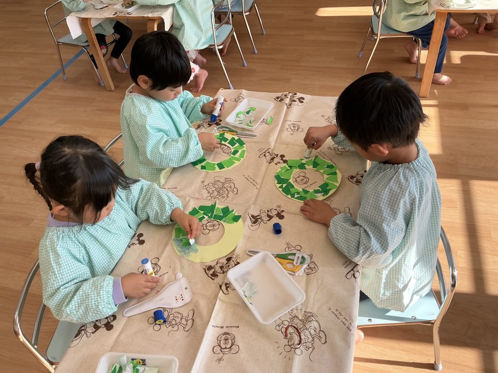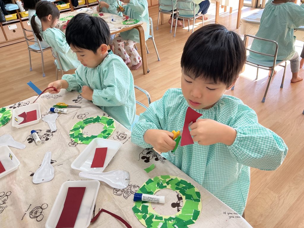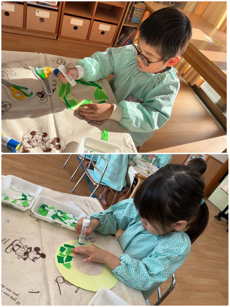 たんぽぽ組が親子製作で外飾りを作りました。子どもたちが折り紙をちぎってリースを作りました🎄リボンを切って貼り、シールで飾り付け🎶お家の方が折ってくれた鈴をつけて、クレヨンで描いた雪だるまも添えて完成です❤️素敵なリースが出来ました👏✨