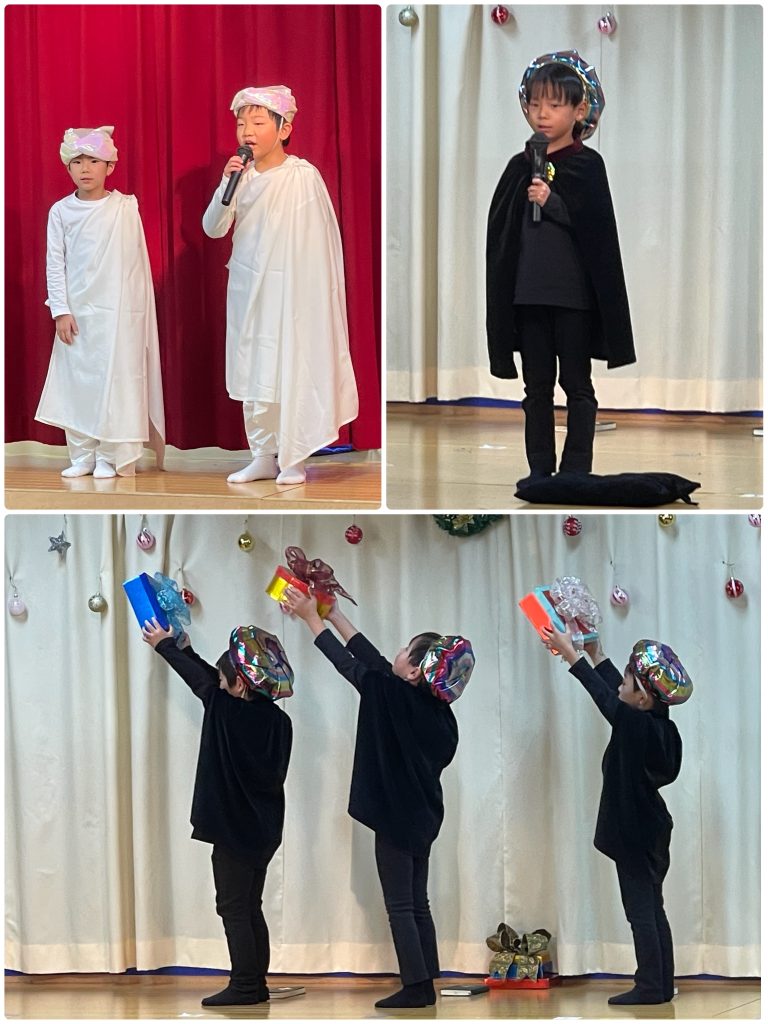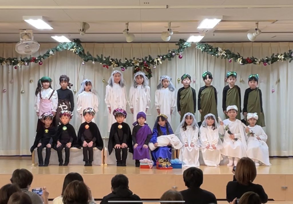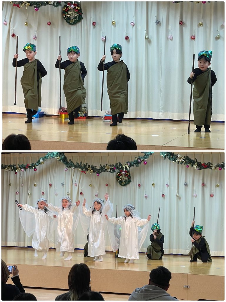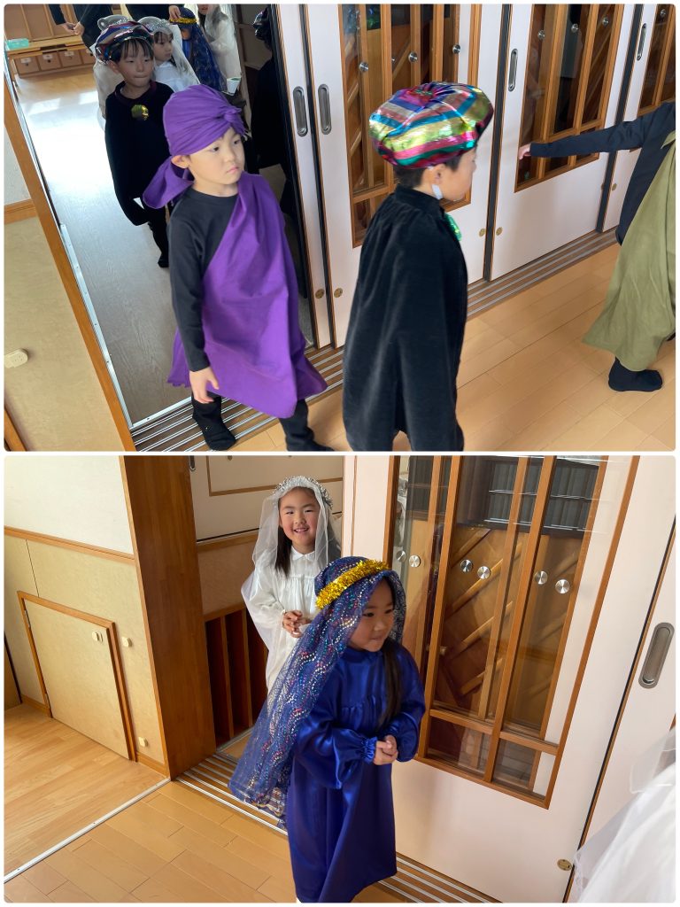 クリスマス発表会当日!ちょっぴり緊張しながら登園した子たちも聖劇の衣装を着てやる気満々!本番は誰一人かけることなく全員で参加できました。「あードキドキする」と言いながらも、練習通りの素晴らしい姿を見せてくれました。とても上手に出来た子どもたちをたくさん褒めてあげてくださいね😊保護者の皆様ご協力本当にありがとうございました♪