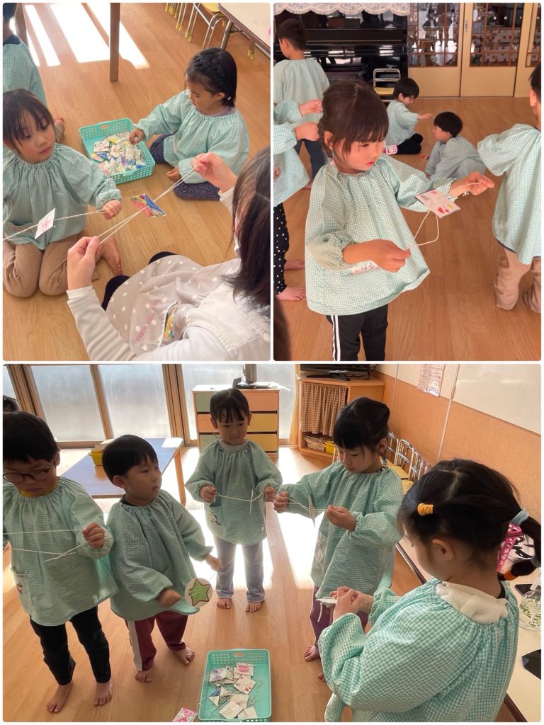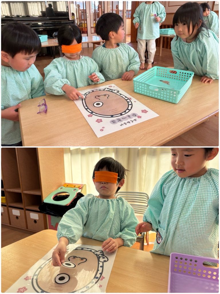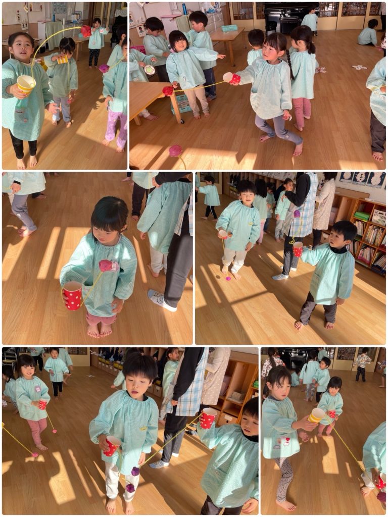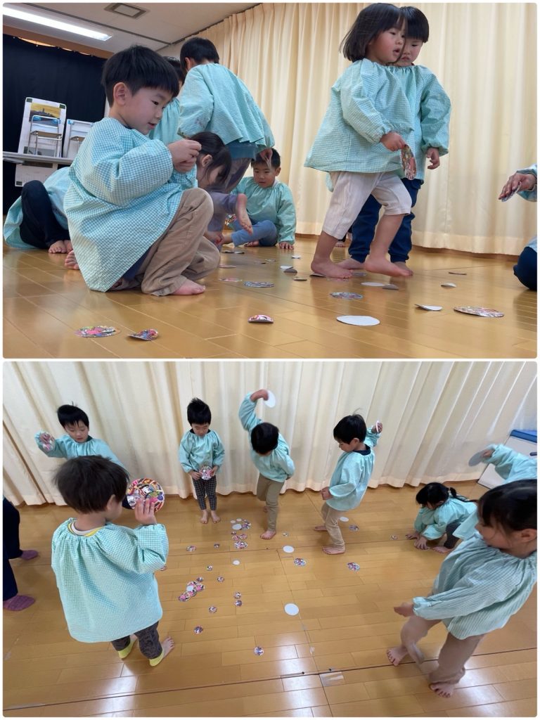 1月生まれのお誕生会をしました。名前と何歳になったか、欲しいプレゼントを教えてくれました。お誕生日おめでとう🎂第2部は「お正月遊び」をしました。福笑い、羽子板、ブンブンゴマ、けん玉、コマ回し、めんこなど、みんな夢中で遊びました。福笑いは完成した顔を見て、みんなで大笑い😆とても楽しかったね😄