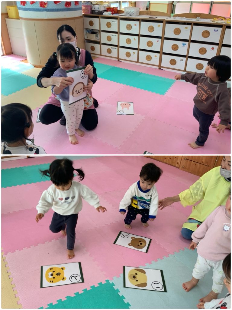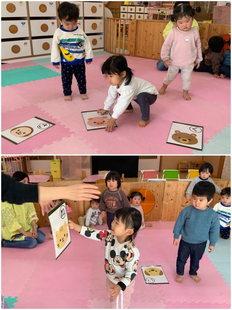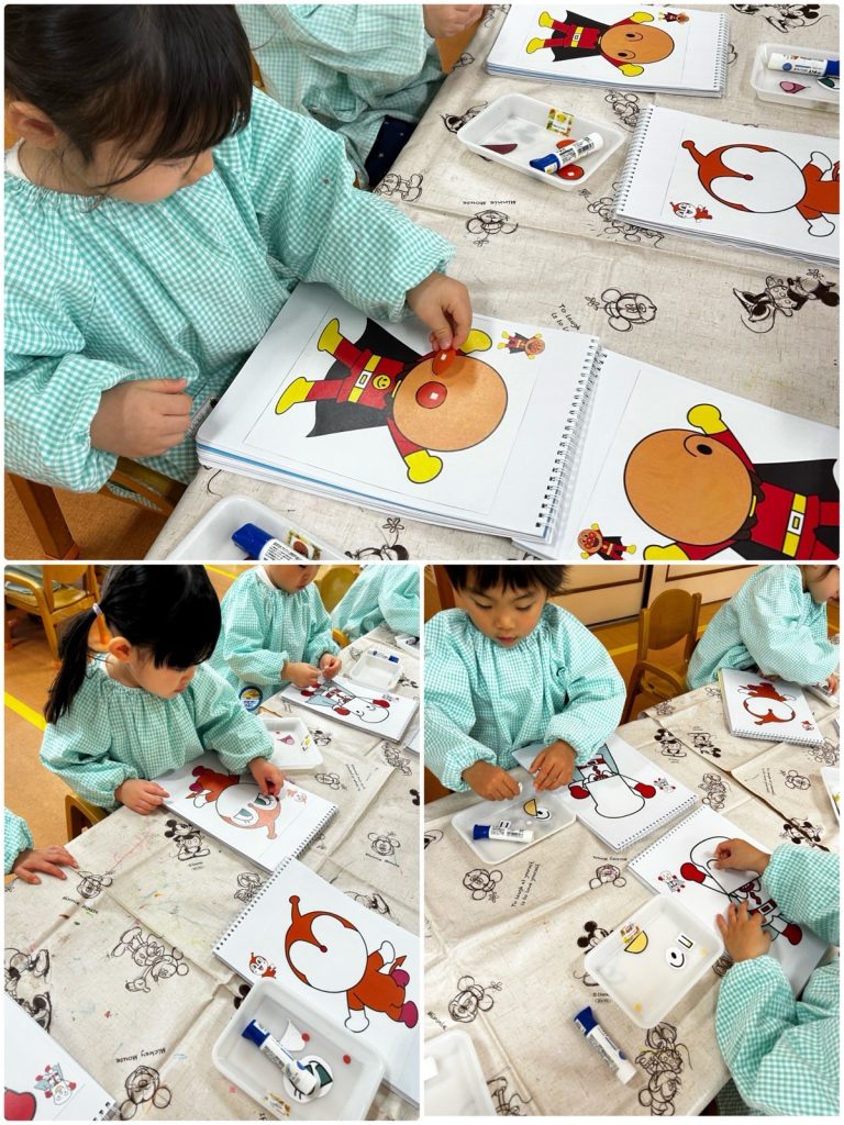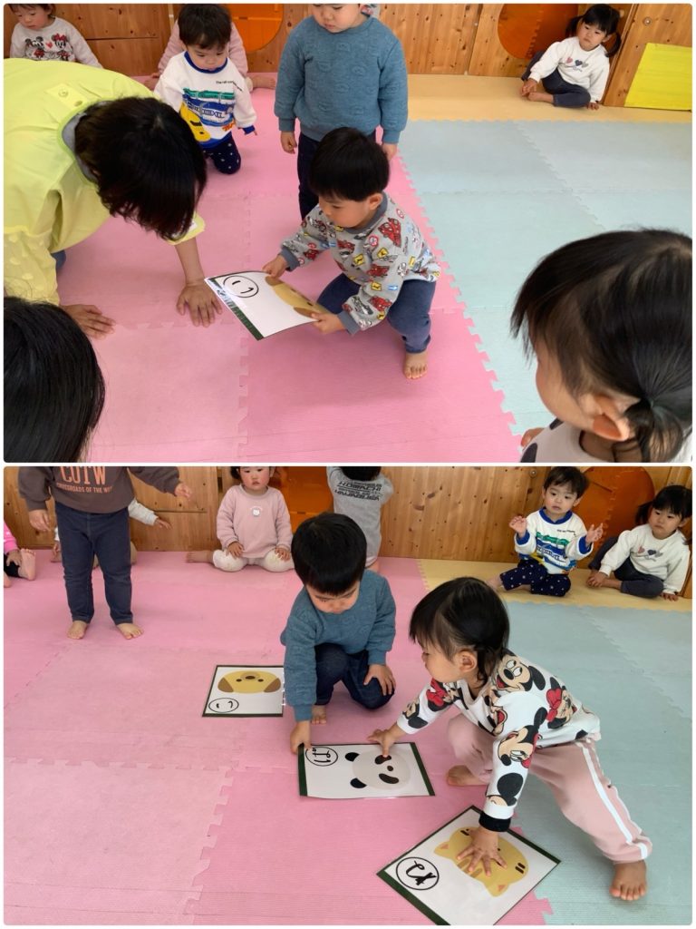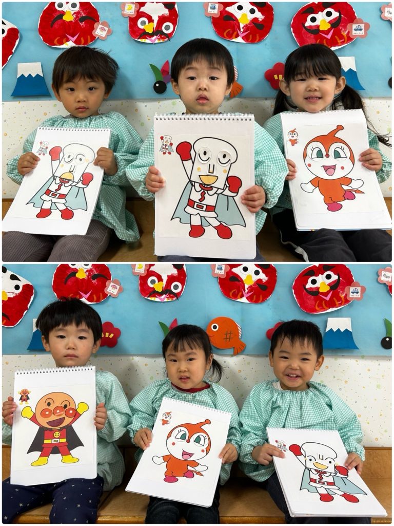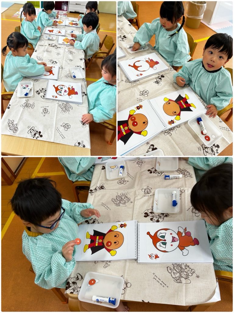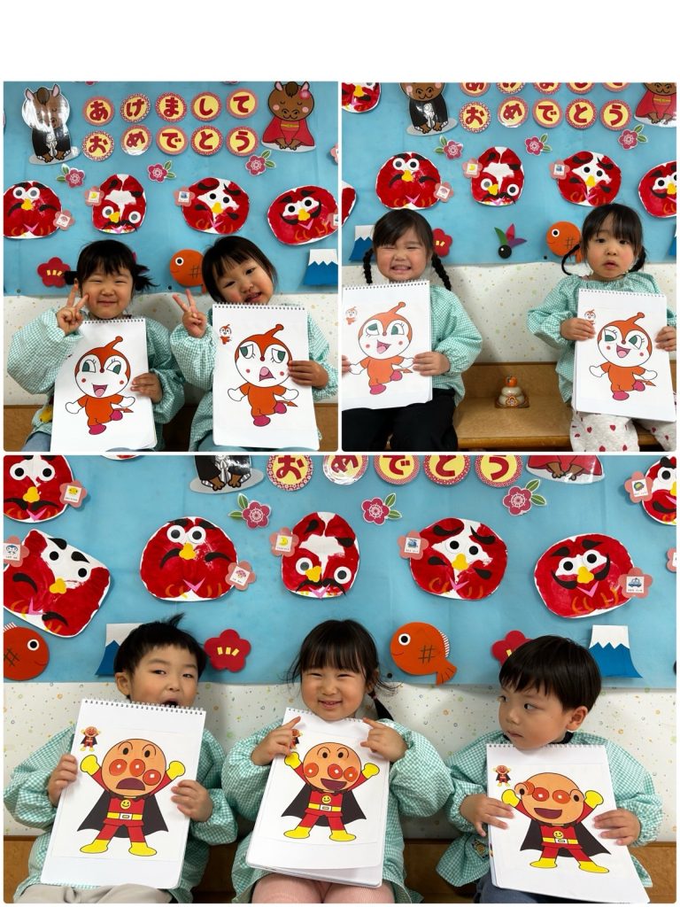 ふじ組がアンパンマンのキャラクターで福笑いをしました。自分の好きなキャラクターで目・鼻・口をつけました😊同じキャラクターでもみんなの個性がでていて、とても可愛いキャラクターが完成しました。ばら組はかるたをしました。ぱんだ・いぬなどの絵のかるたをとりました🐼みんな静かに聞いて、「くま」と呼ばれるとキョロキョロしながら絵を探していました😄
