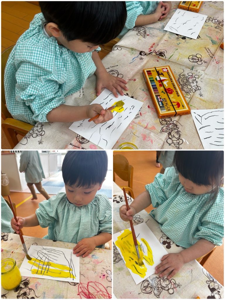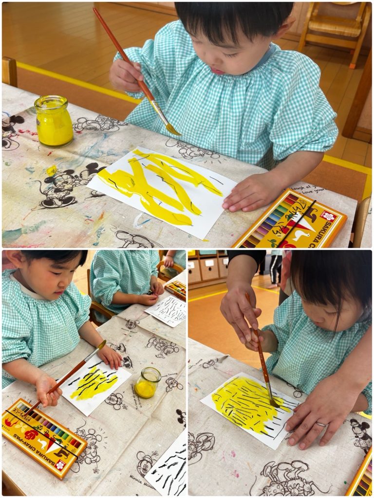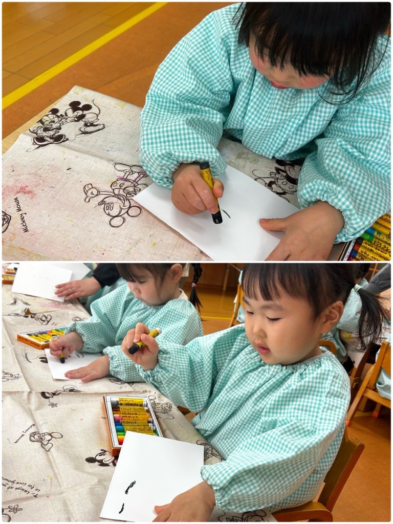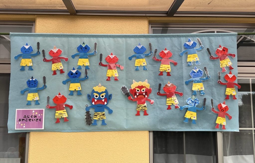 ふじ組の親子製作が、事務室脇通路に飾られました。鉄棒を持った強そうな鬼です。顔は保護者の方がお家で折り紙を折って、作ってくれました。鬼のパンツは子どもたちが、クレヨンと絵の具を使って作りました🖌️2月3日は節分です。心の中の悪い鬼をやっつけよう‼️