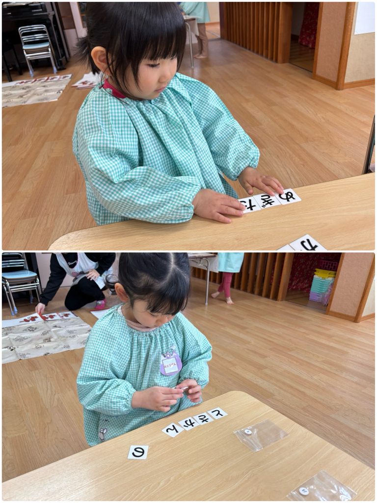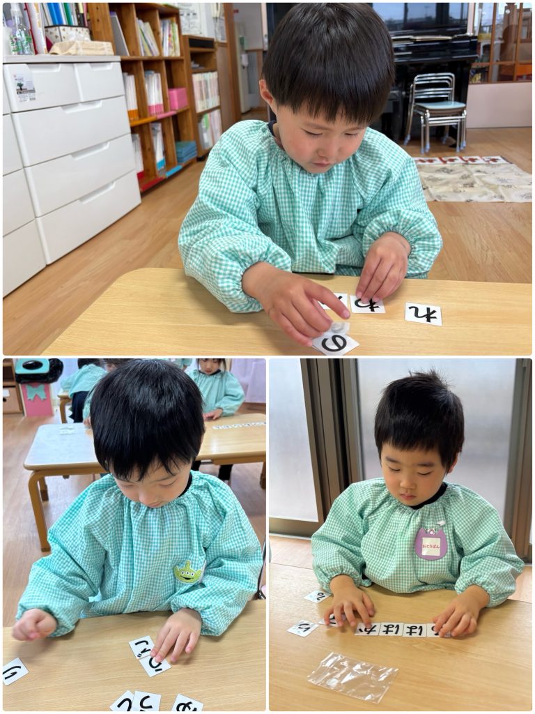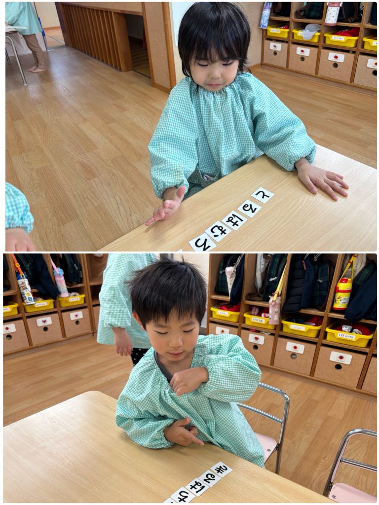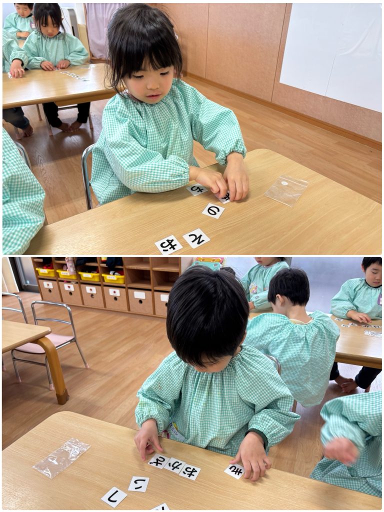 ちゅうりっぷ組が、文字カードを使って、自分の名前を並べます。自分の名前がどんな形なのか、どの順番なのかを先生と一緒に確認しながら覚えました😌書き初めの時に書いたので、名前は並べられましたが、苗字は難しくて、先生に聞きながらの子もいました。「できた〜」「先生見て」と完成した名前を見に行って、先生が声に出して読んでみると、「あれ!?」「名前が違う」とまた一生懸命並べるちゅうりっぷ組でした😊