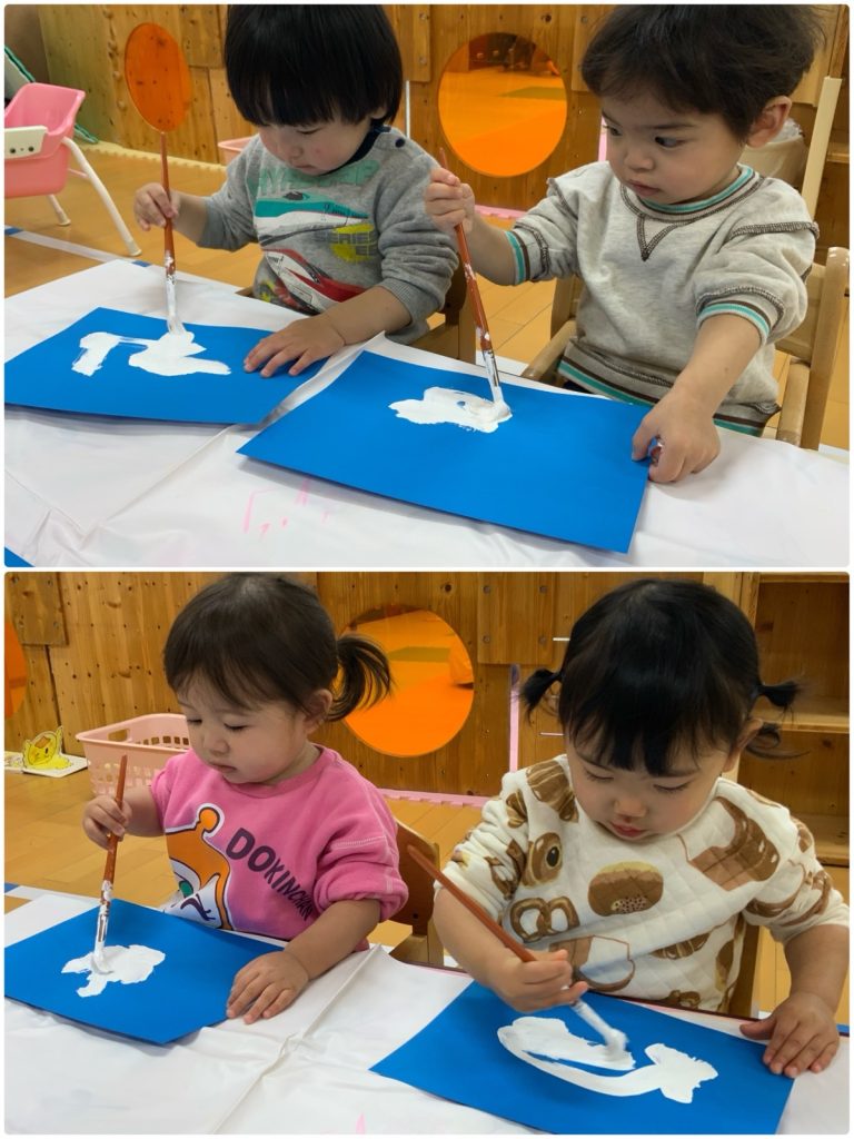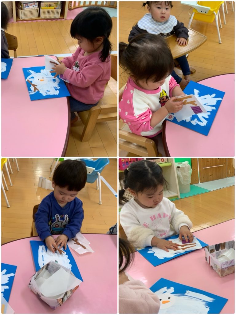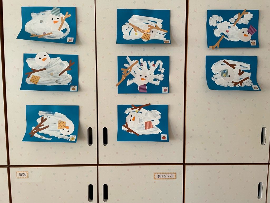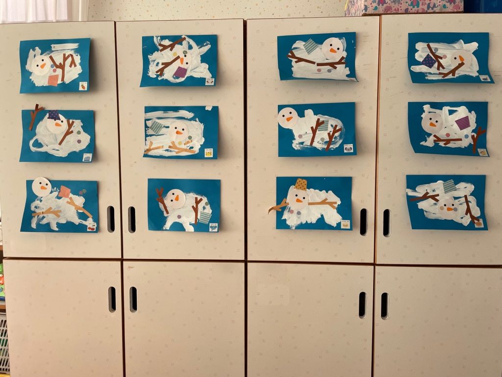ばら組が壁面製作をしました。筆を使って白い絵の具を塗ります。その上に、枝や帽子、顔を貼ります。あれ!?完成?🤔はい!完成です😊大好きな雪遊びで雪だるまを作って、ちょっと暖かくなると雪だるまが溶けてしまいます⛄️その雪だるまを表現しました😌