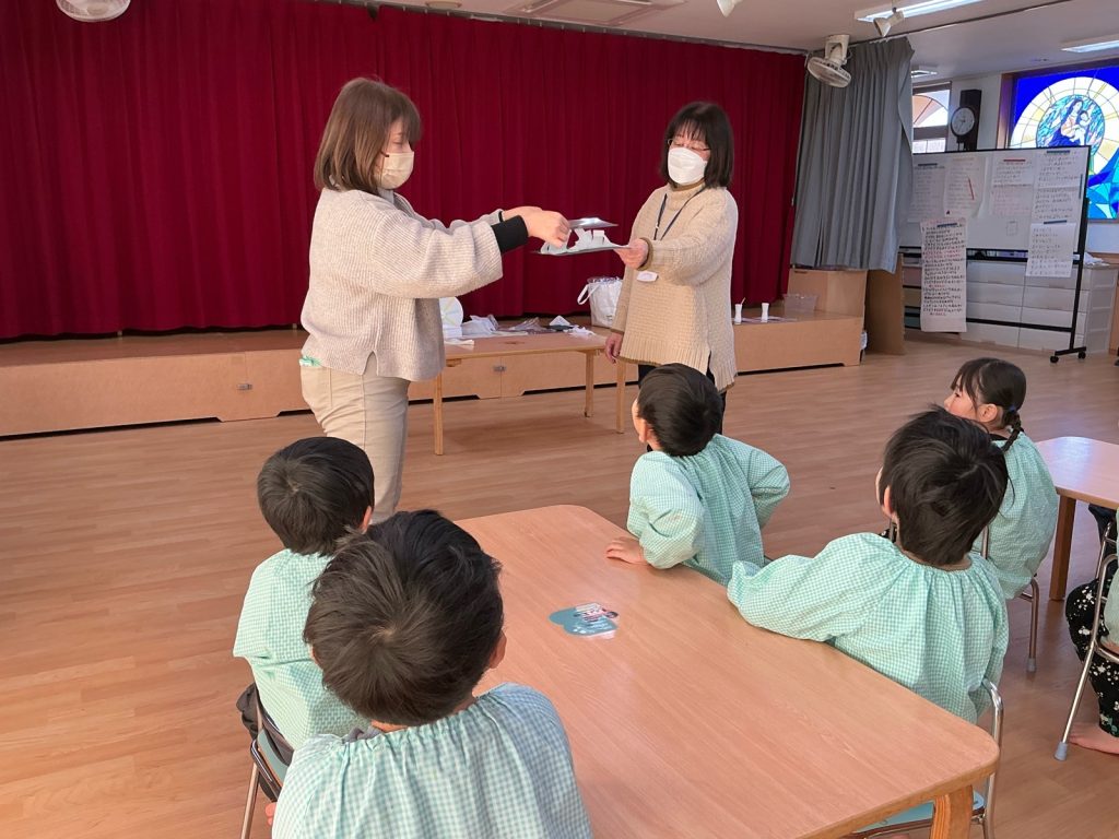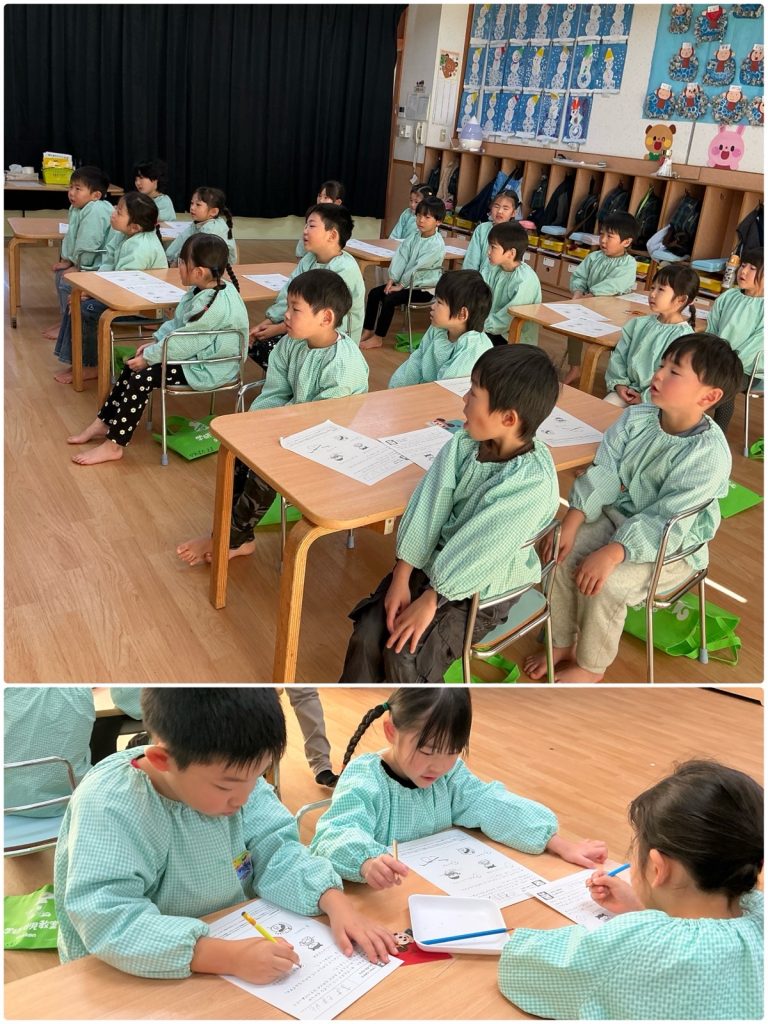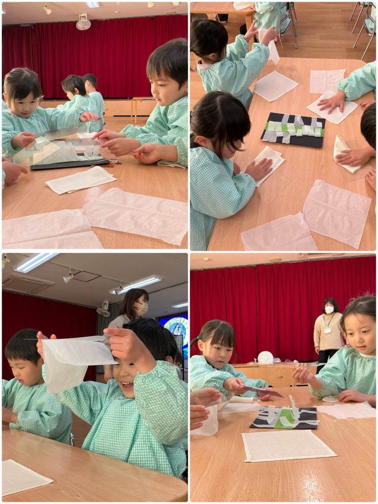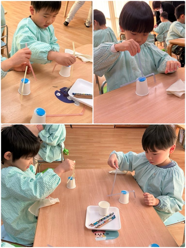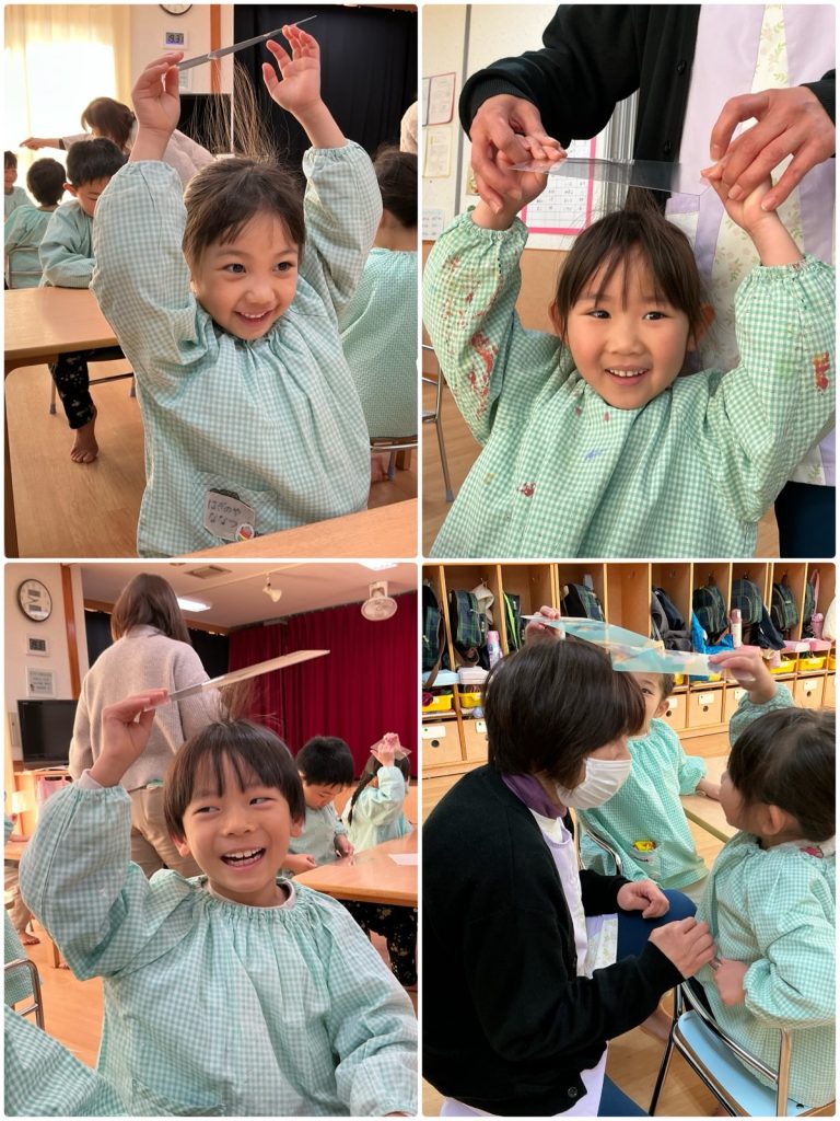 まつ組がかがくタイムで「静電気」について学びました。下敷きを擦って、パワー注入💪みんなの髪の毛も下敷きにくっついて、上がりました。紙コップに下敷きを近づけると、コロコロ転がって、みんなびっくり😳ストローを擦って、近づけると、くるくる回りました。楽しかったね😊
