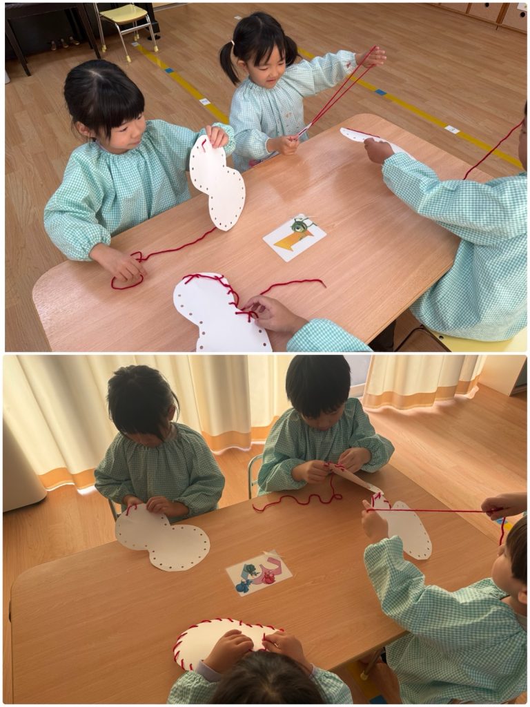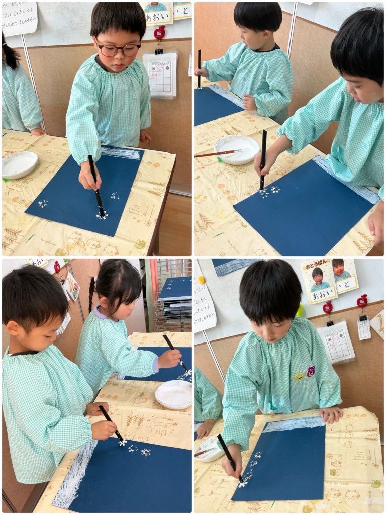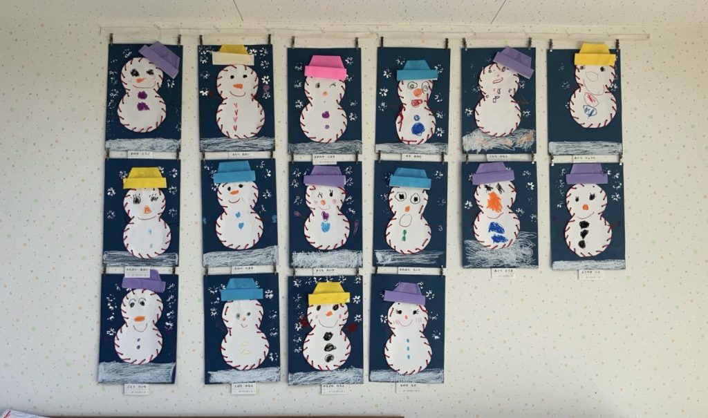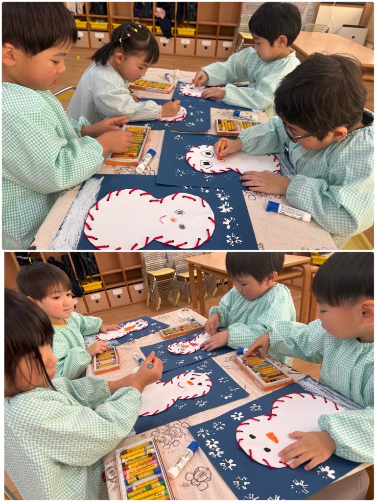たんぽぽ組が雪だるまの製作をしました。雪だるまのまわりに毛糸を通します🧶色画用紙にストローのスタンプで雪を降らせます❄️雪だるまの顔をクレヨンで描きました🖍️帽子をかぶせて完成です☃️たんぽぽ組の教室にかわいい雪だるまがたくさんできました😊