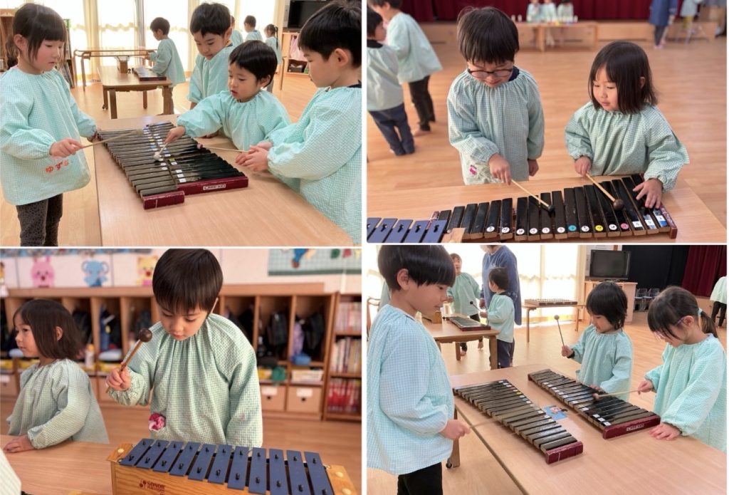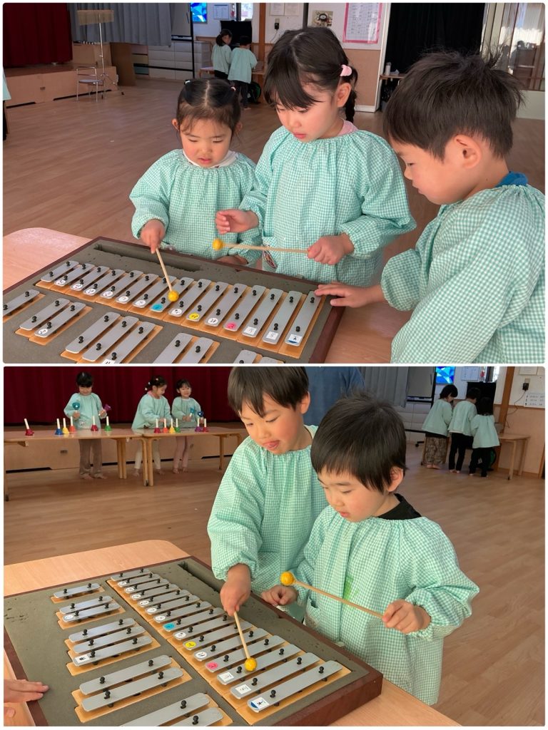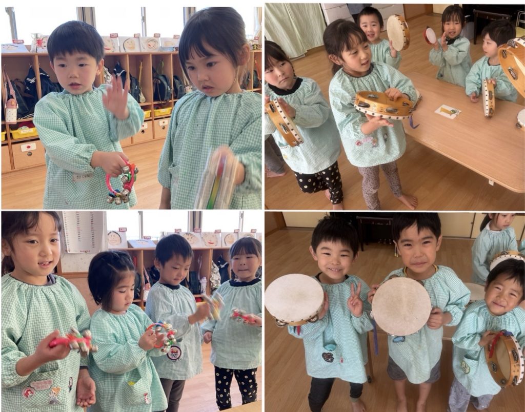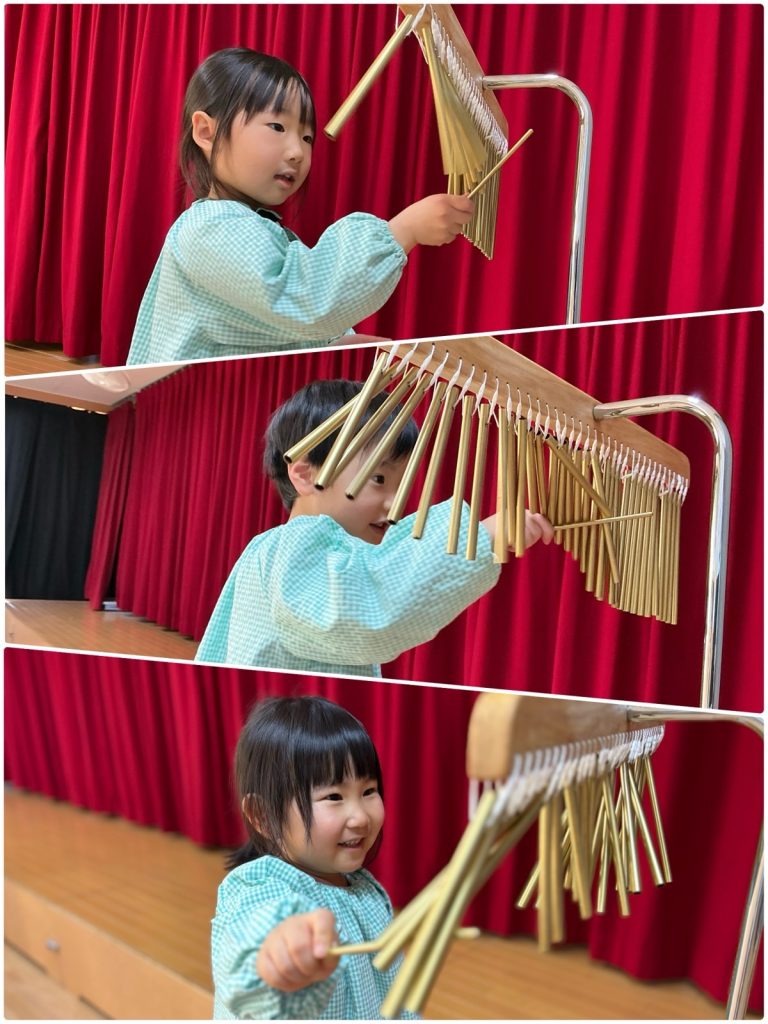 まつ組・たんぽぽ組・ちゅうりっぷ組が家族ごとに分かれて、いろんな種類の楽器を使い楽しみました🎹先生から木琴・鉄筋・電子ピアノ・鈴・タンブリン・カスタネットなどの使い方を教えてもらいました。使ったことのある楽器はもちろん初めての楽器もたくさんあって、トーンチャイムは「全部違う音だね」と話したり、シンバルは「すごく大きい音だね」とみんなとても楽しんでいました。