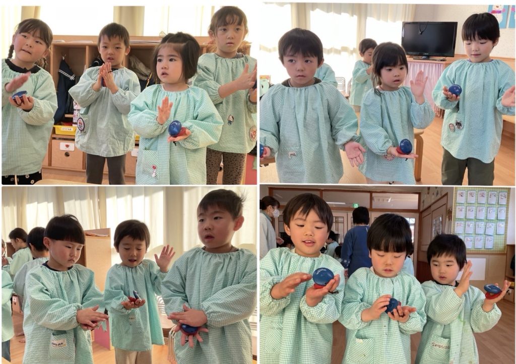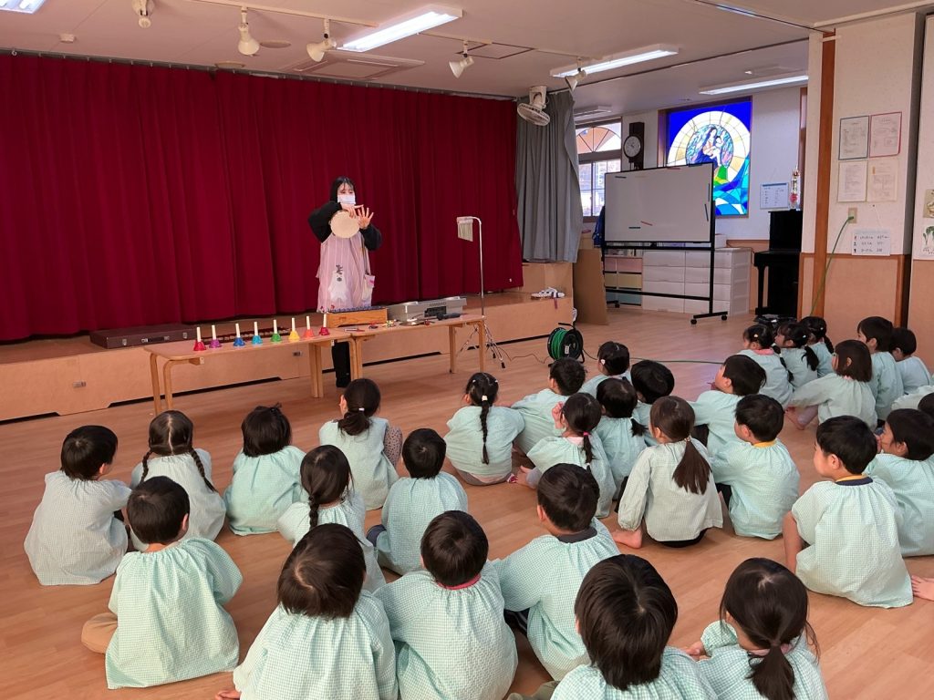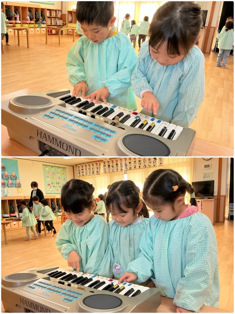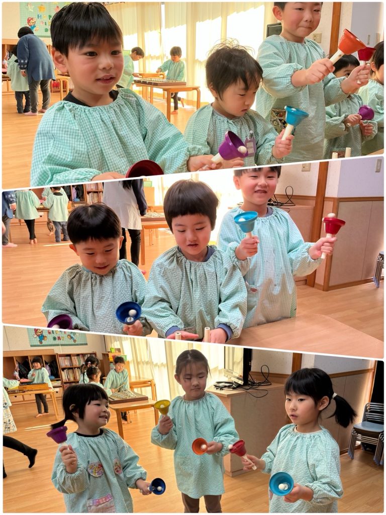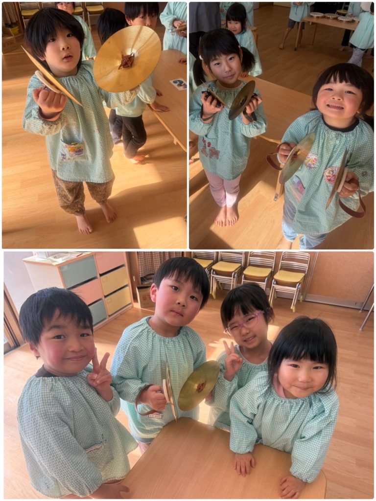 まつ組・たんぽぽ組・ちゅうりっぷ組が家族ごとに分かれて、いろんな種類の楽器を使い楽しみました🎹先生から木琴・鉄筋・電子ピアノ・鈴・タンブリン・カスタネットなどの使い方を教えてもらいました。使ったことのある楽器はもちろん初めての楽器もたくさんあって、トーンチャイムは「全部違う音だね」と話したり、シンバルは「すごく大きい音だね」とみんなとても楽しんでいました。