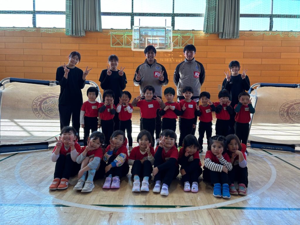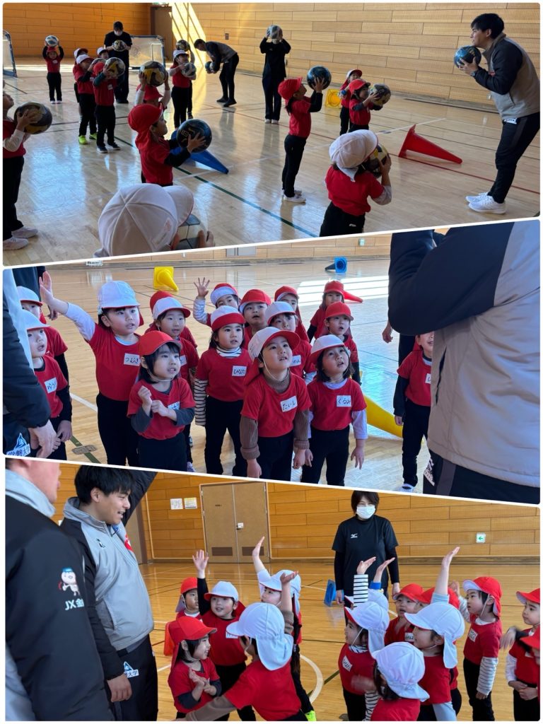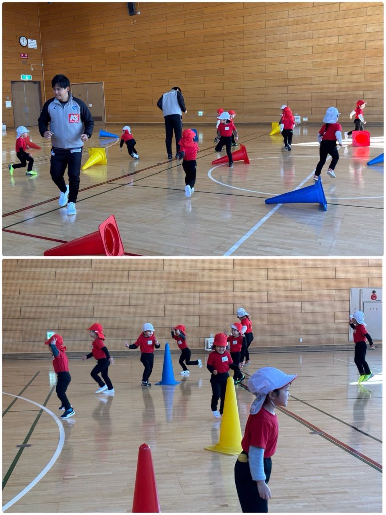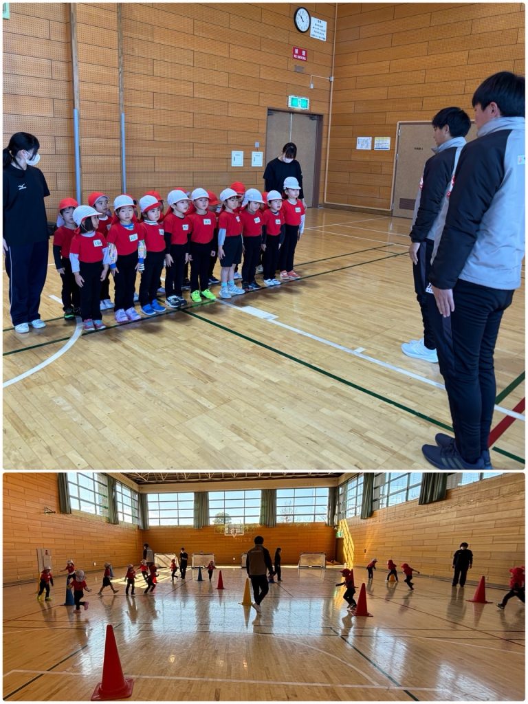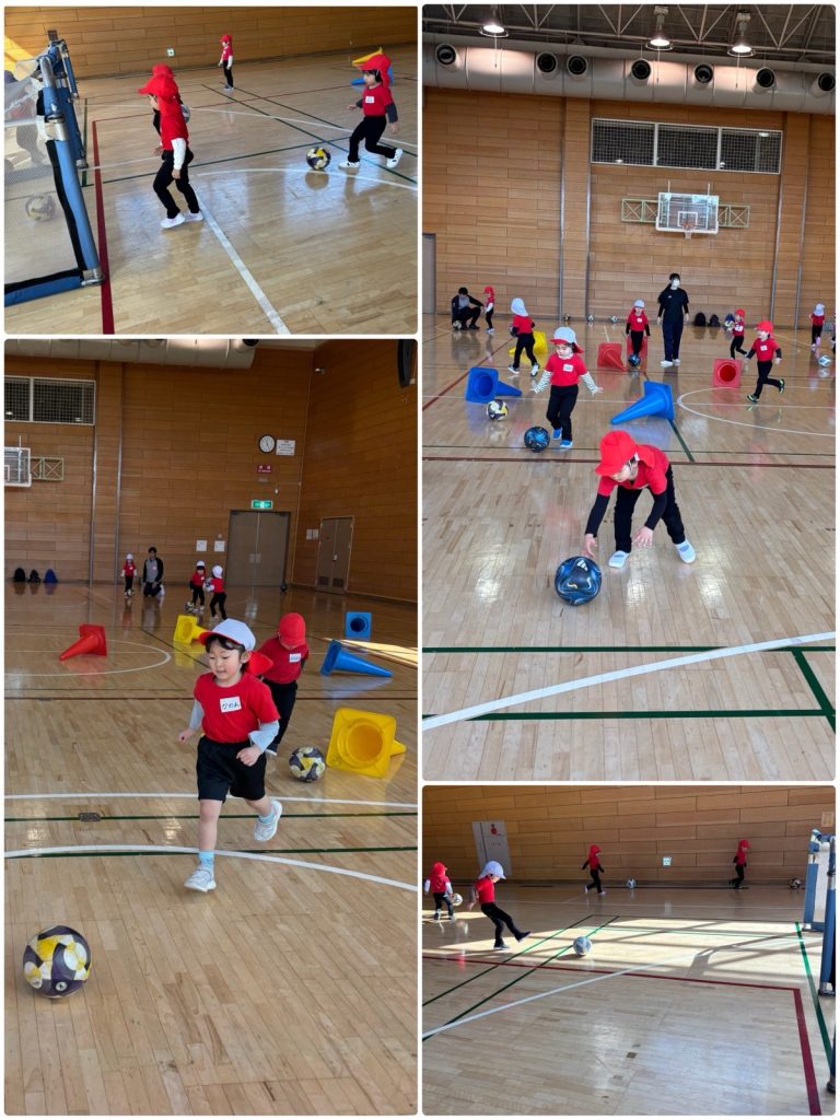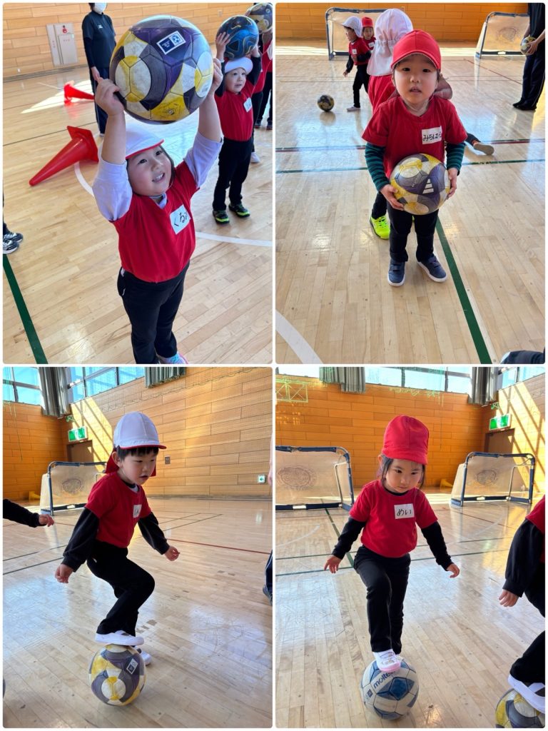 ちゅうりっぷ組が初めてのサッカー教室に行きました⚽️ホーリーホックの方に元気に「お願いします」のご挨拶をしてスタートです。最初はコーンにタッチしたり、カニさん跳びをしたり、体育館をたくさん動きました🏃ボールを1人ひとつずつ持って、手を使って体のまわりを回したり、ボールを足でとめたりしました。最後はゴールまで蹴って、シュートもしました⚽️とても楽しくサッカーができました😊ホーリーホックの皆さんありがとうございました😄