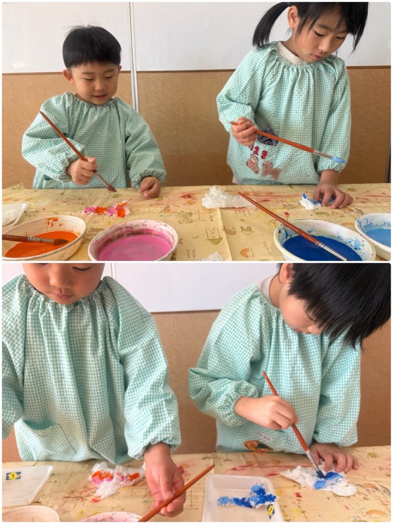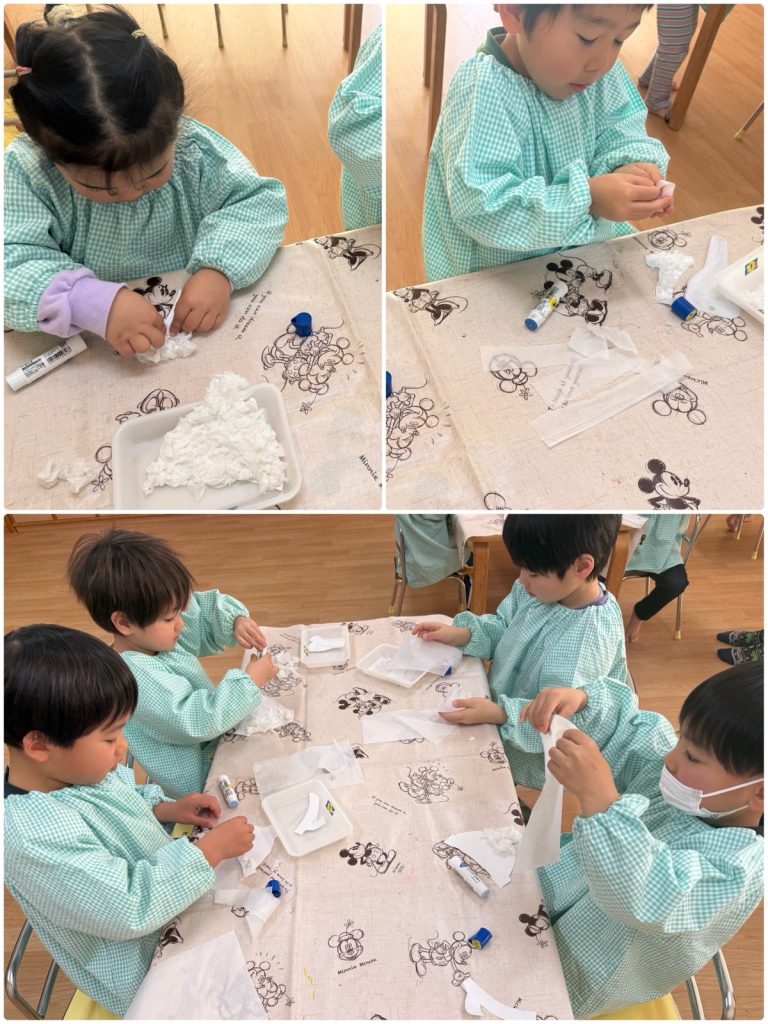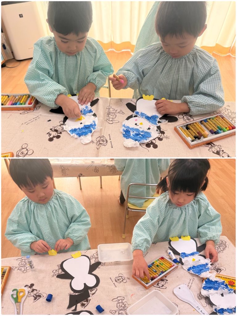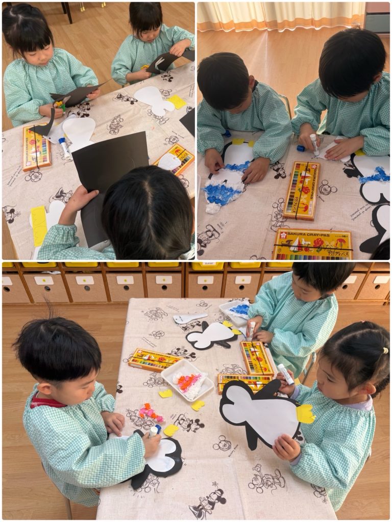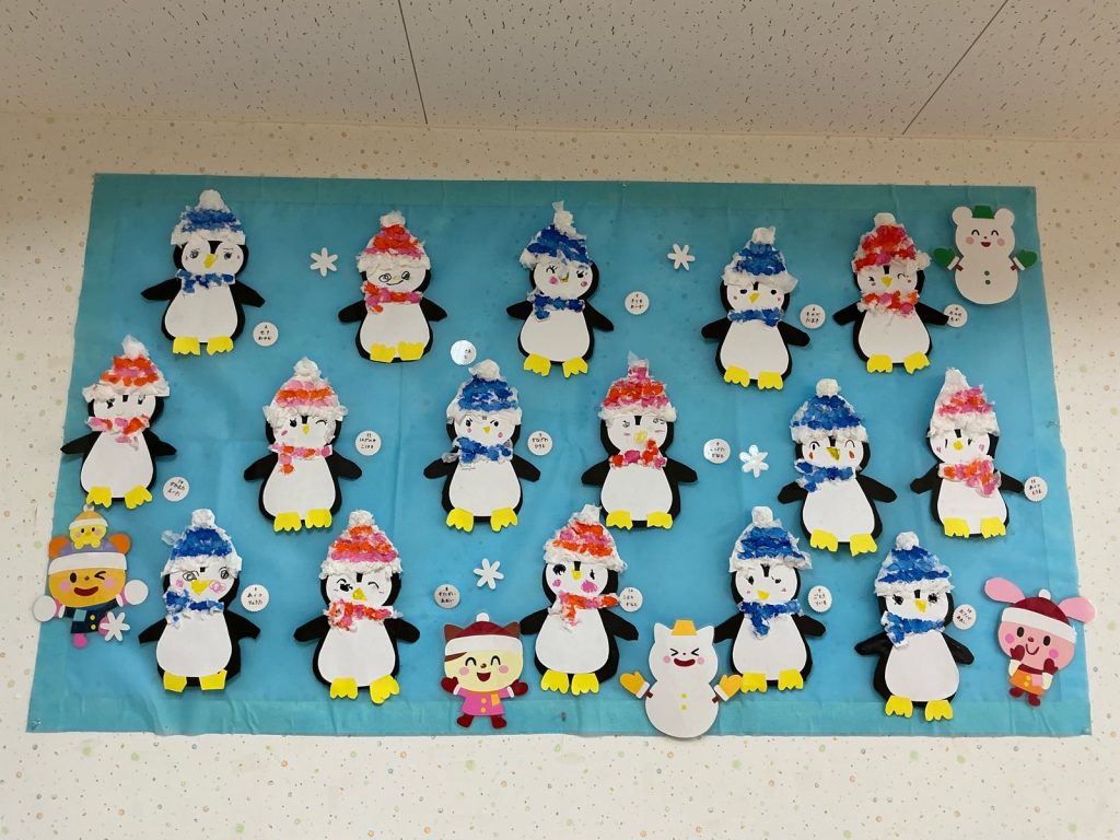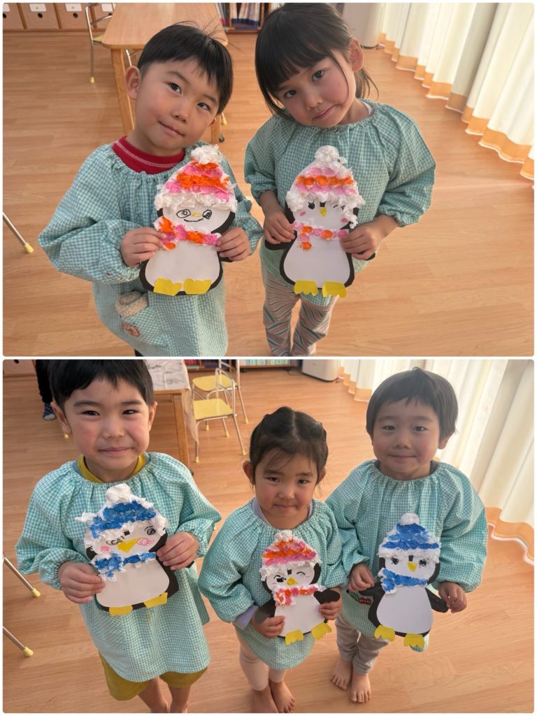 たんぽぽ組が壁面製作でペンギンを作りました。ハサミを使って、ペンギンの形を切ります。ちぎって、丸めたティッシュをのりで台紙に貼って、絵の具で色をつけました🖌️ペンギンの顔をクレヨンで描いて、帽子とマフラーをつけて完成です😊寒いけれど、マフラーと帽子をつけるとあったかいね🧶