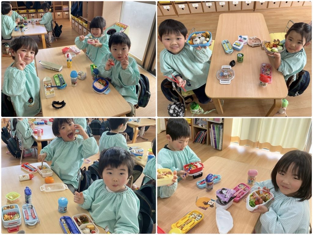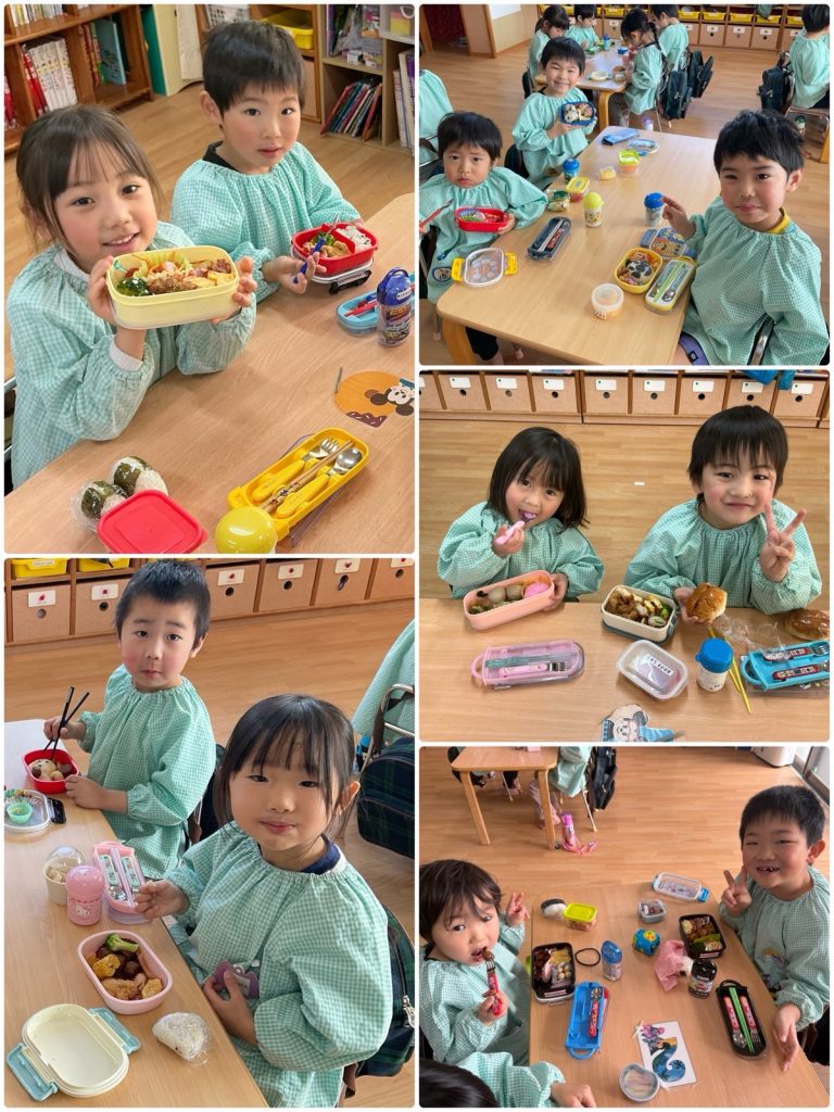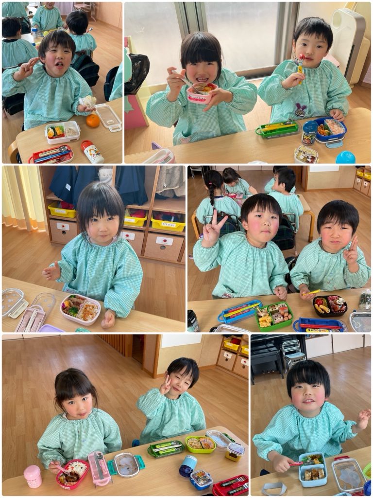 弁当の日、朝の登園はみんなにこにこ😊「お弁当持ってきた」「ウインナー入れてもらった」と教えてくれました。お昼の時間も待ち遠しいのか、「いつお弁当食べるの?」「早く食べたいな」とみんなウキウキ😆保育園の家族ごとに分かれて食べました。「美味しい」「これ見て〜」とグループごとに盛り上がっていました😋保護者の皆さんお忙しいのにお弁当ありがとうございました❣️みんな大喜びでいただきました。