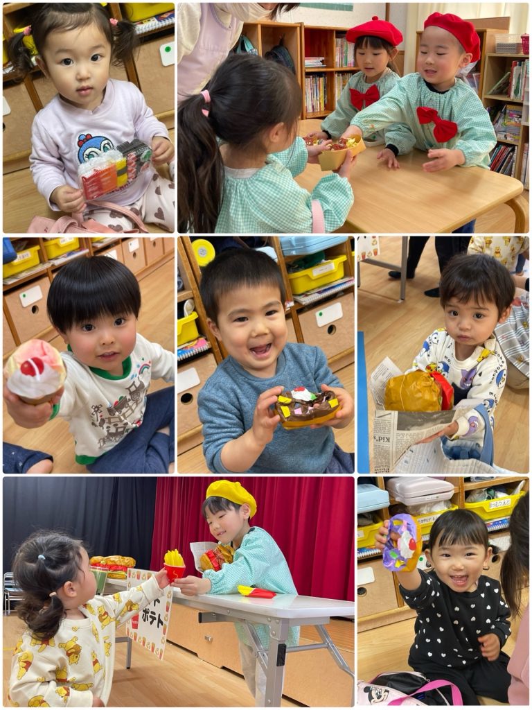 家族でお買い物に行きました。「ハンバーガー・ポテト」「お寿司」「ドーナツ」「ドリンク」「クレープ」「ラーメン「ピザ」「アイス」「たこ焼き」とたくさんのお店屋さんが並んでいます。みんなとても嬉しそうに、何が買えるのか、お店を見てまわりました😊「クレープ美味しそう」「ポテト食べたい」とお買い物に意欲満々👛バックにたくさんお土産を買いました🍔楽しかったね☺️