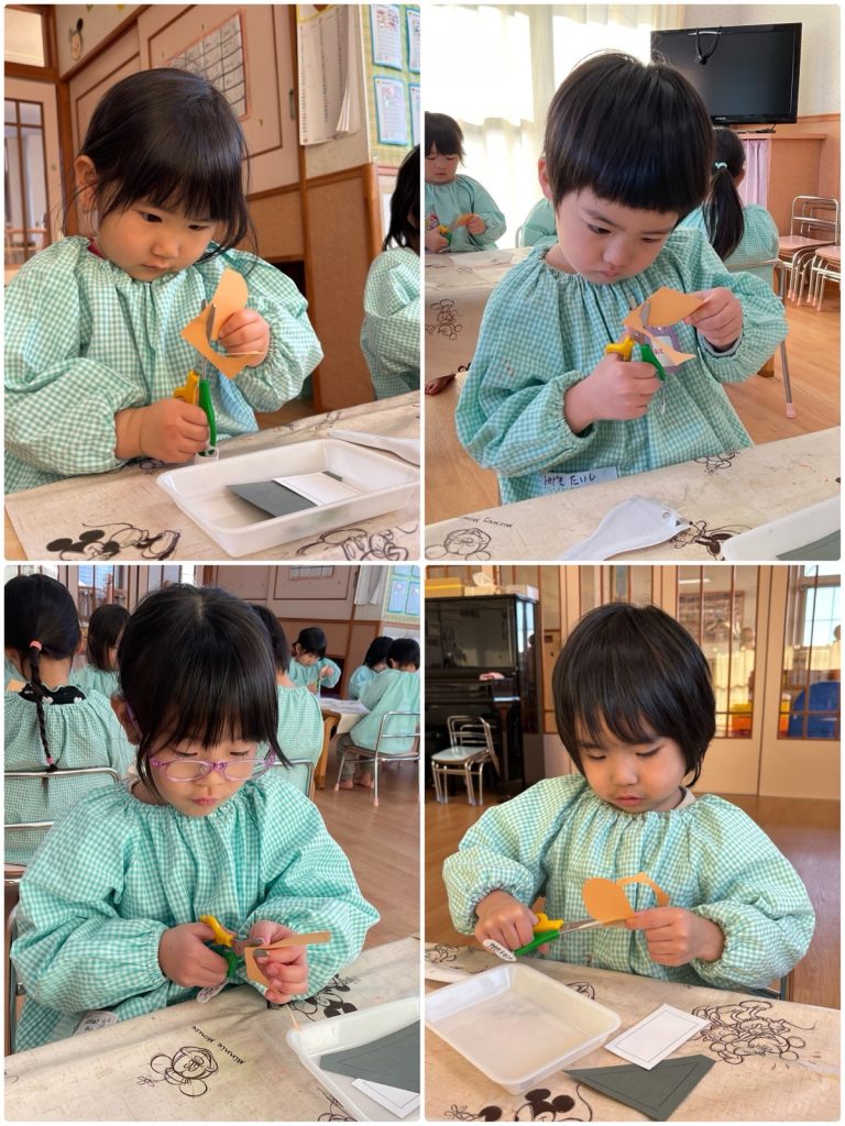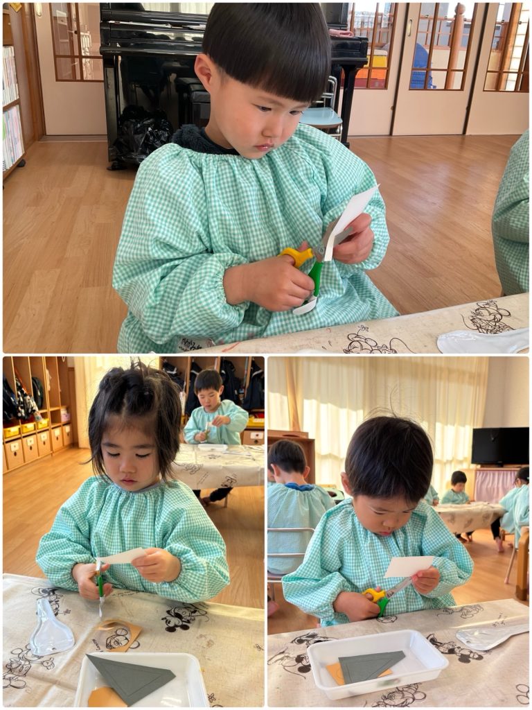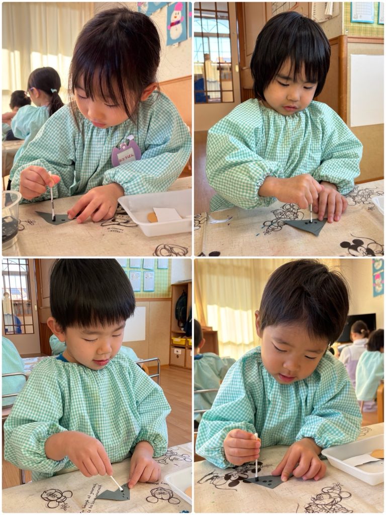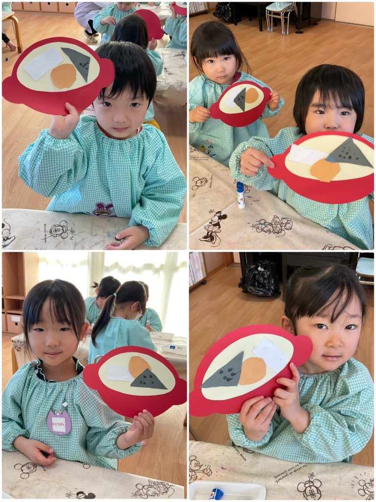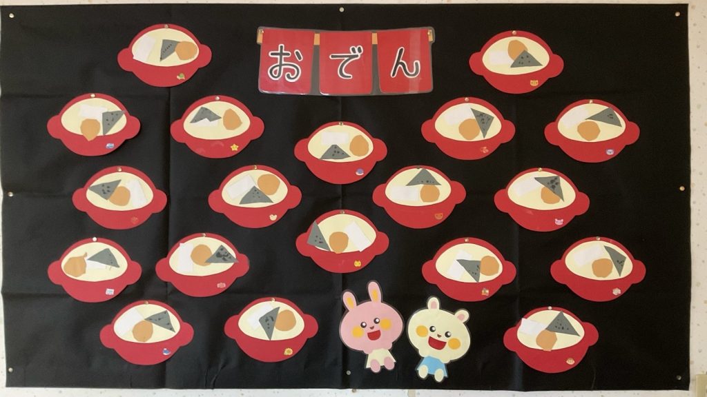 ちゅうりっぷ組が壁面製作でおでんを作りました🍢煮卵にはんぺん、こんにゃくをハサミで切って、こんにゃくには綿棒スタンプでひじきも入れました。あったかいお鍋にだし汁入れて、具を入れました😊寒い日に熱々おでん🍢みんなで美味しくいただきま〜す😋