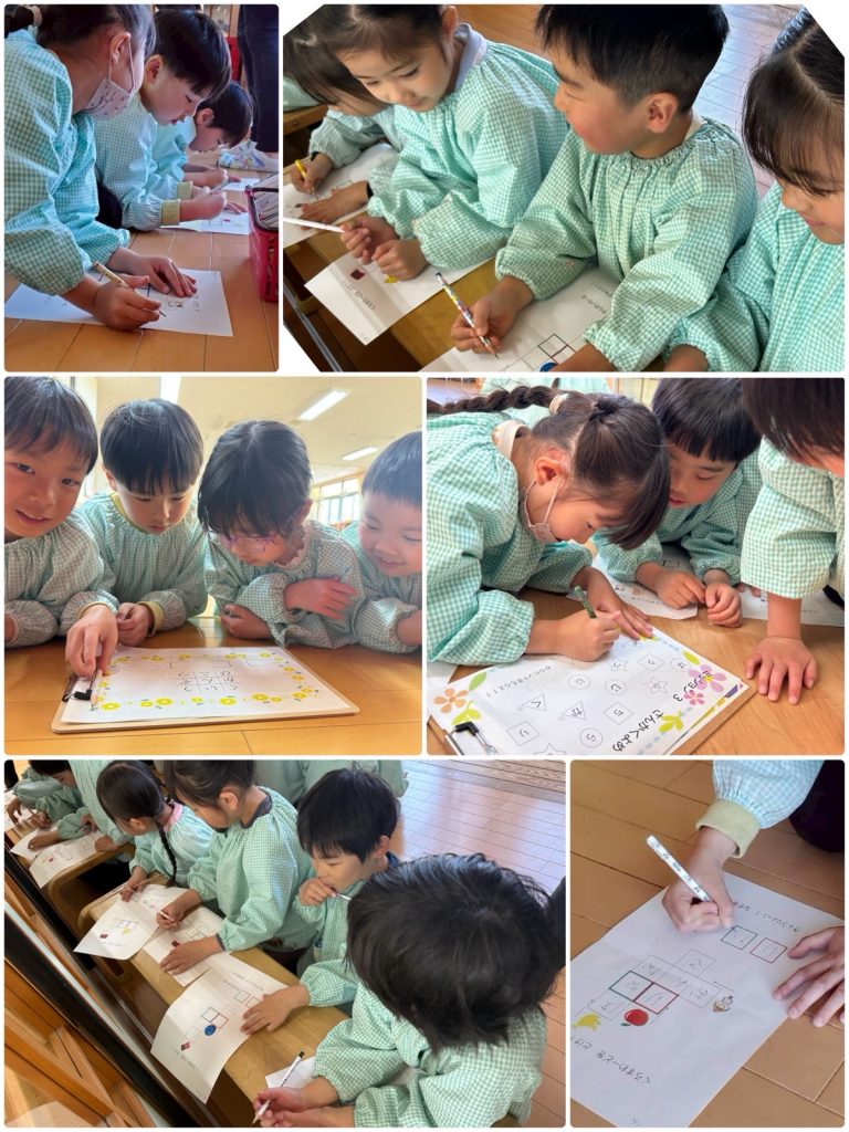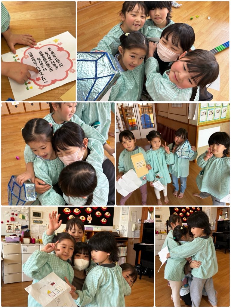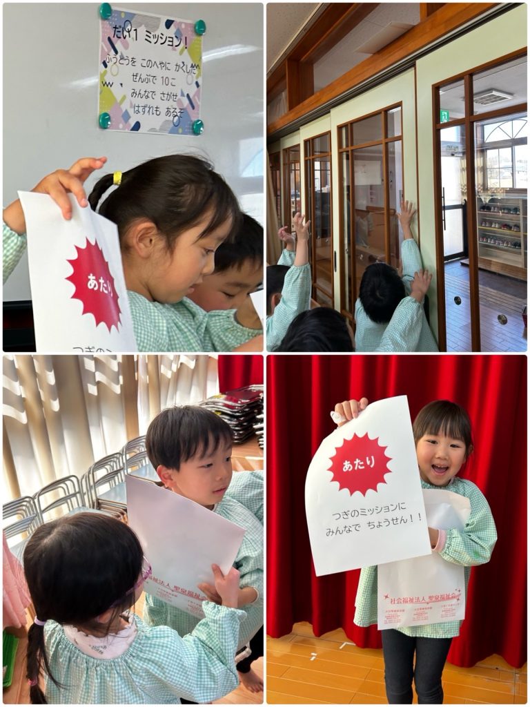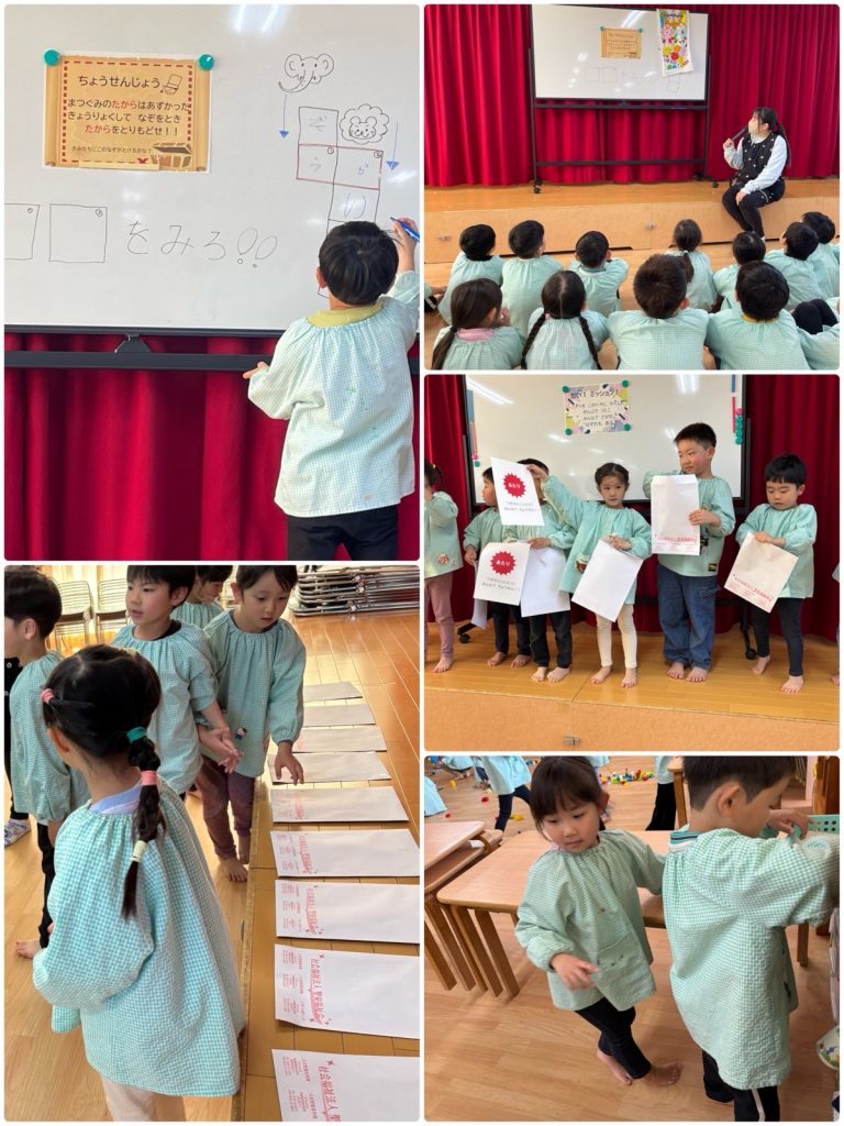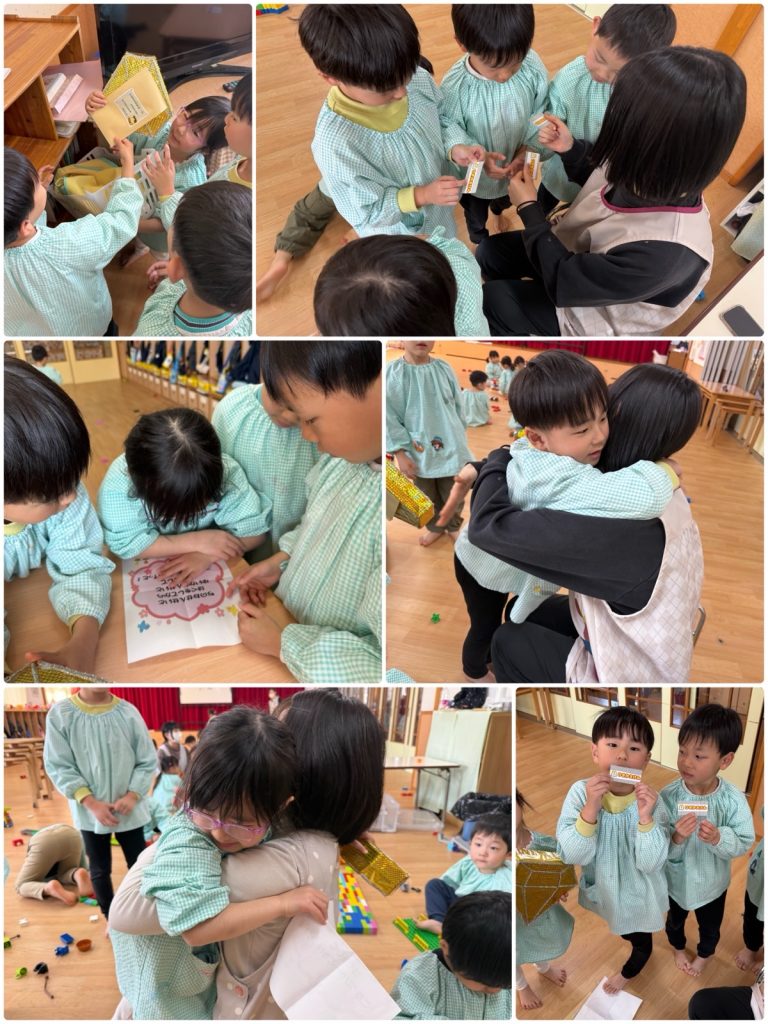 まつ組の教室に挑戦状が届きました✉️「みんなで協力して、ミッションをクリアせよ」まつ組は気合十分!!まずは教室の中に隠された封筒を探し、当たりの封筒の中には次のミッションが❗️グループに分かれて謎解きをしました。それを解くと先生の名前が出てきました👨🏫その先生と一緒に次のミッションへ❗️最後までクリアすると、大好きな先生たちとハグ🤗そして、引換券をもらいました💳さて、何の引換券でしょう!?明日をお楽しみに😆