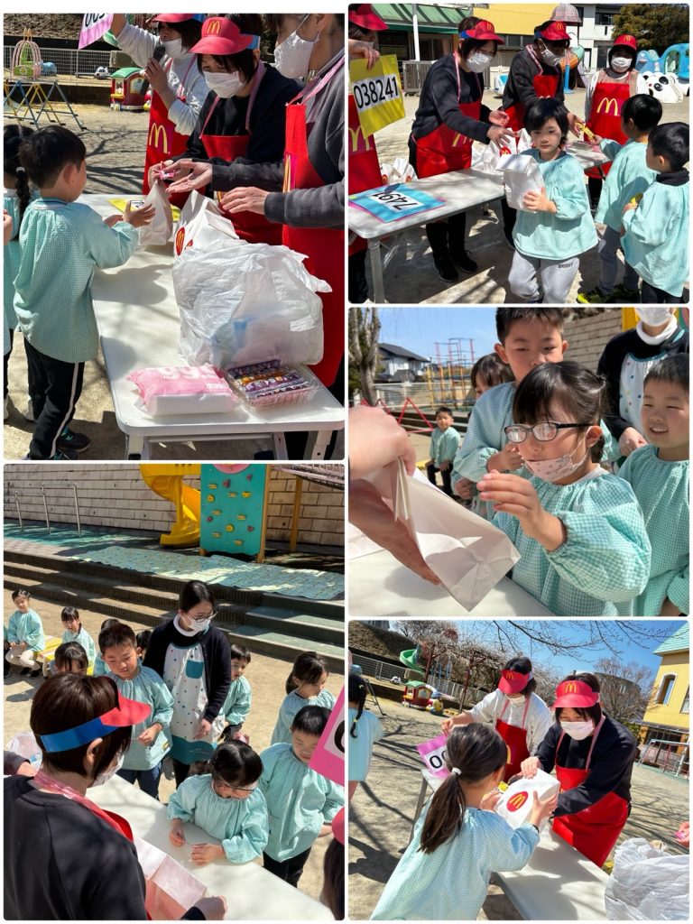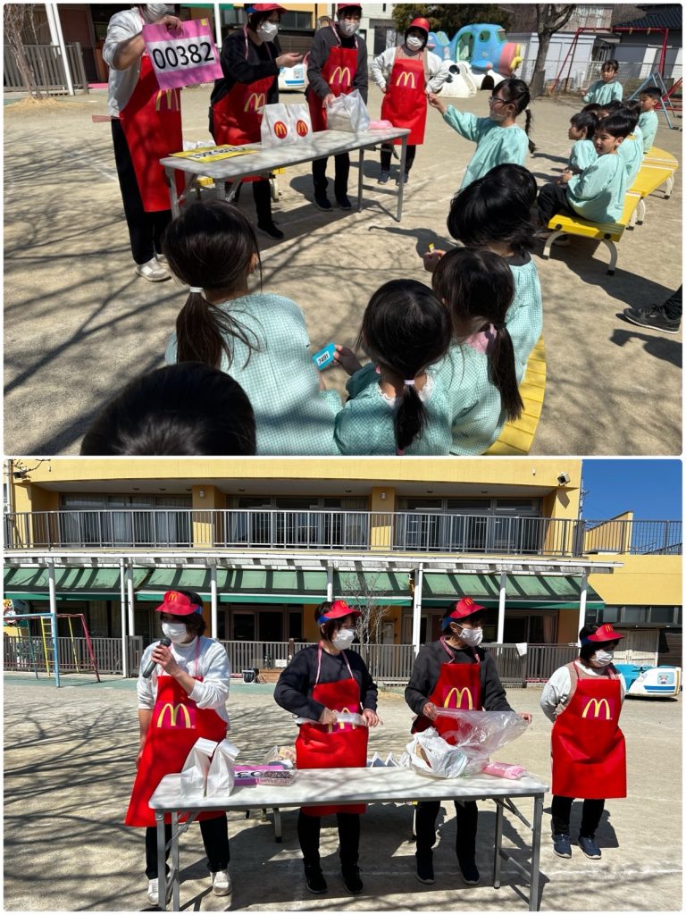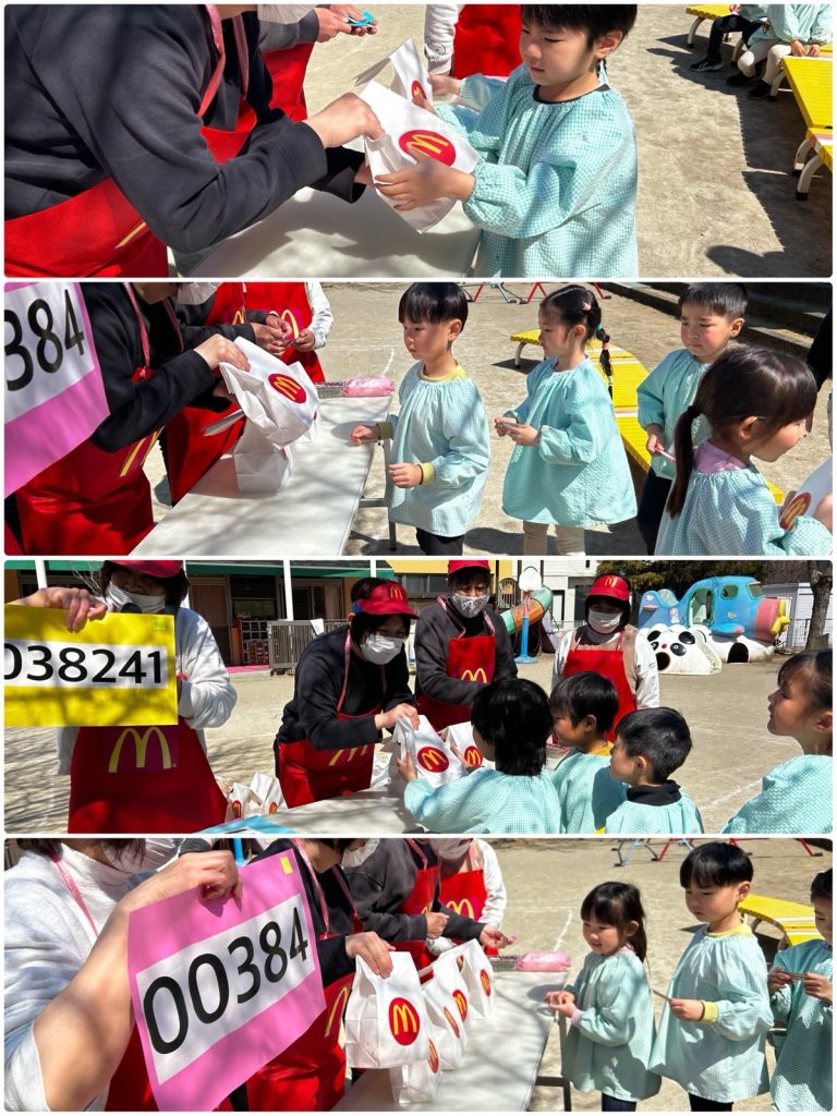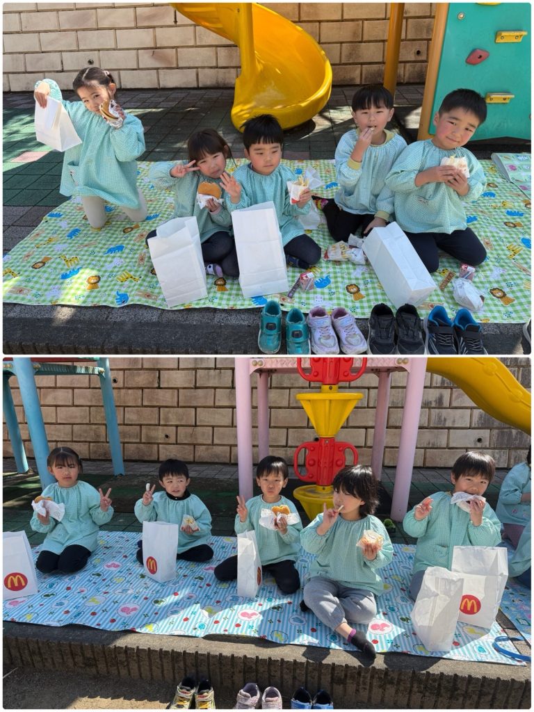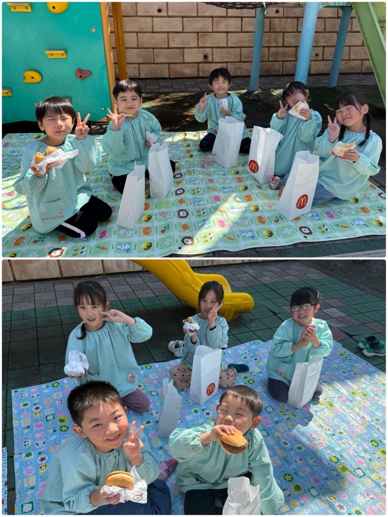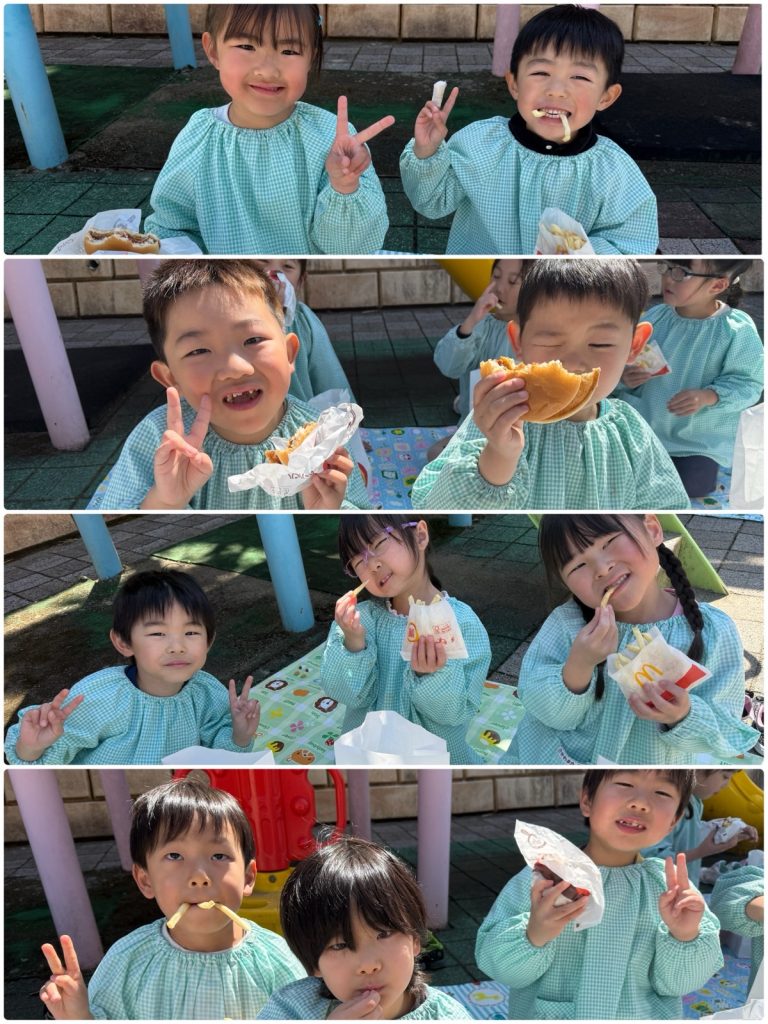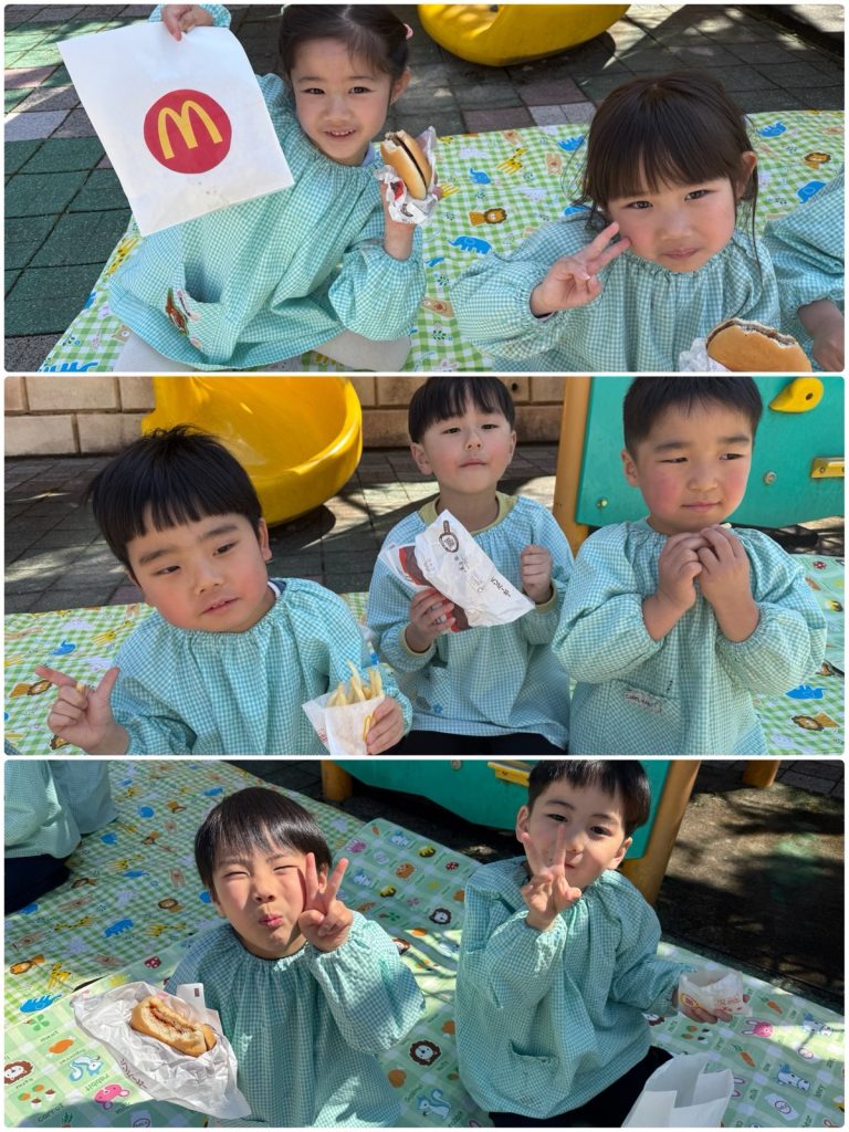 昨日のミッションご褒美はマックの引換券でした💳「マックを頼む時はどうしたらいいかな!?」と言う先生からの質問に「ウーバーで頼む!?」「マックのアプリでも頼めるよね」とみんな慣れた感じで答えてくれました😆今回は電話で注文しました。「マック特別出張✨あおぞら野中町店のオープンです」ベテランのスタッフがテキパキと呼び出しをして、マックの特別セットを用意してくれました🍟ゲームで保育園中を散策し、大好きな先生・たんぽぽ・ちゅうりっぷ・ふじ・ばらのみんなともふれあいそして、運動場で園舎を見ながら大好きな友だちとランチです🍔とても楽しかったね😊