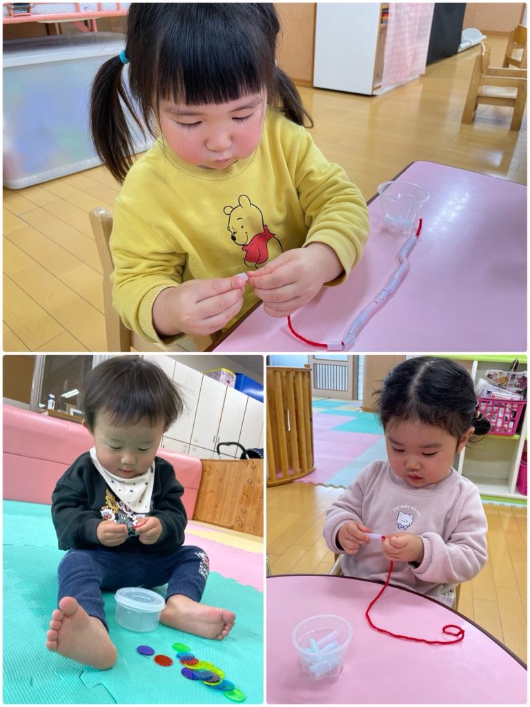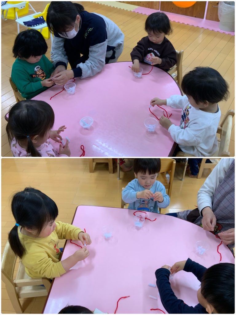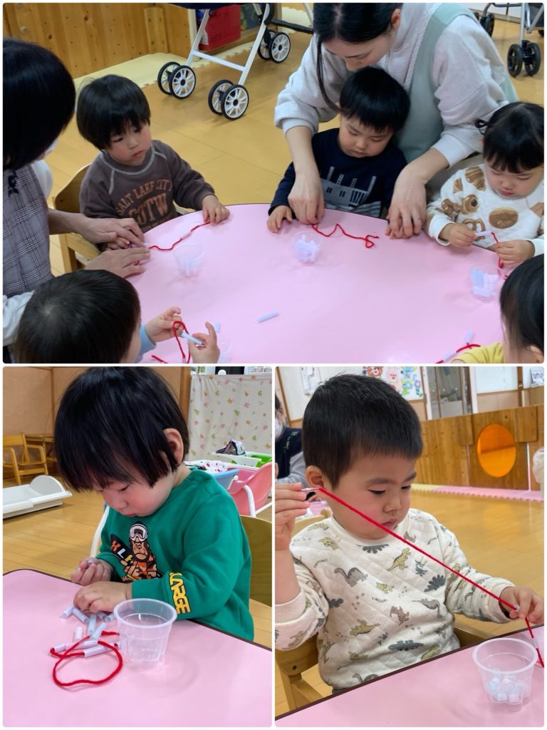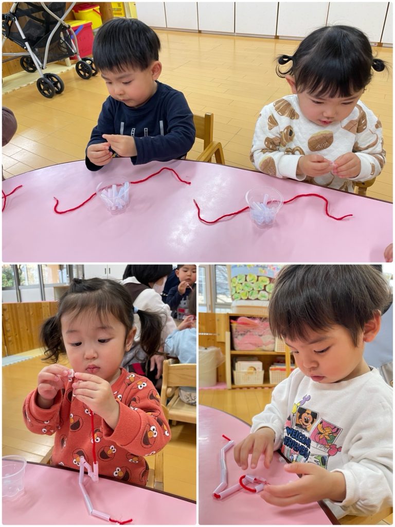 ばら組が、ストロー通しをしました。指先を使って、細いストローに毛糸を通します。ストローを掴む親指と人差し指の力も入れすぎると、ストローがつぶれてしまうため、上手に持たないとなかなか通せません。何度もやるうちに、スムーズに通せるようになりました😊指先が上手に使えると、製作や楽器、給食などの食具を持つのにもつながります。これからもいろんなことにチャレンジしようね😌