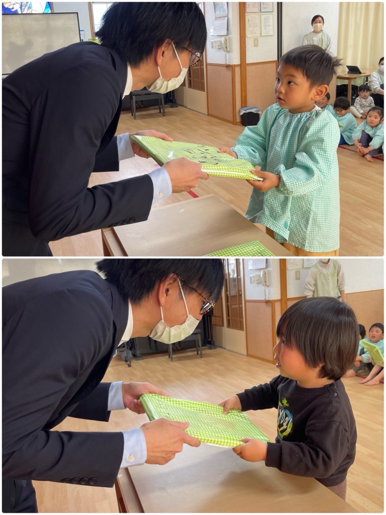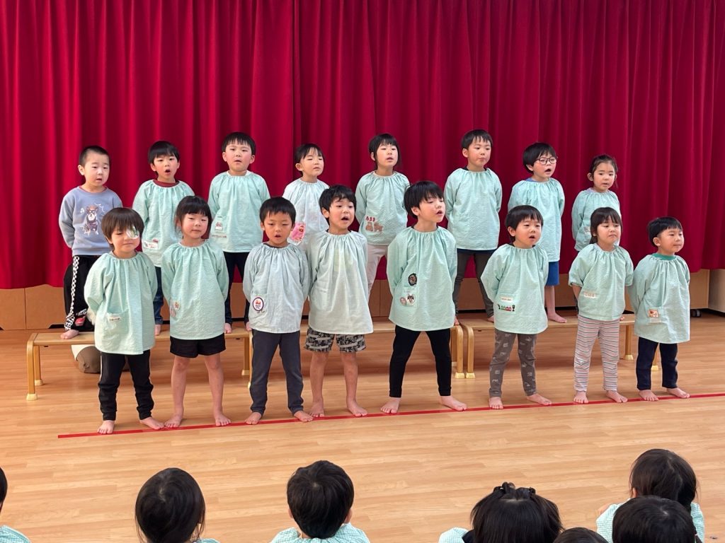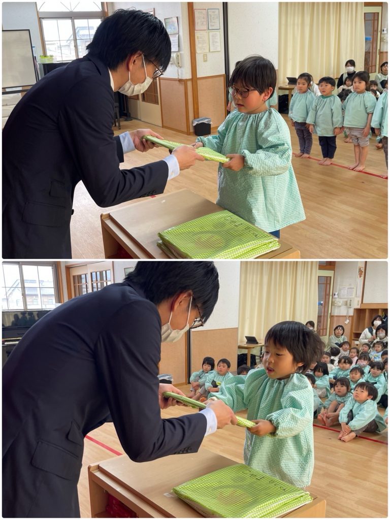 今年度の保育修了式を行いました。クラスごとに代表のお友だちが園長先生から1年間頑張ったご褒美をいただきました。たんぽぽ組が歌の発表をして、見守っていたまつ組のお友だちに園長先生がインタビューをすると「とてもかっこよかったです。」「すごく上手でした。」と褒めてくれました。進級の準備もしてきたので、新しいクラスでも自信を持って頑張ろうね😊1年間ご協力ありがとうございました。