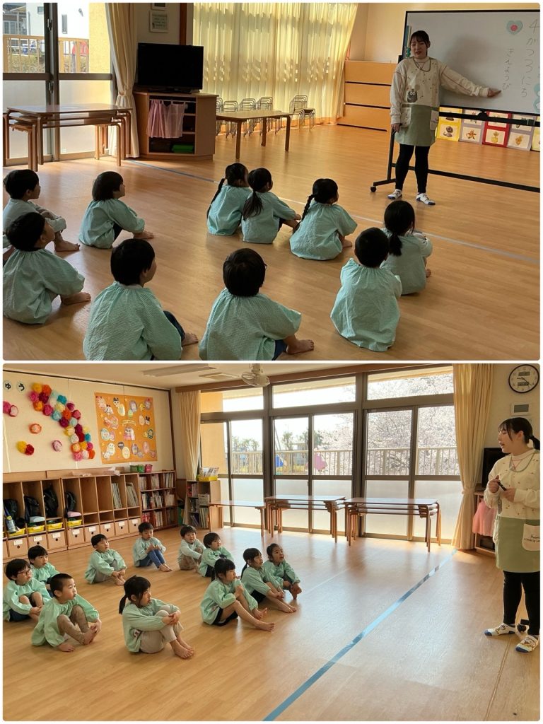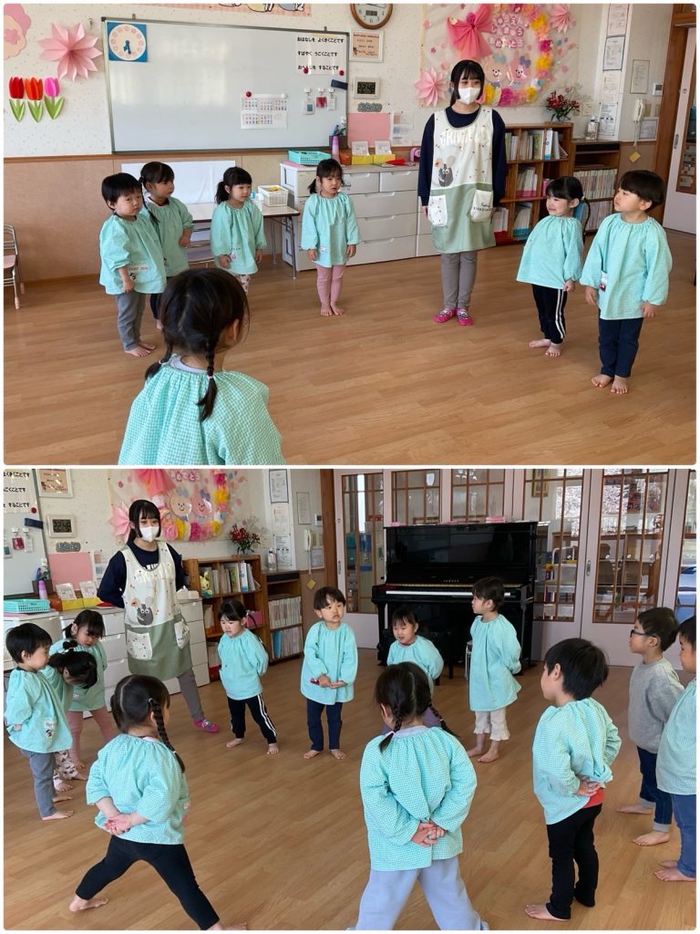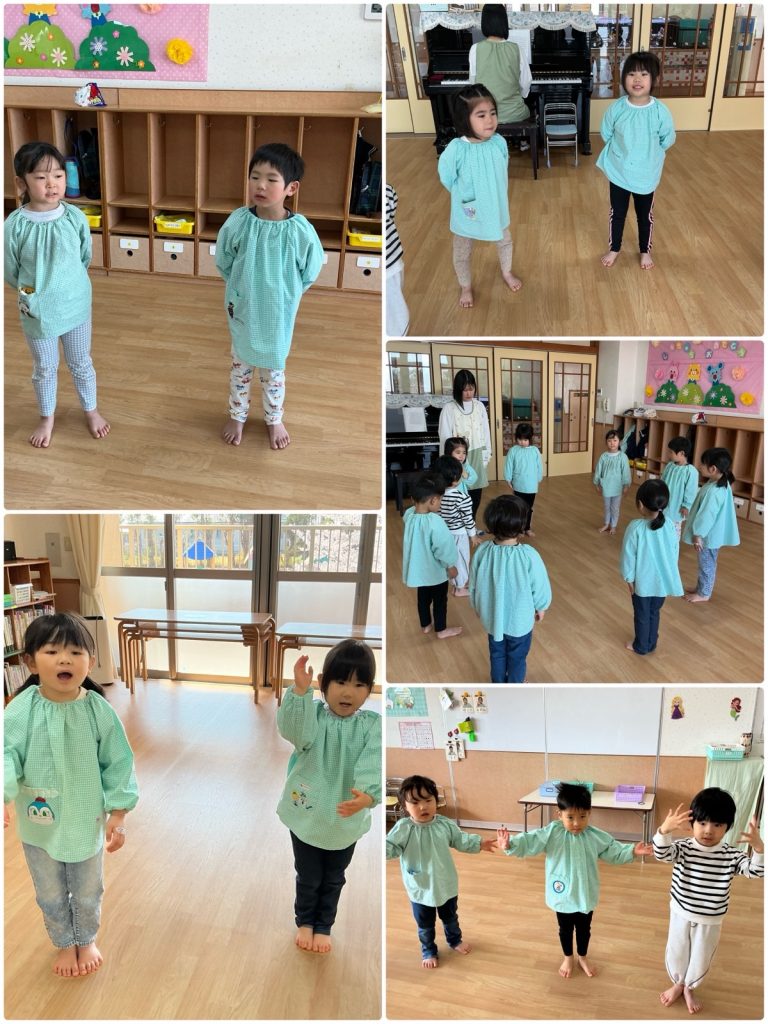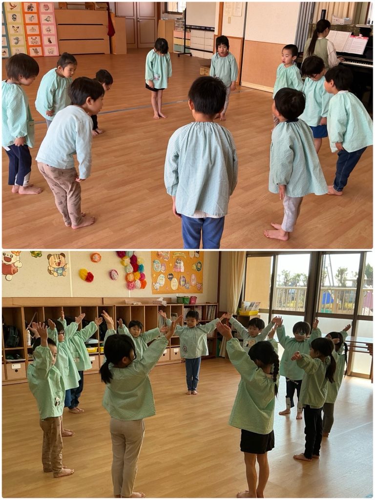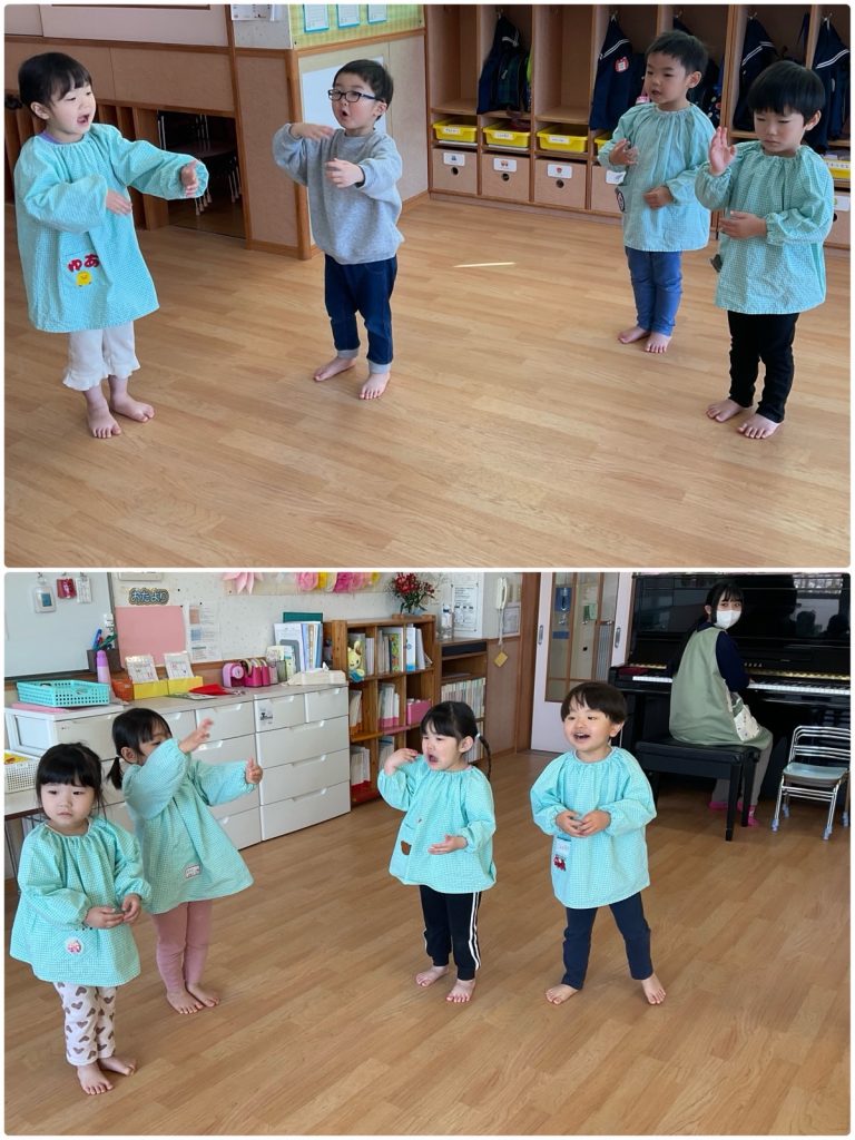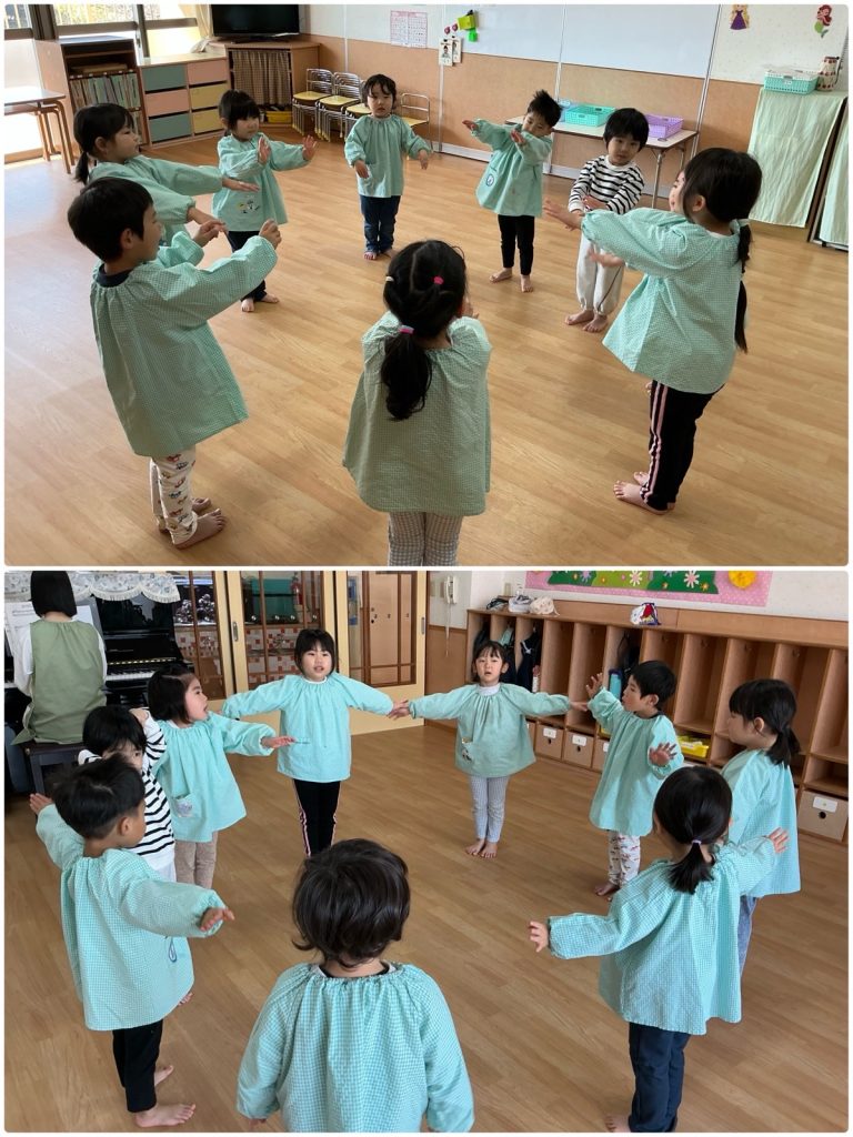 毎日クラスごとに朝の会をしています。「むすんでひらいて」と「手をたたきましょう」を元気に歌いました。先生と日にちの確認を一緒にして、英語でも言います。人数確認や、お当番活動もしています。今日も元気に1日がスタートしました😊