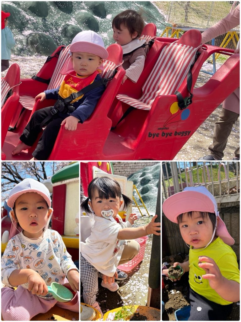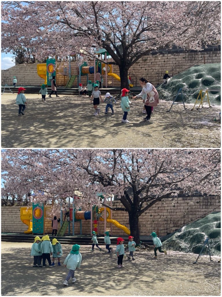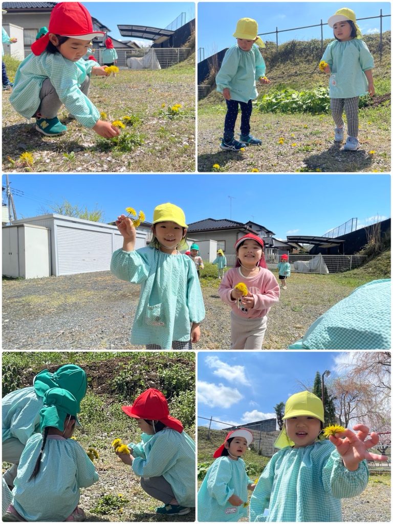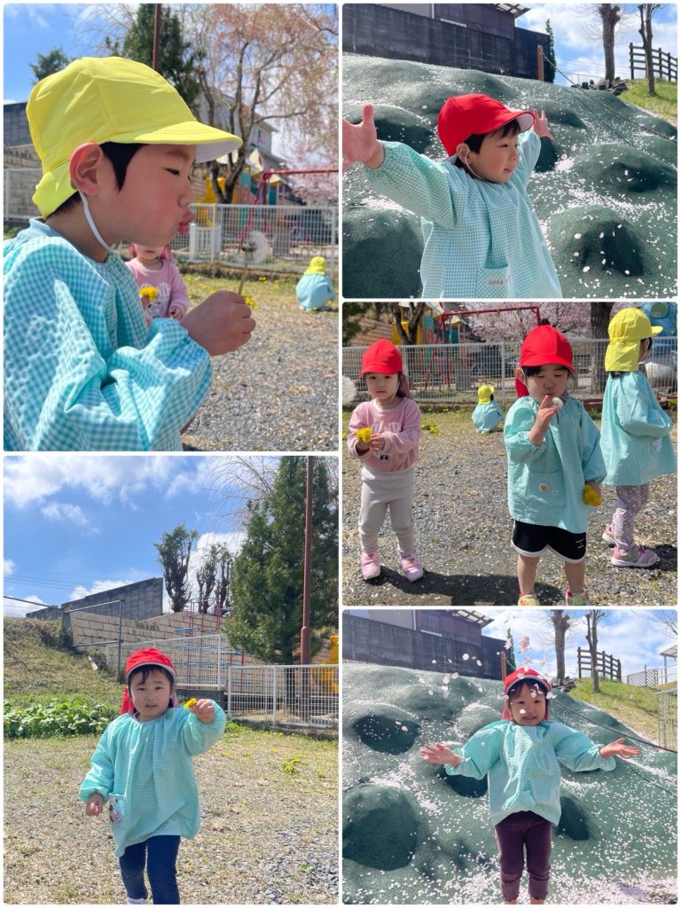 今日はぽかぽか陽気のいいお天気で、みんなで戸外遊びをしました☺️ふじ組は自分で靴を履いて準備をして戸外に出ました。たんぽぽもたくさん咲いていて、たんぽぽ摘みをしたり、わたげを「ふ〜」っと吹いて喜んでいました😊桜も風で花びらがとんでくると、「きれいだね」「つかまえよう」ととても楽しそう🌸たくさん春を感じました😄