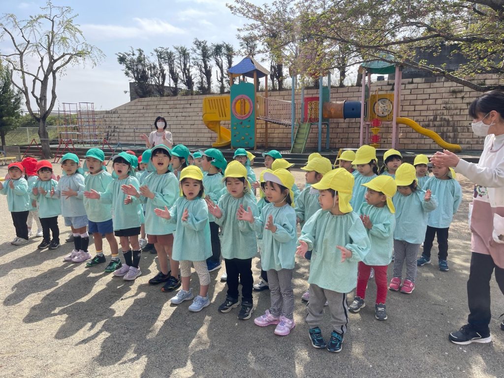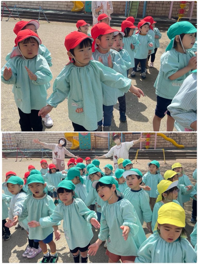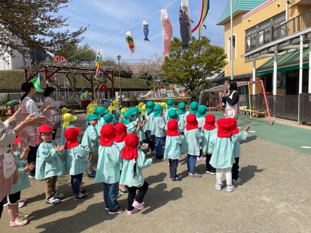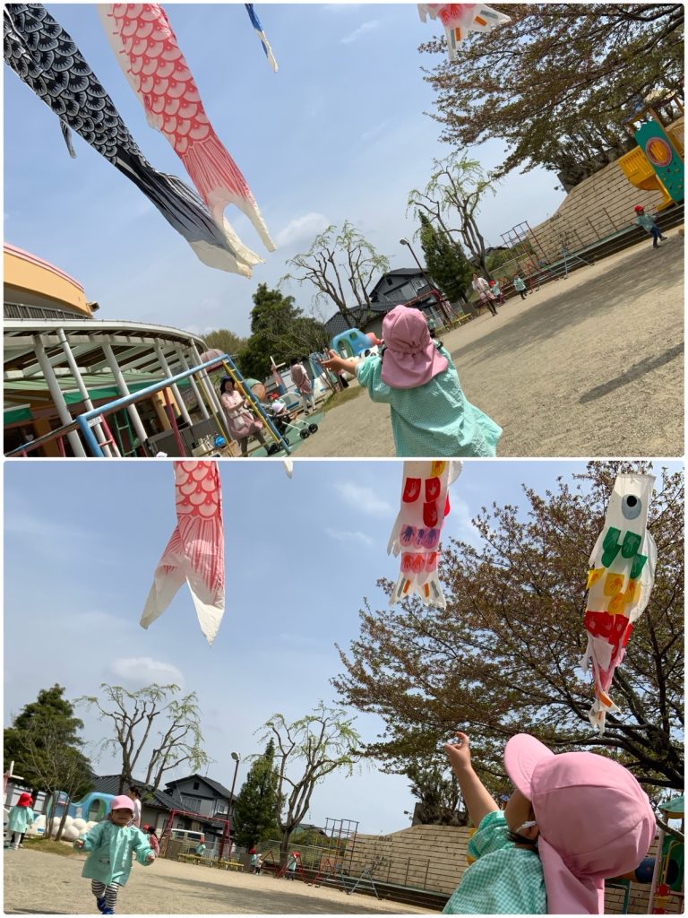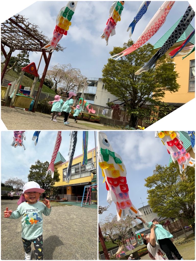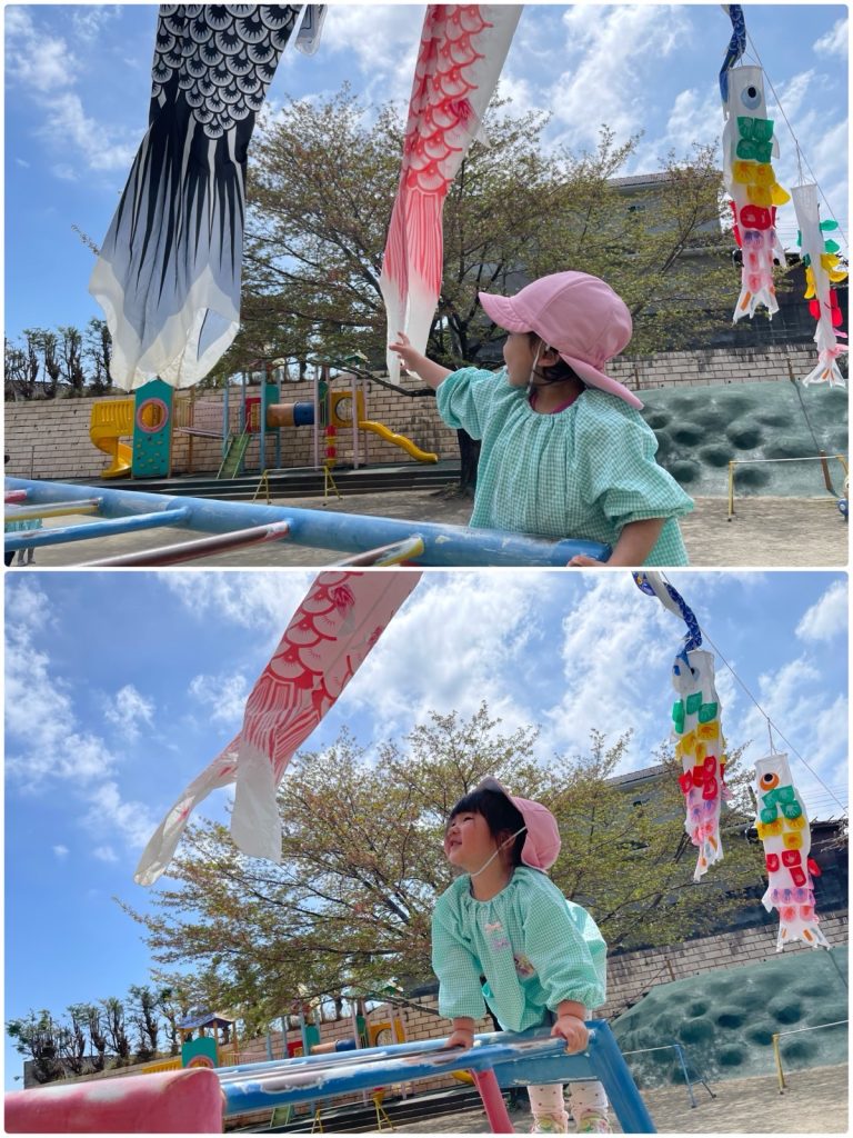 朝の会で「こいのぼり」の歌を歌うと、保育園の鯉のぼりも空にのぼり、元気に泳ぎ出しました🎏みんなの手型で作った鯉のぼりも泳いでいます。「あれ僕の手かな!?」「まつ組はみどりだよね」と話す子どもたち😊ばら組、ふじ組も鯉のぼりに触りたくて、一生懸命手をのばしていました。これから毎日楽しみだね😄