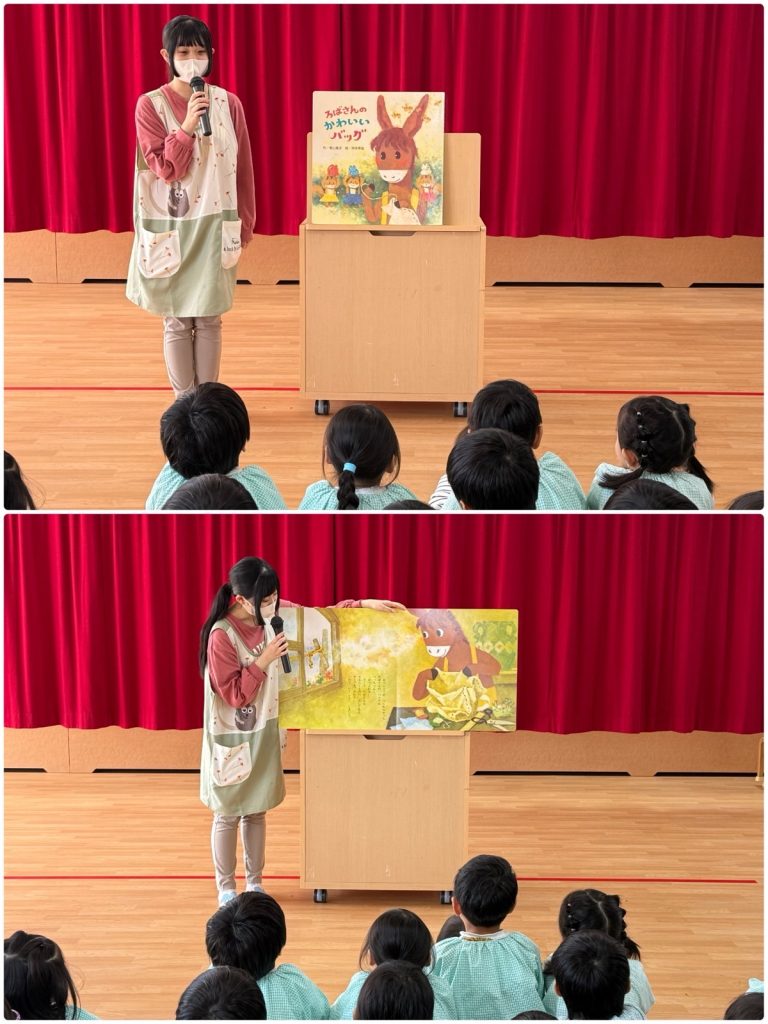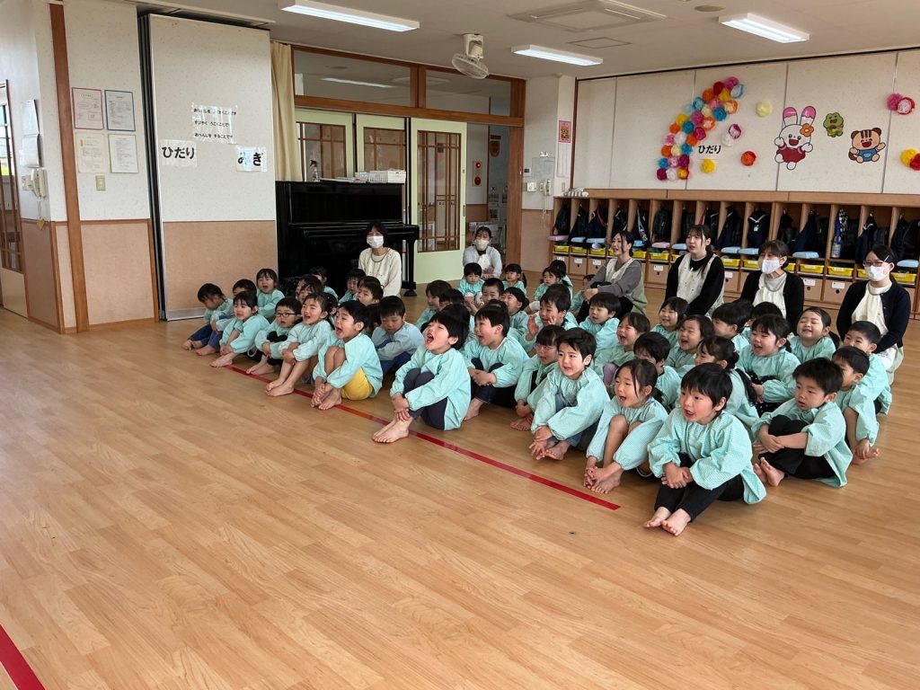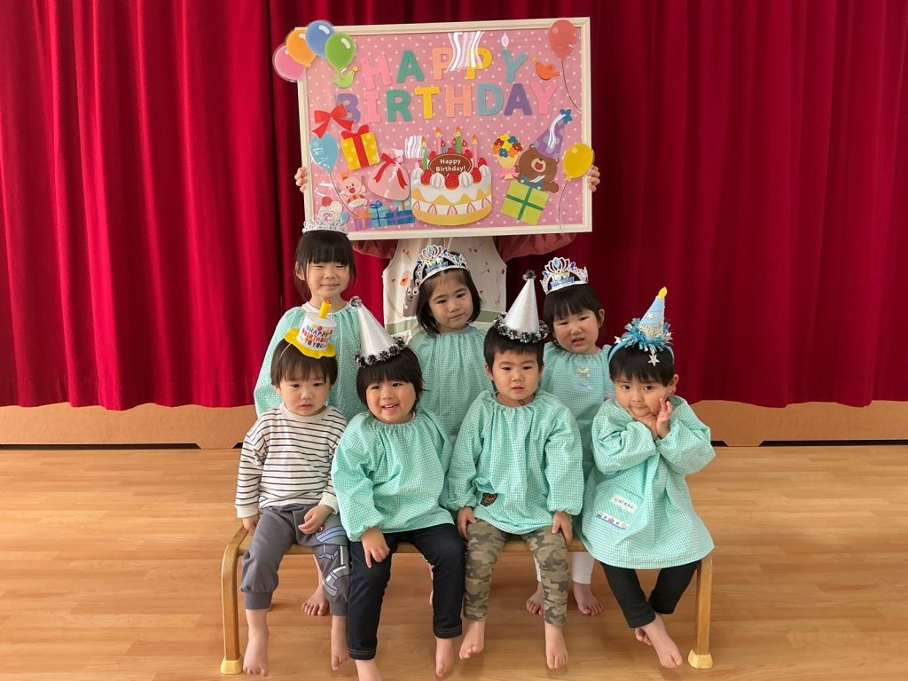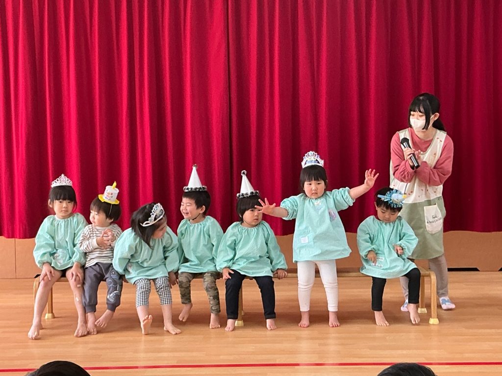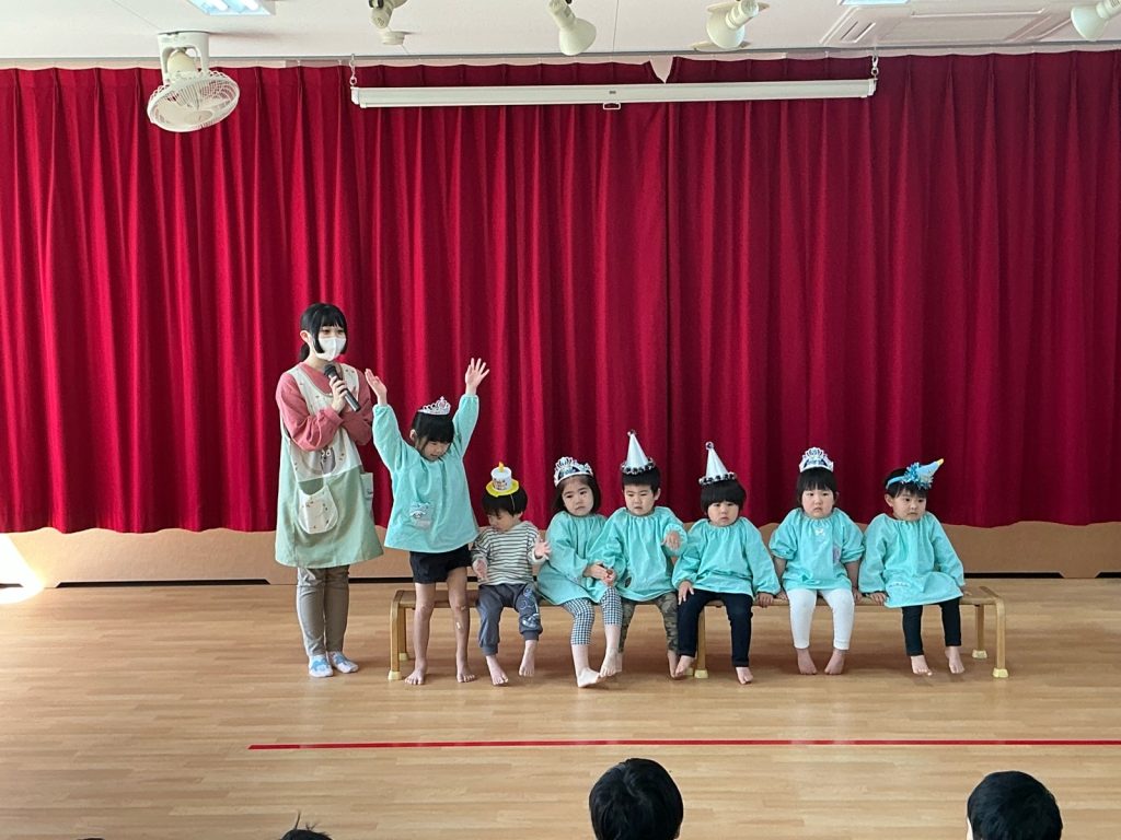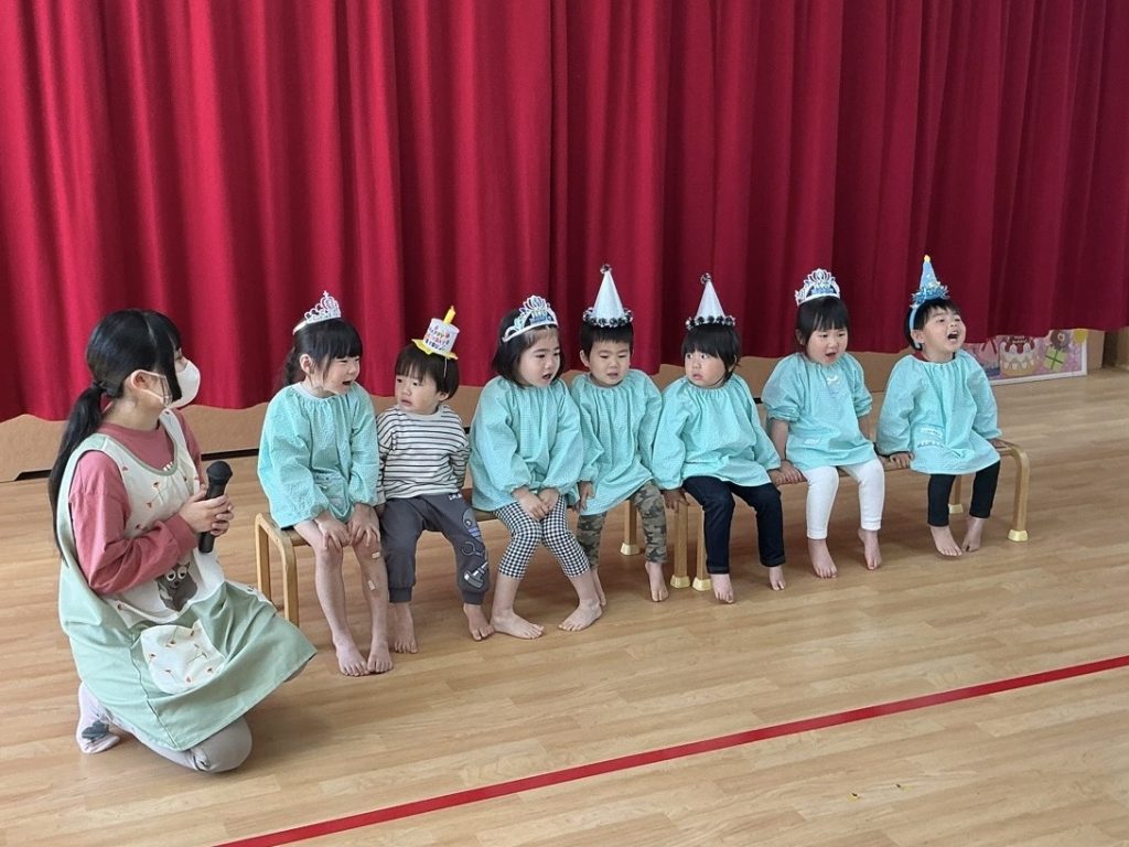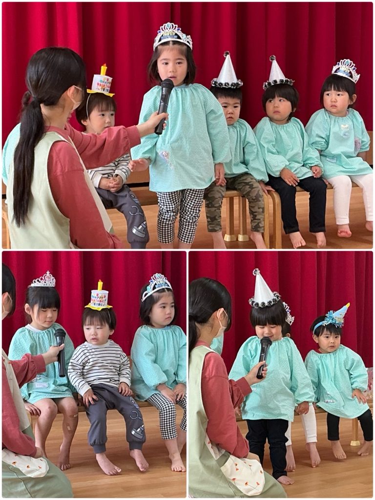 4月生まれのお誕生会を行いました。今年初めてのお誕生会だったので、少し緊張気味のお友だち。それでも、インタビューが始まると名前とプレゼントに欲しいものを全員が答えてくれました😊プレゼント楽しみだね🎁お誕生日おめでとう🎂第2部は大型絵本を見ました。色んな動物が出てきたので、みんなでお話の中に何が出てきたか答え合わせをしました😄