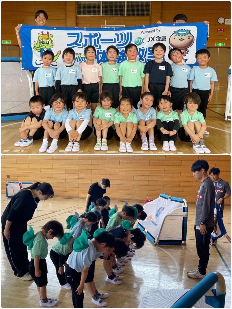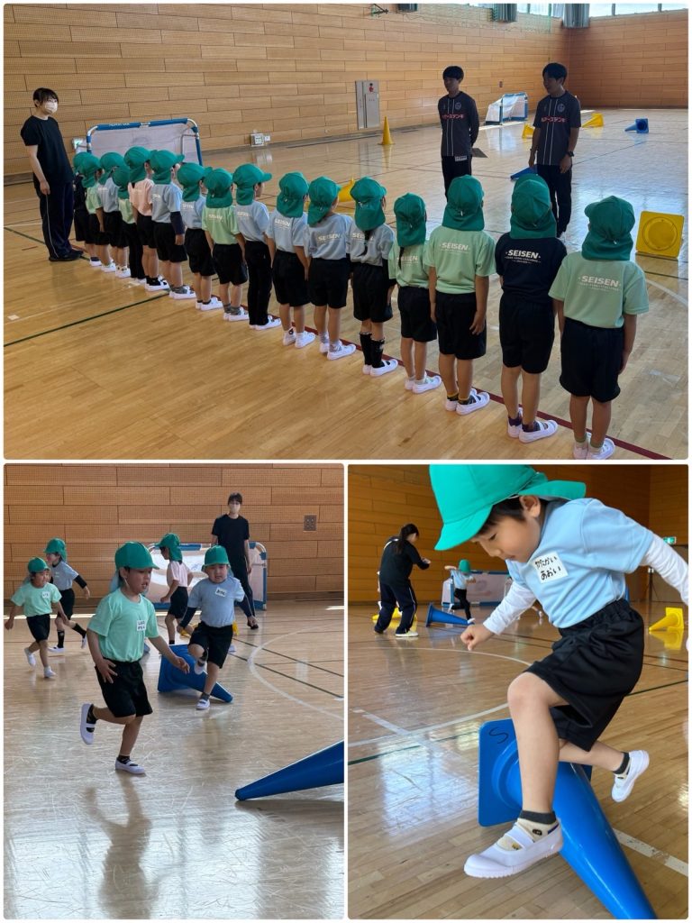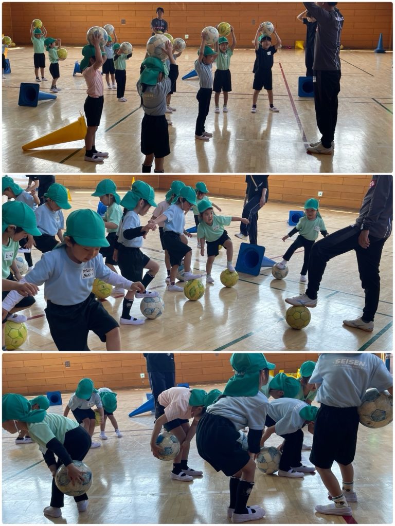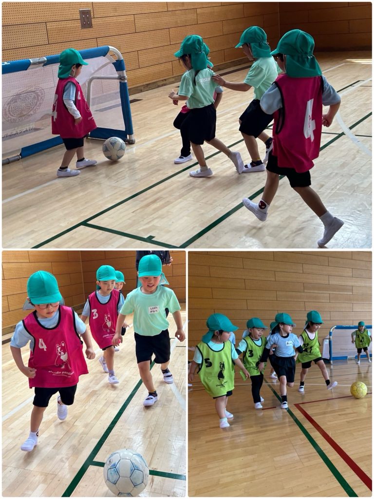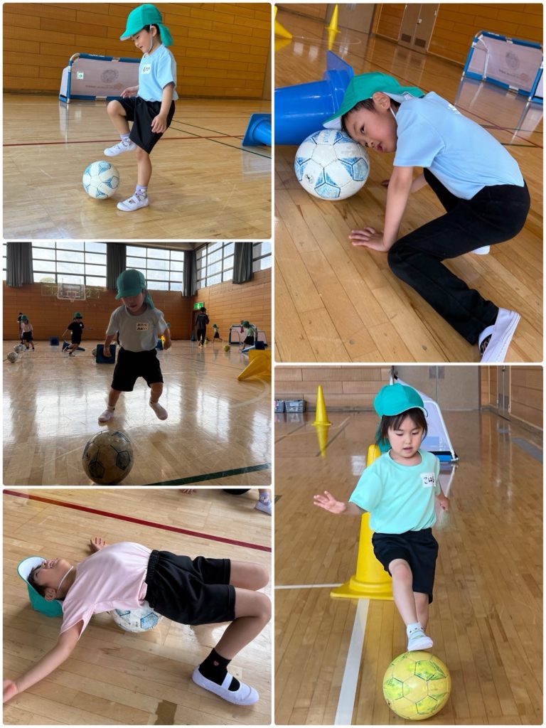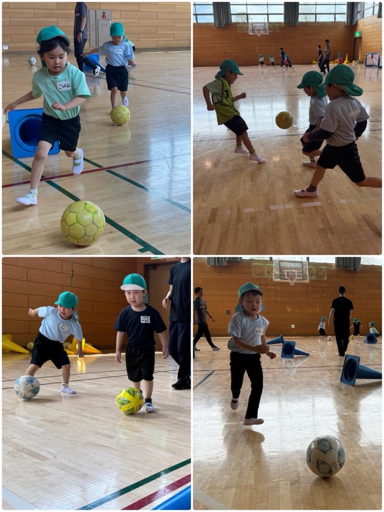 まつ組が今年初めてのホーリーホックサッカー教室に参加してきました。はじめにコーンを両足でとび越えたり、横向きで跳んだりして、ウオーミングアップ❗️その後はボールを1人1つずつ持って、ボールと仲良くなるように体のまわりをボールでタッチ⚽️いよいよ、ゲーム🥅チームに分かれて熱戦を繰り広げました!最後に元気にお礼を言いました。「楽しかった」「もっとやりたい」と言う声が聞こえました。次も頑張ろう!!